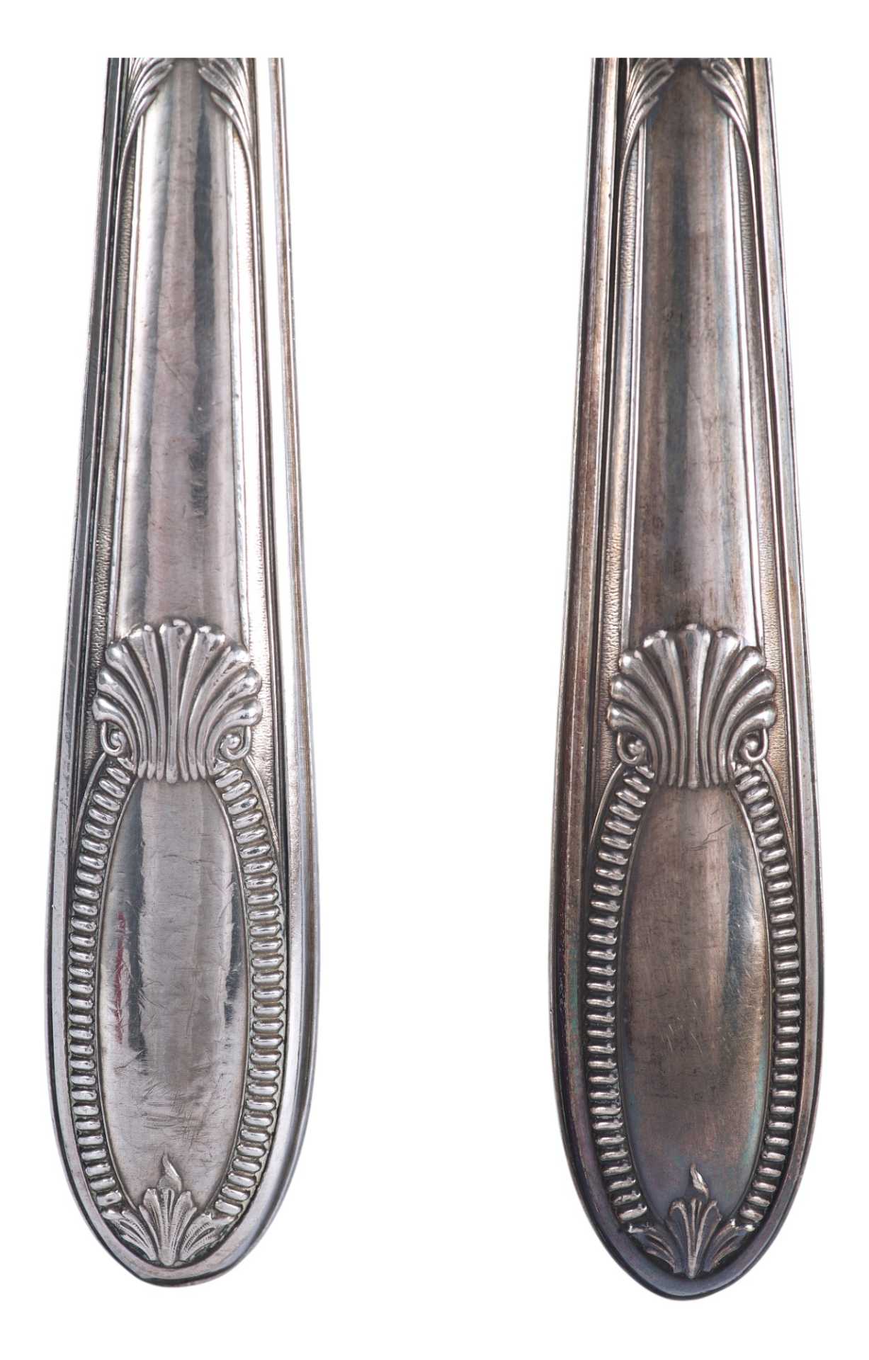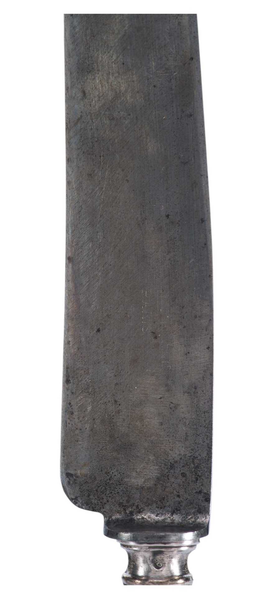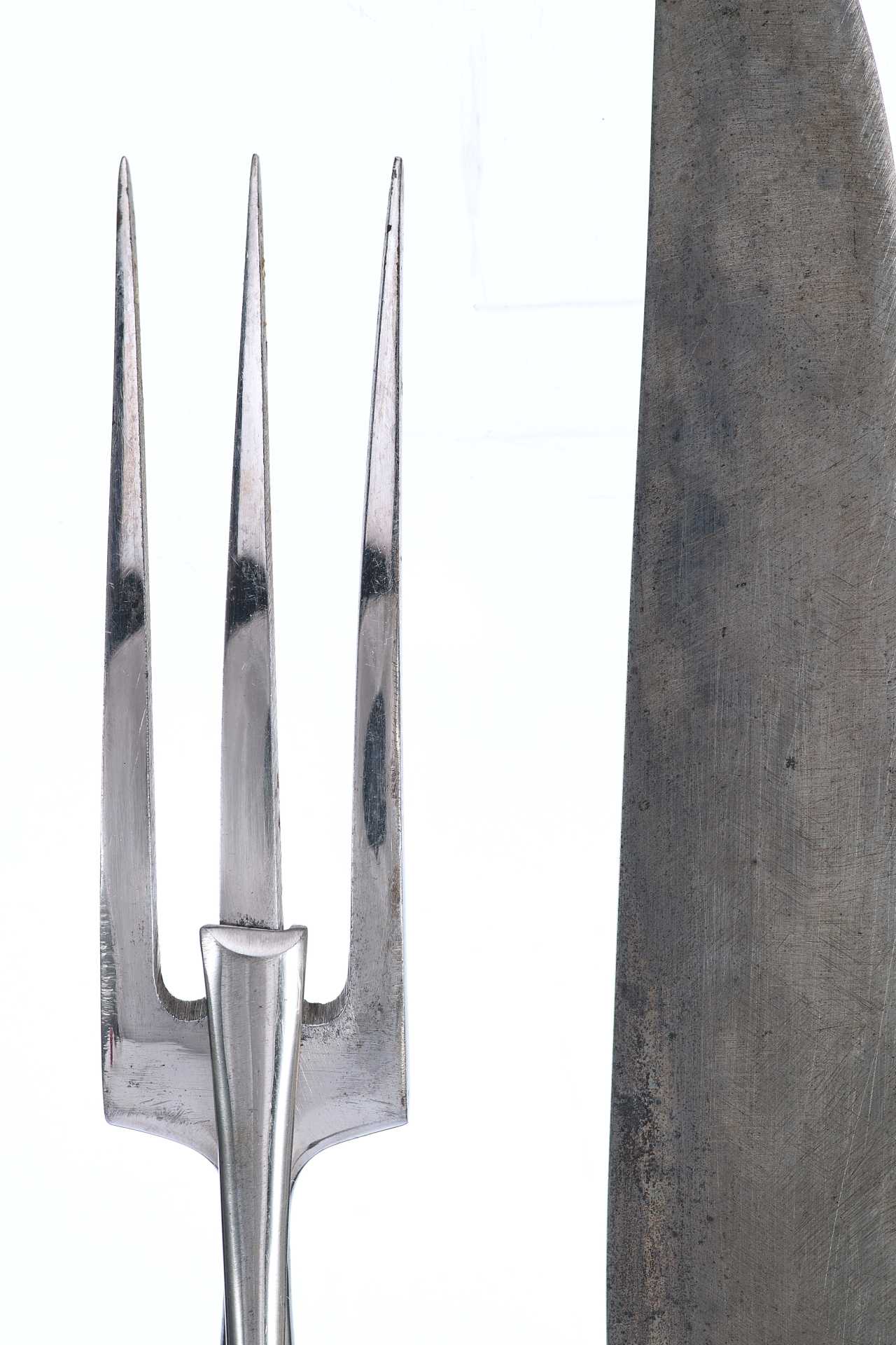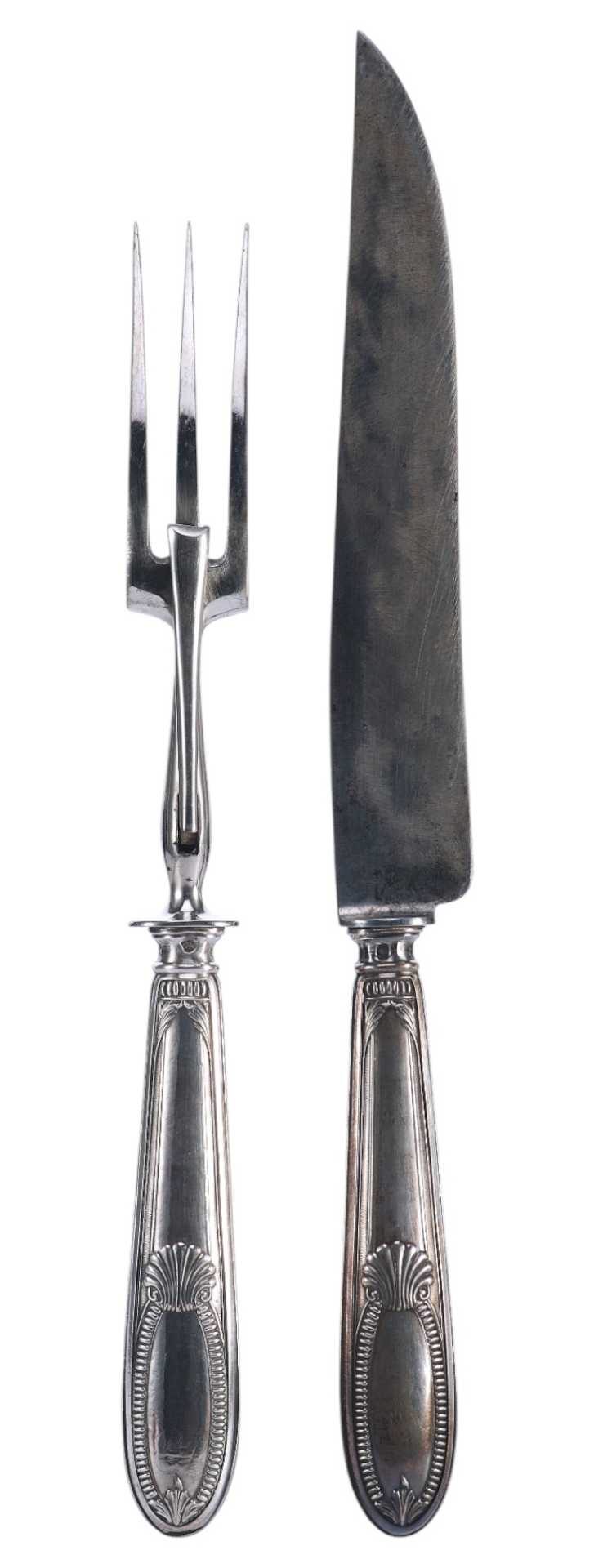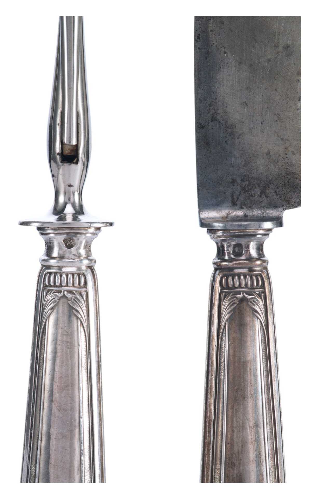 Представлен столовый набор для разделки мяса, состоящий из: вилки с фиксатором и ножа. На лезвии ножа надпись: «PARIS». На вилке овальное клеймо с надписью: «ACIER EXTRA» (Экстра сталь). Наборы столового серебра в подобных футлярах активно производились во Франции, Бельгии, Германии, Италии с конца XIX в. по первую половину ХХ в.