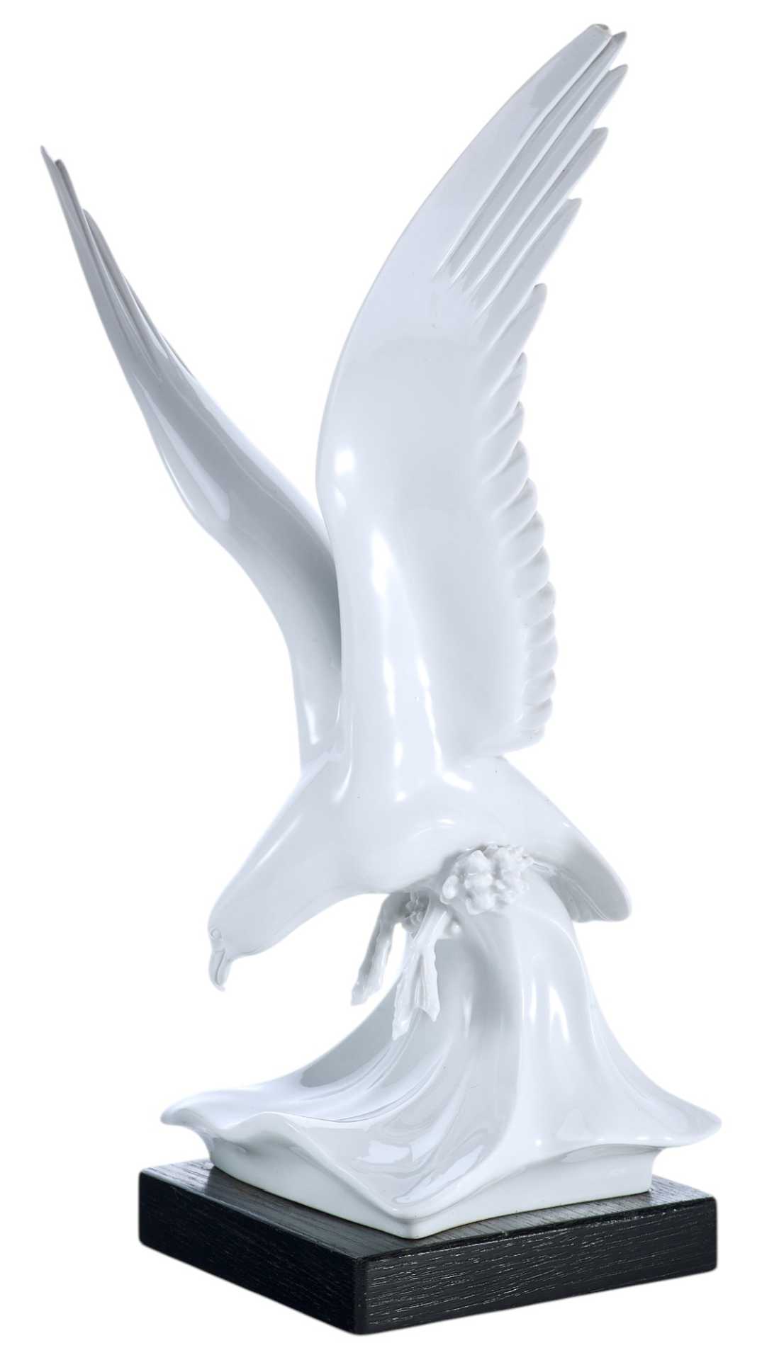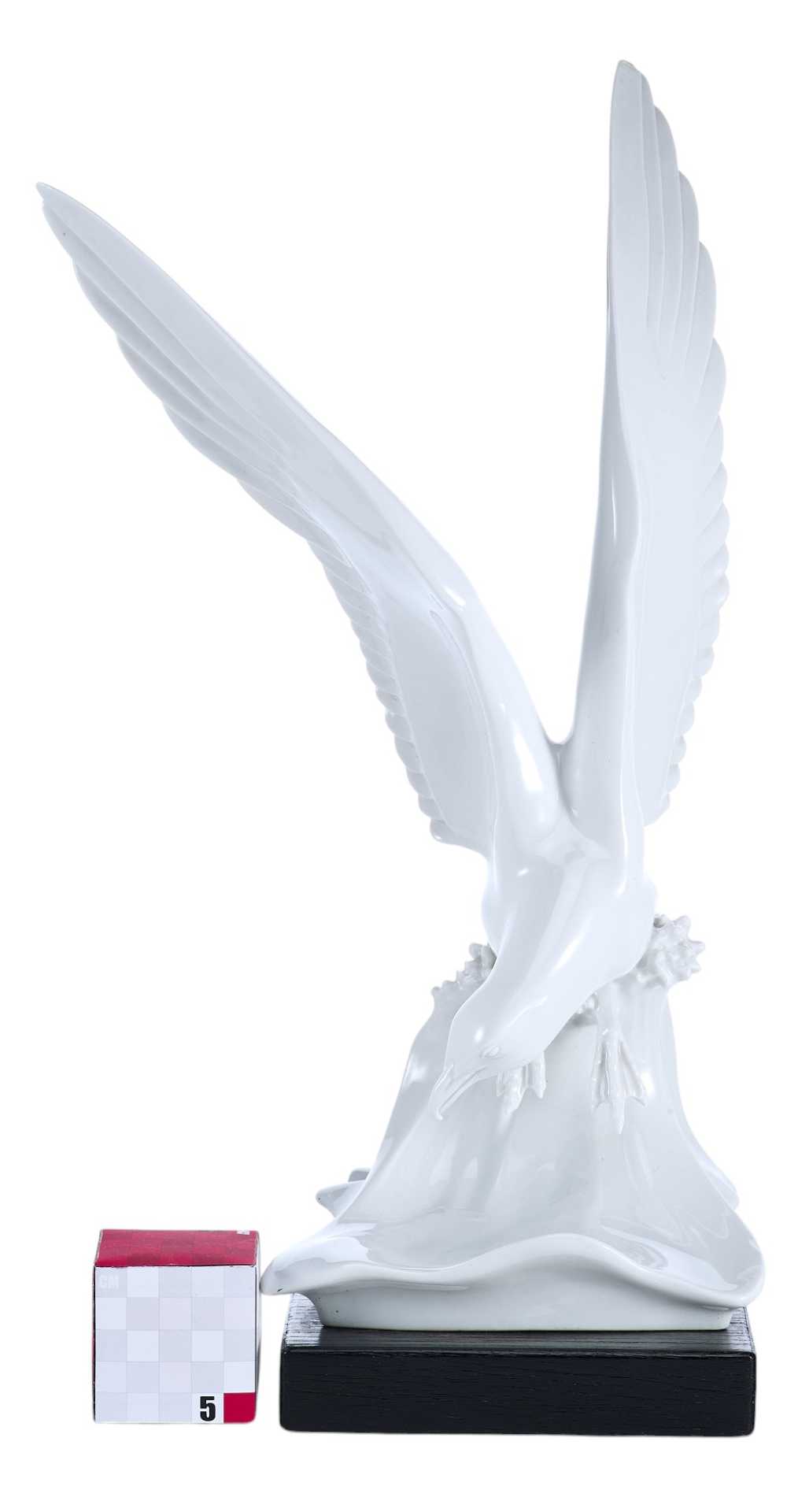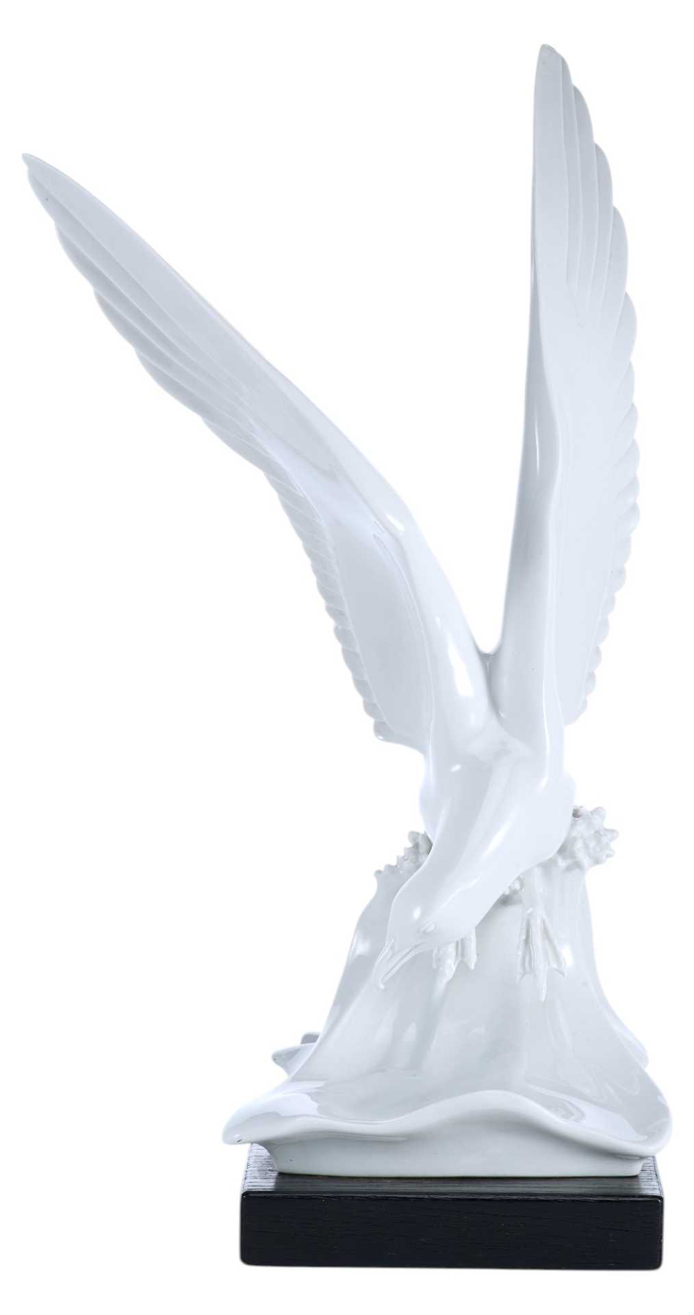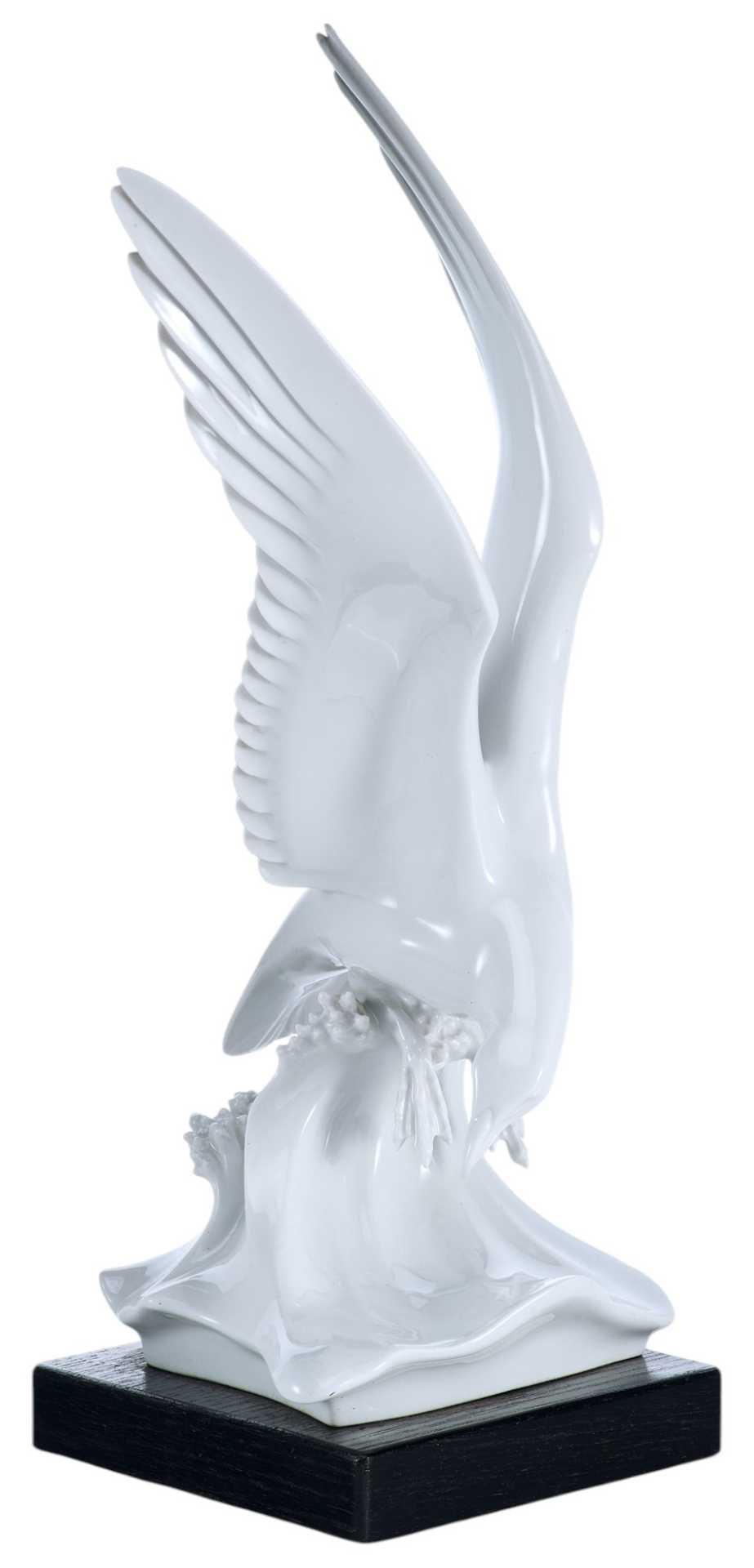 Фарфоровая скульптура чайки, садящейся на волну. Чайка - птица, ставшая романтическим символом. Ее образ восходит к народно-поэтическим представлениям о душе белой и черной, крылатой и бескрылой, живой и погибшей. Образ вольной птицы символизирует стремление человека к свободе, протест против гнетущей действительности, незащищенность страдающей личности.
