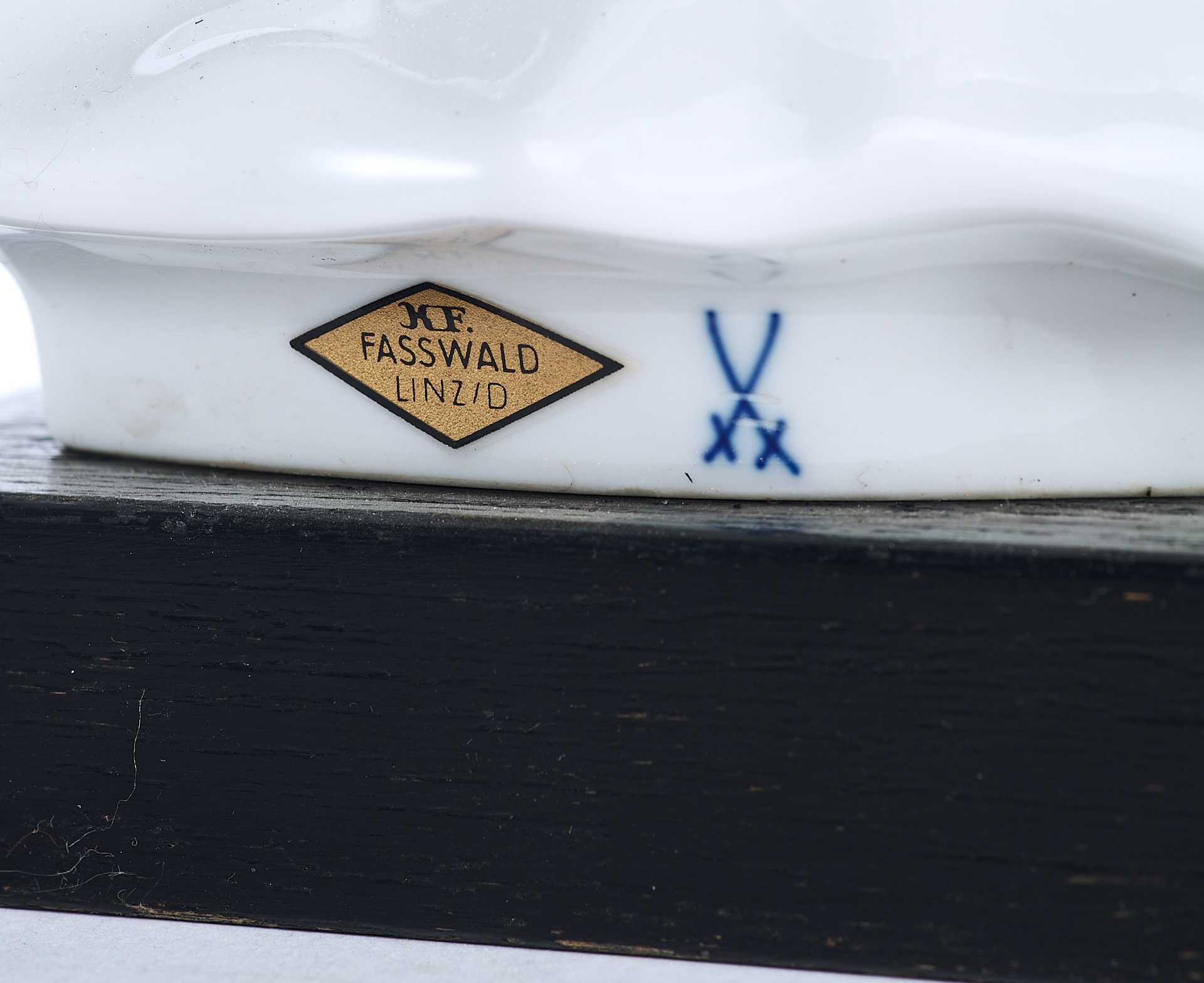 На скульптуре клеймо Мейсенской фарфоровой мануфактуры периода 1947-1973 гг., перекрещенные мечи. А также фабричная этикетка «KF.FASSWALD LINZ/D» Мейсенская фарфоровая мануфактура - марка немецкого фарфора. Название
