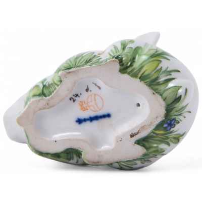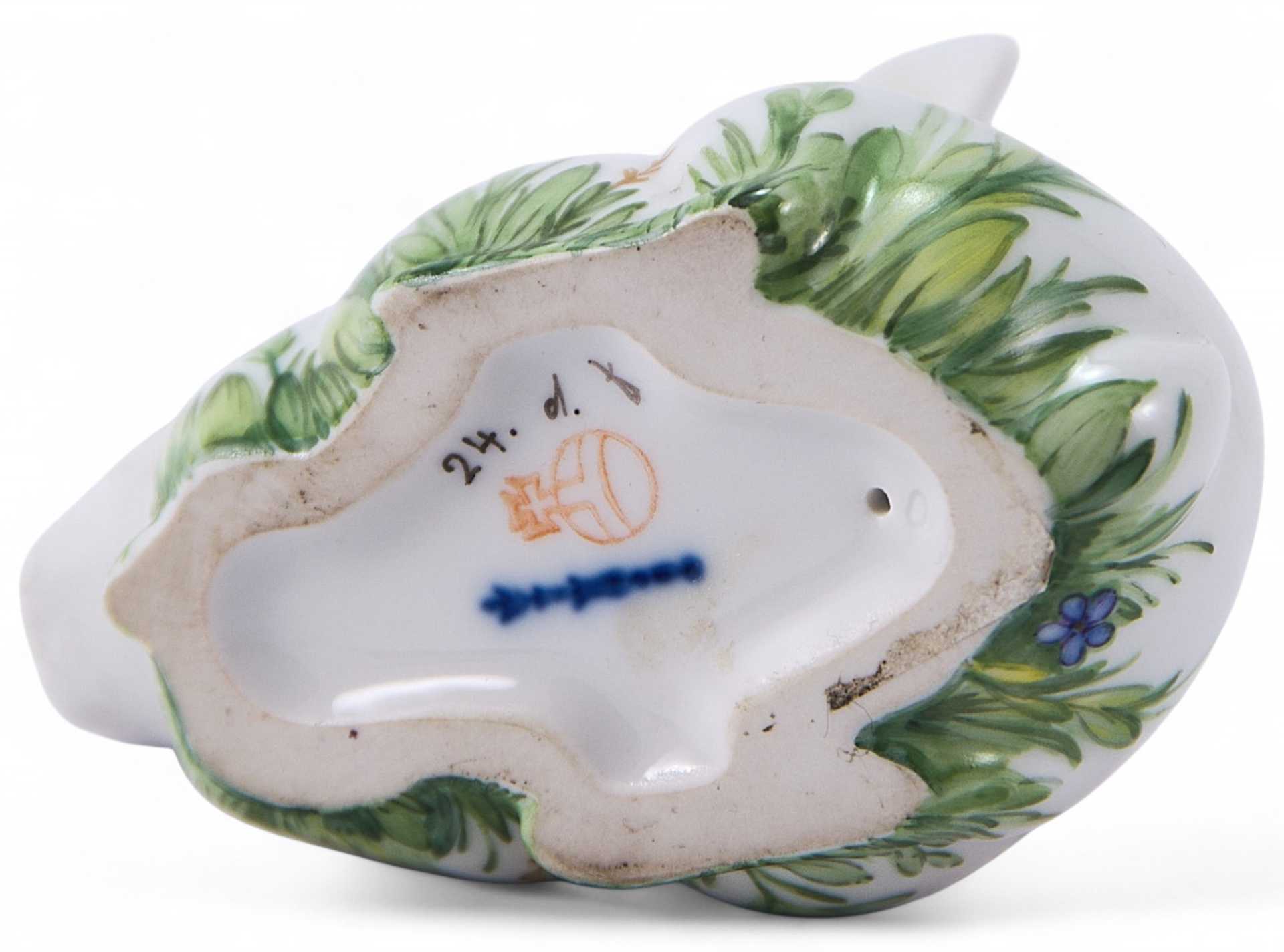 Основание скульптуры расписано вручную эмалевыми красками. На основании фигуры подглазурное клеймо Берлинской королевской фарфоровой мануфактуры периода 1992-2000 гг. в виде синего скипетра. Рядом с клеймом вручную нарисована прусская держава, имитируя тем самым клеймо более раннего периода - середины ХХв.