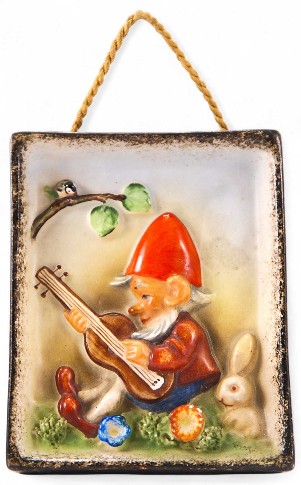 Представлена фарфоровое панно с изображением гнома в колпаке, играющего на гитаре.