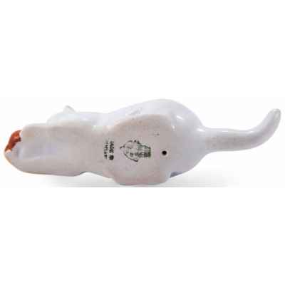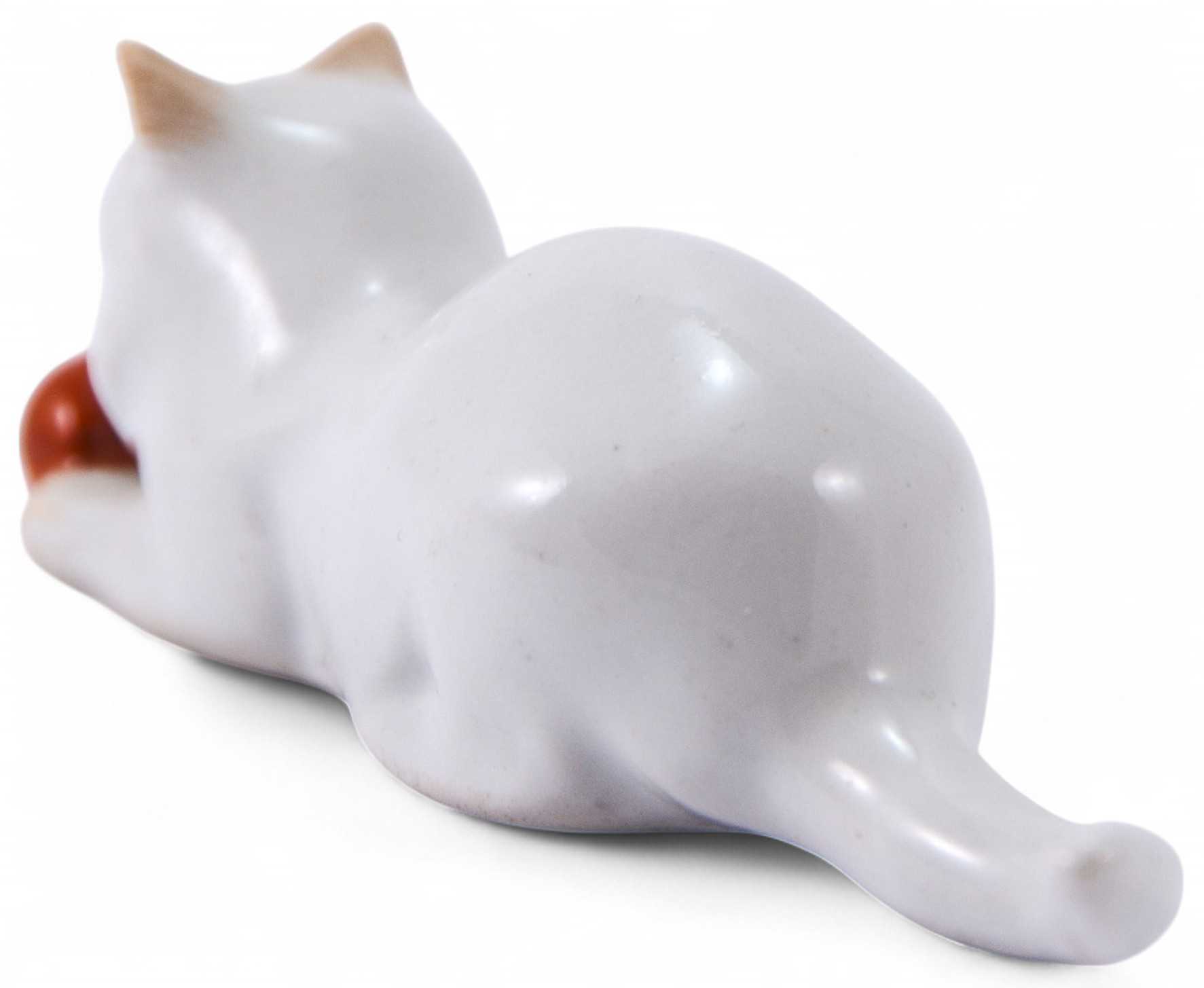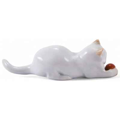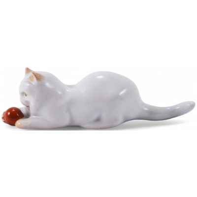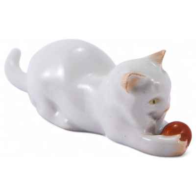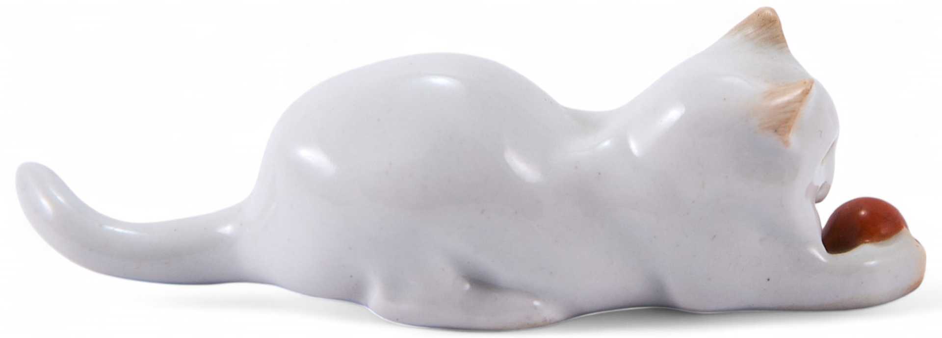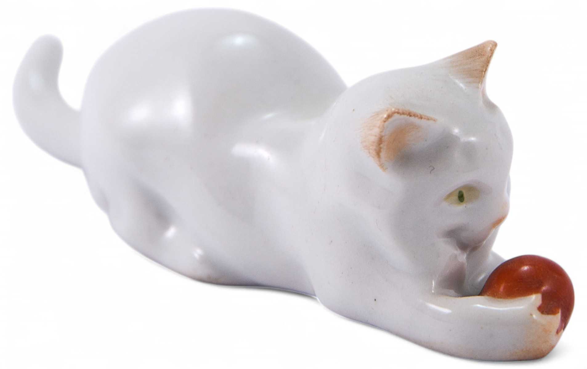 Фарфоровая скульптура кошки поймавшей красный мячик. Скульптура изготовлена на фарфоровофаянсовой фабрике Жолнаи в 1970-х гг., что подтверждается клеймом фабрики этого периода времени. Фарфорово-фаянсовая мануфактура Жолнаи была создана Миклошом Жолнаи (1800 - 1880) в Печ (Венгрия) для производства фаянса в 1853г. В 1863 году, его сын, Игнаци-Вильгельм Жолнаи (1828 - 1900) стал ее менеджером и директором через несколько лет. В тот же период был начат выпуск фарфора. Он сделал завод признанным во всем мире, демонстрируя свою инновационную продукцию на мировых ярмарках и международных выставках (в 1873 на Всемирной выставке в Вене, затем в 1878 на Всемирной выставке в Париже, где получил Гран-При). С 1893 года было введено производство фарфоровых предметов покрытых ирризированной глазурью (люстром). К 1914 году, Жолнаи была крупнейшей компанией по производству фарфоровых и керамических изделий в Австро-Венгрии. Во время Первой мировой войны завод изготовлял продукцию для использования в военных целях, например, изоляторы. После Первой мировой войны производительность завода снизилась в связи с сербской