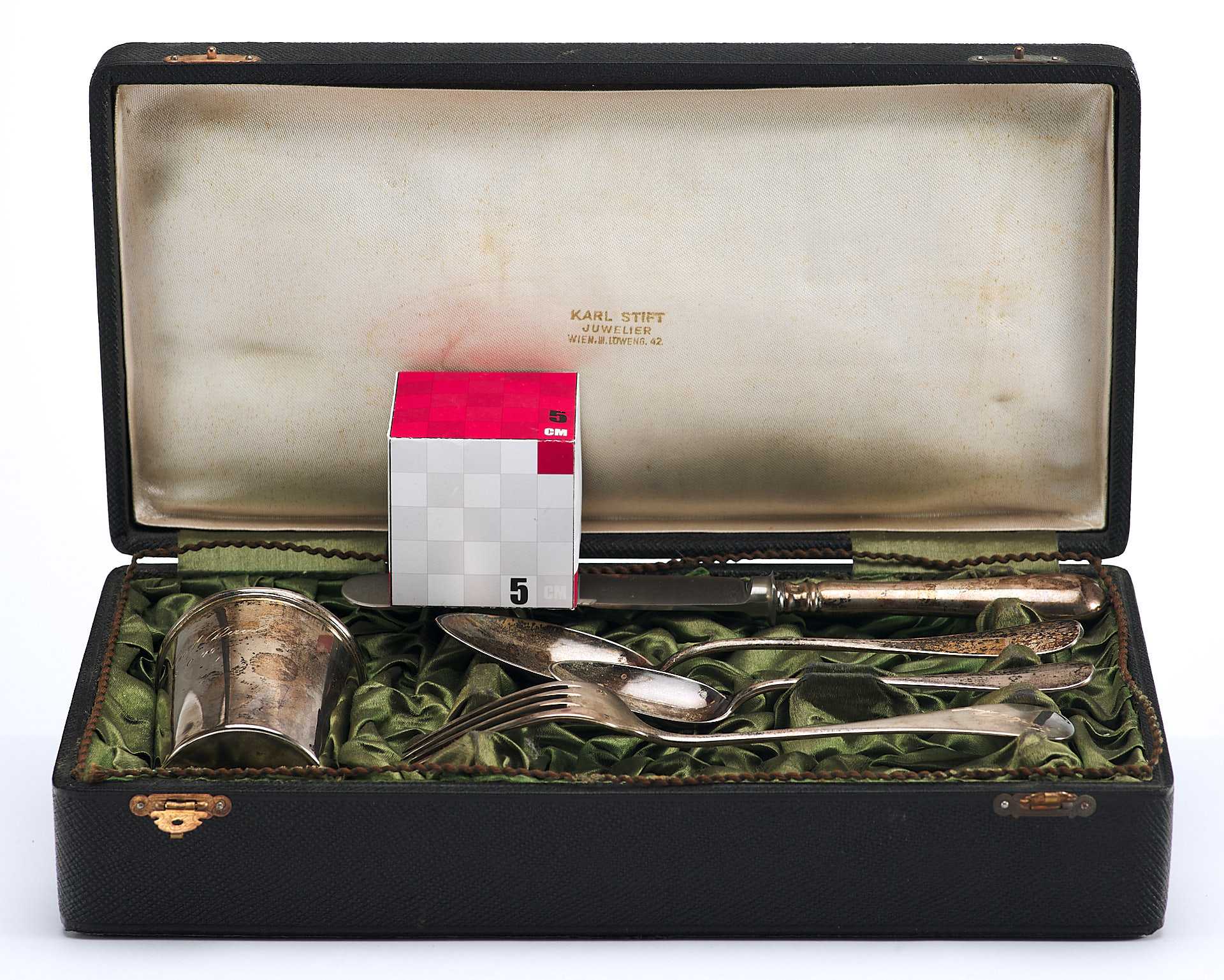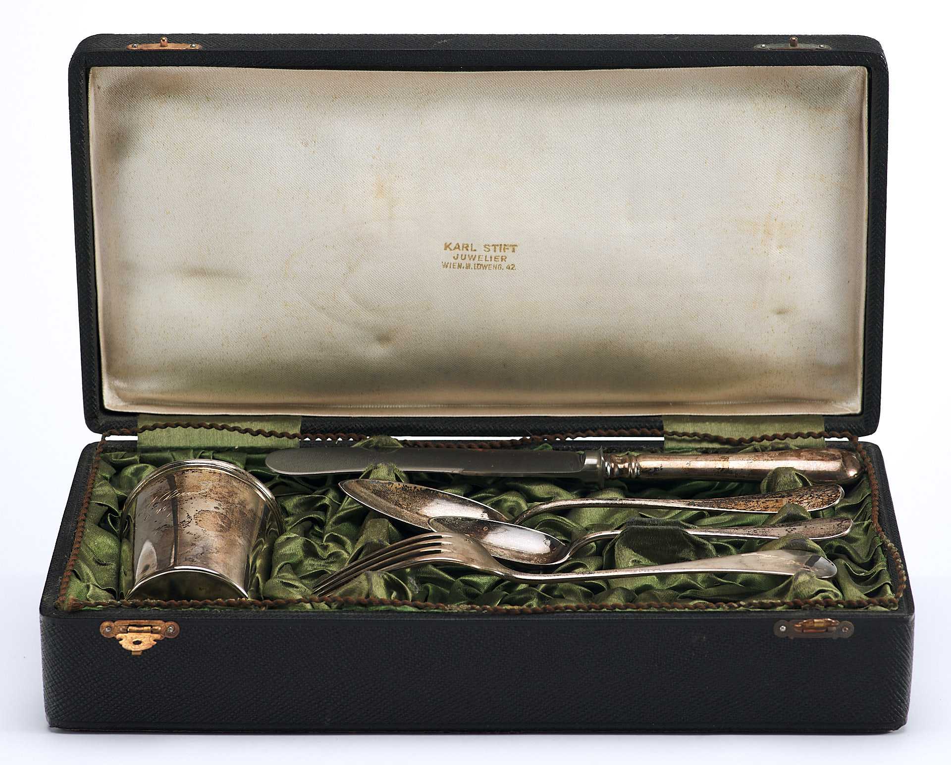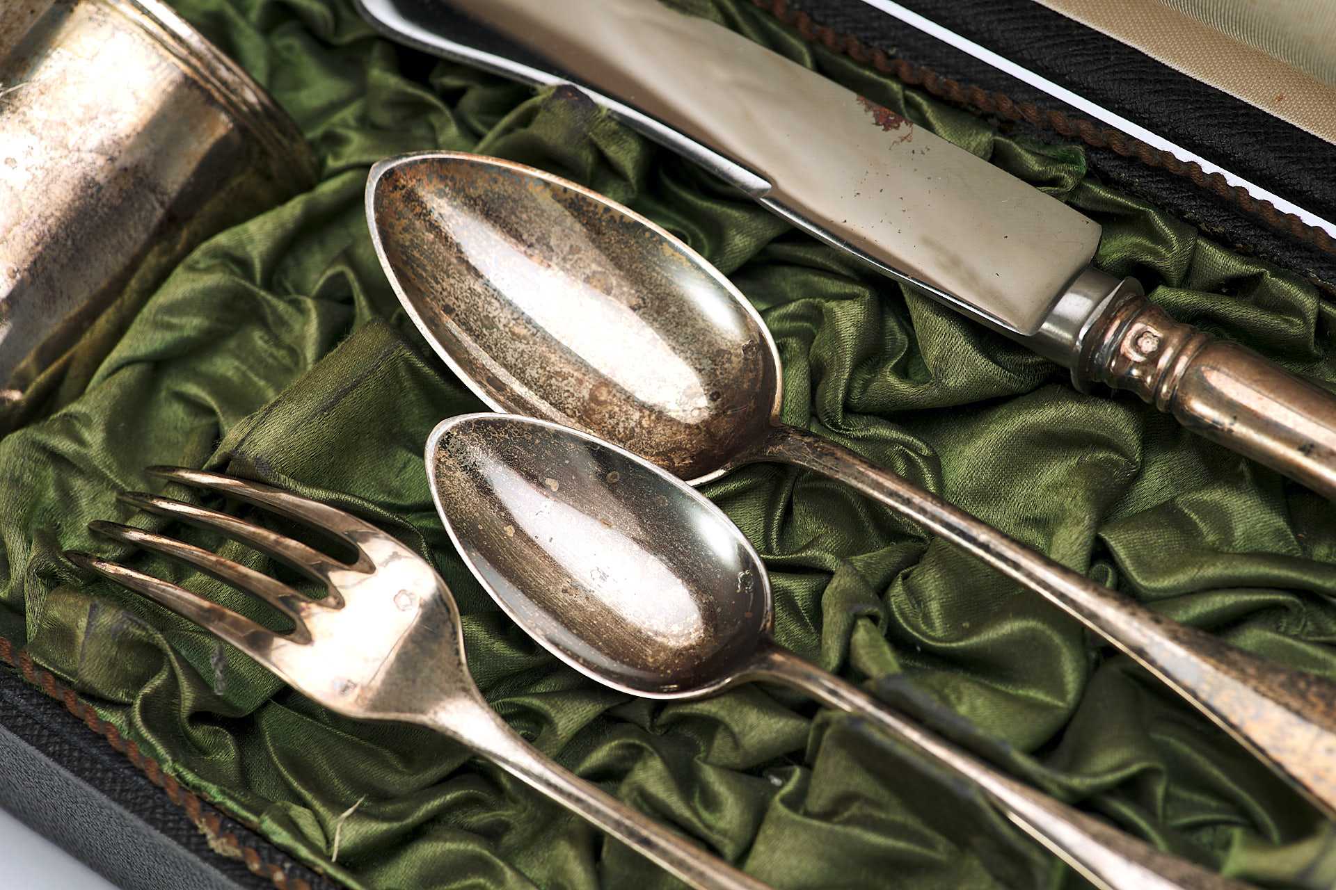 Представлен индивидуальный набор столовых приборов, состоящий из стакана, столовой и чайной ложек, ножа и вилки, в оригинальном футляре.