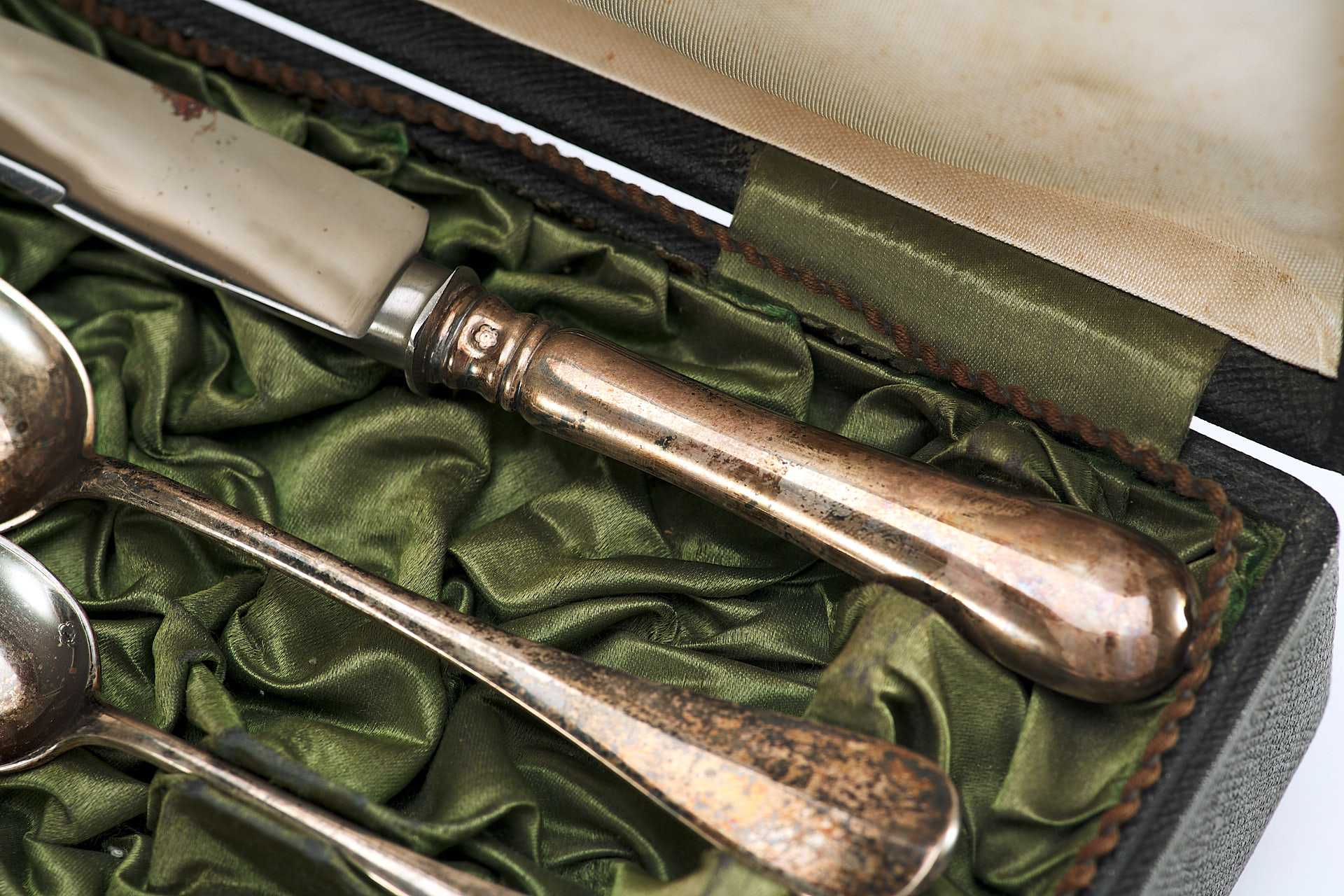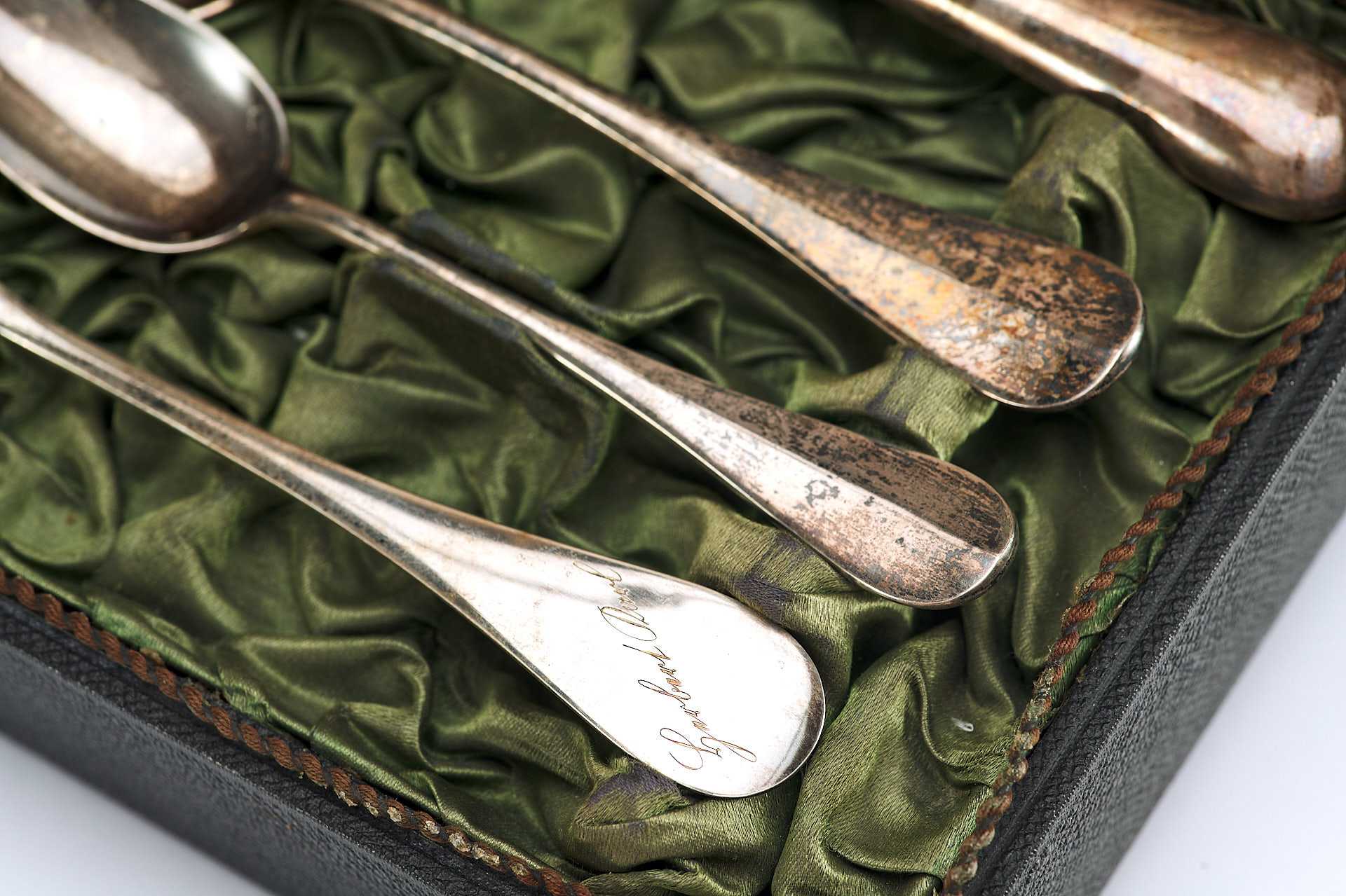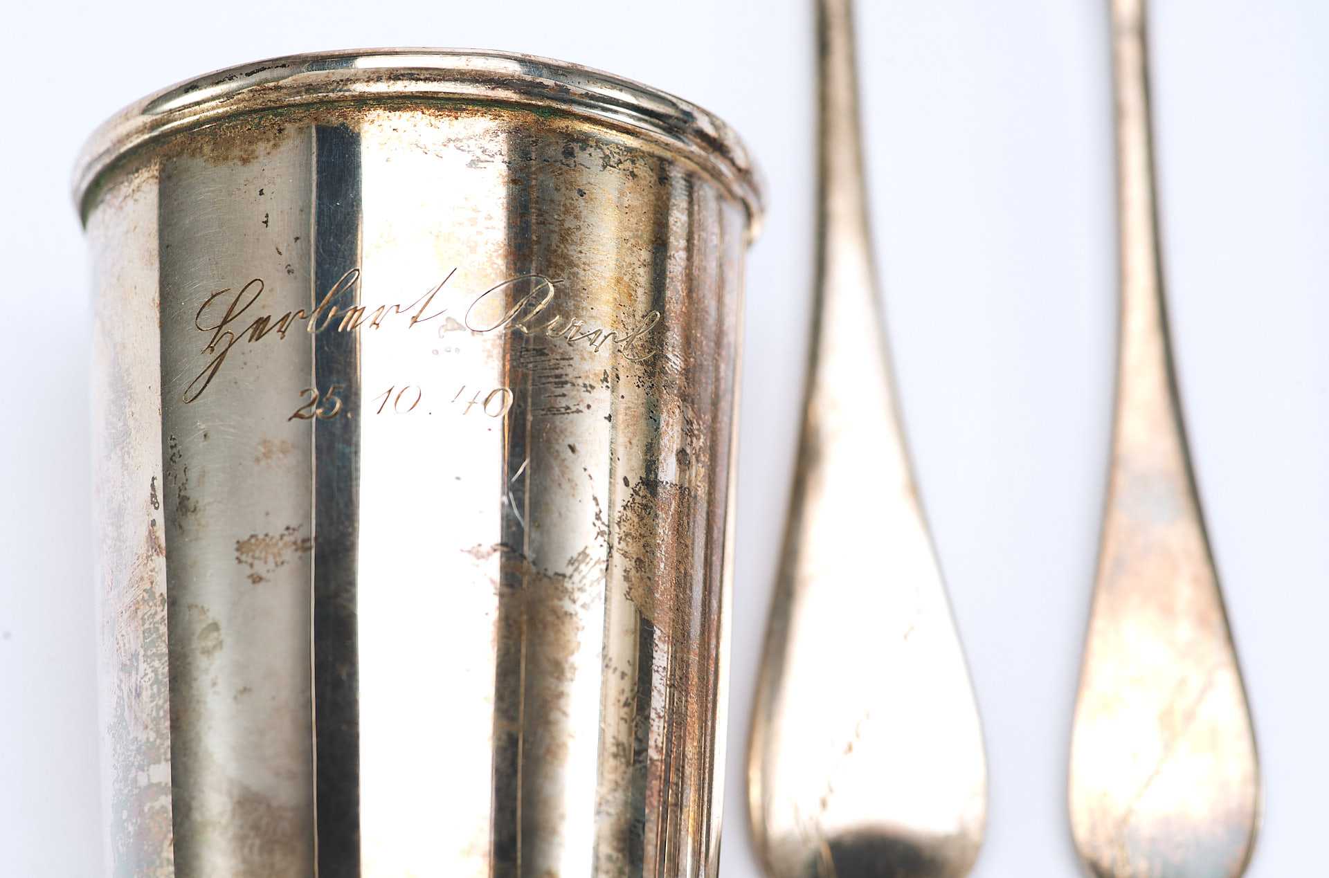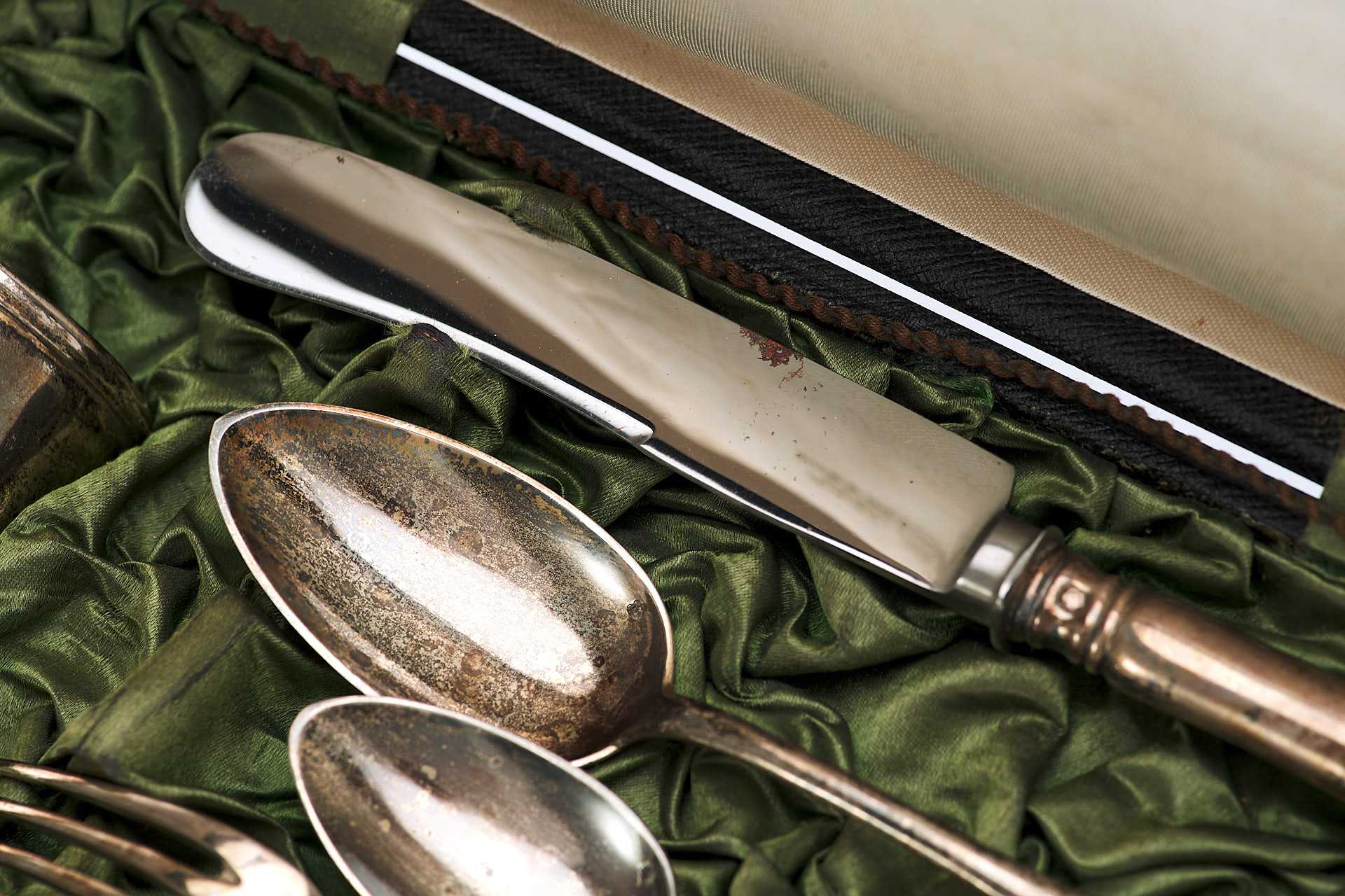 Представлен индивидуальный набор столовых приборов, состоящий из стакана, столовой и чайной ложек, ножа и вилки, в оригинальном футляре.