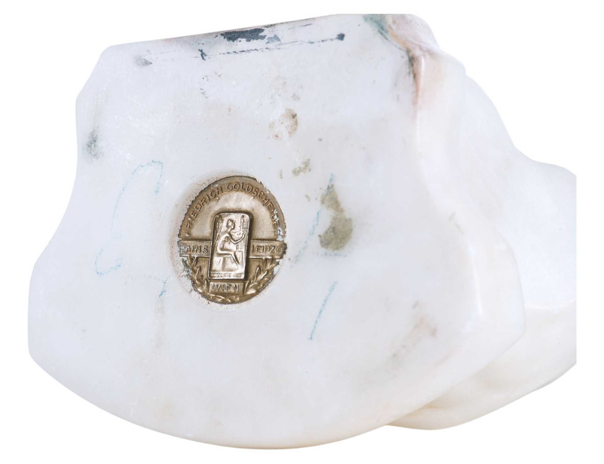 На основании скульптуры имеется вставленный бронзовый медальон с клеймом керамического скульптурного ателье Ф. Голдшейдера и названием городов: Paris, Leipzig, Wien (города, в которых функционировали Мраморные и алебастровые бюсты изготавливались скульпторами, сотрудничавшими с фирмой Фридриха Голдшейдера.