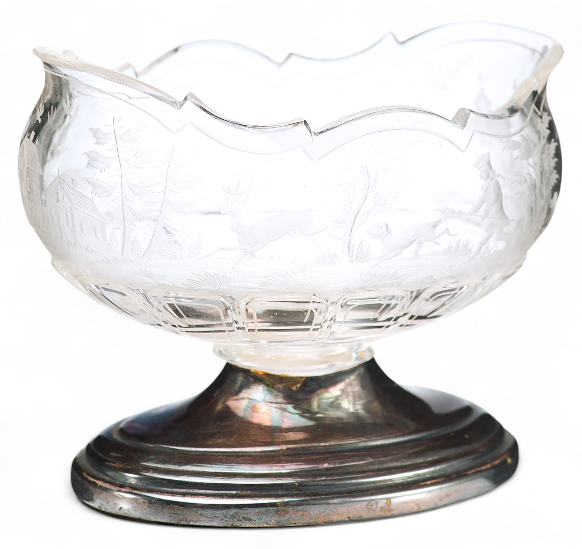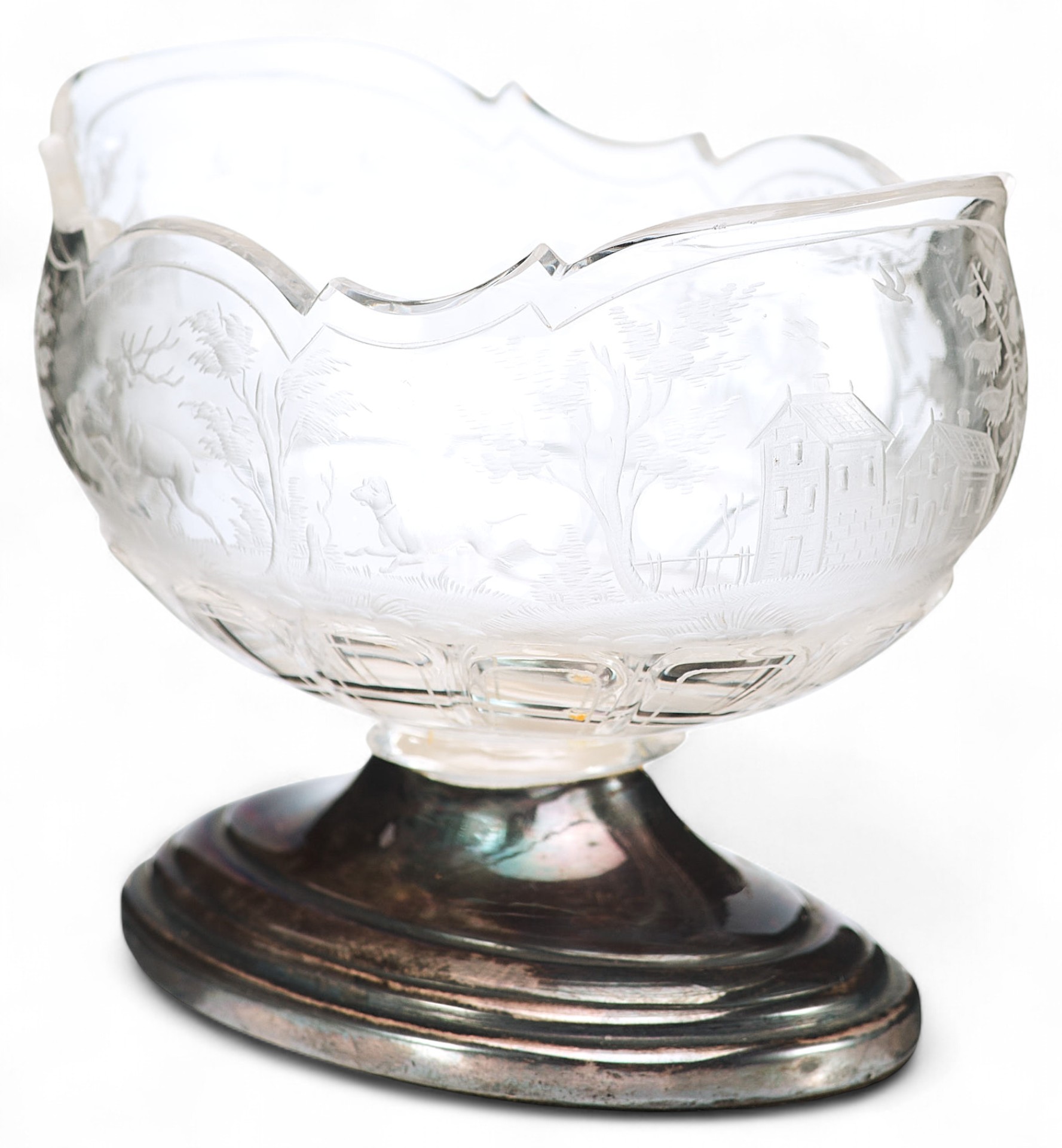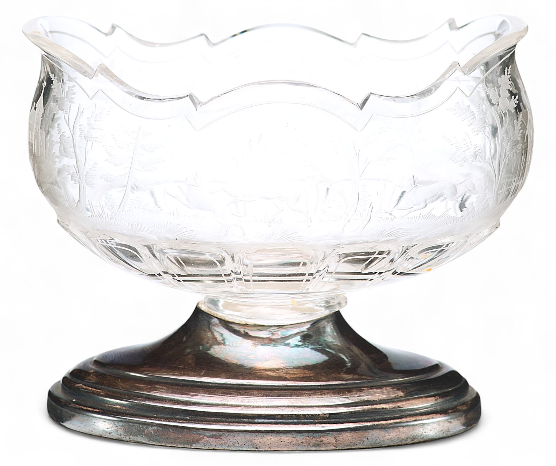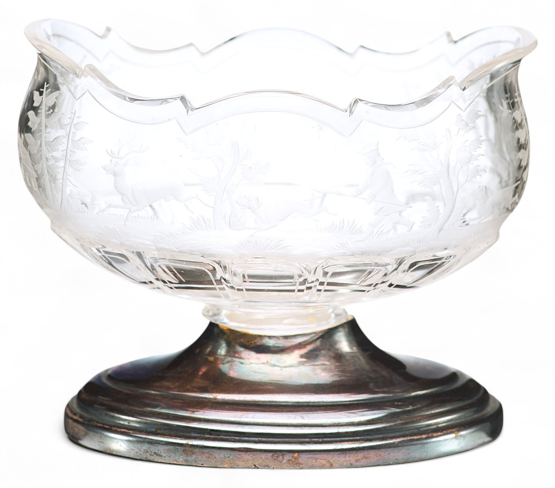 Стеклянная вазочка с металлическим основанием в необарочном стиле. Ваза украшена гравированным травленым рисунком изображающим сцену охоты.