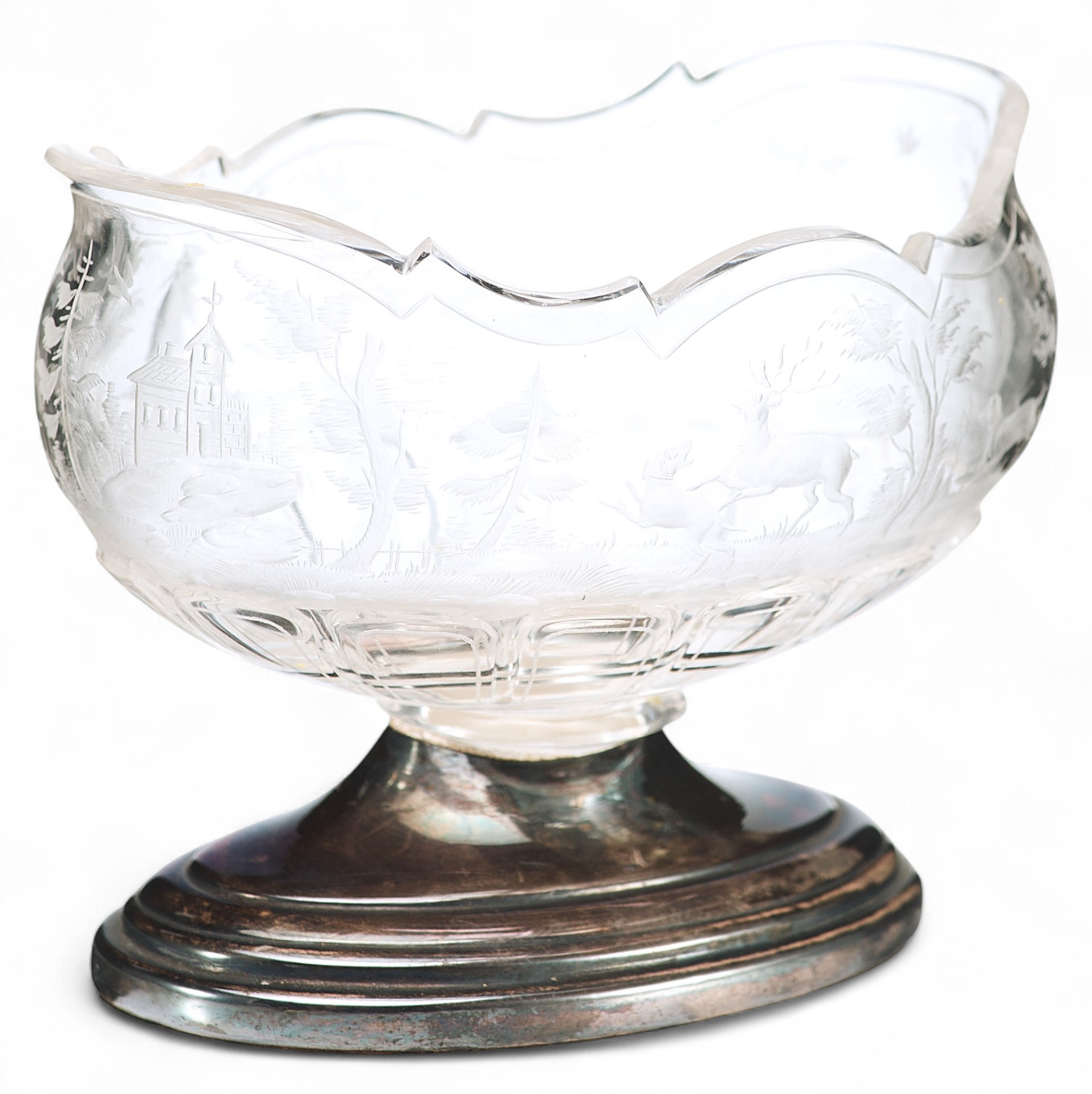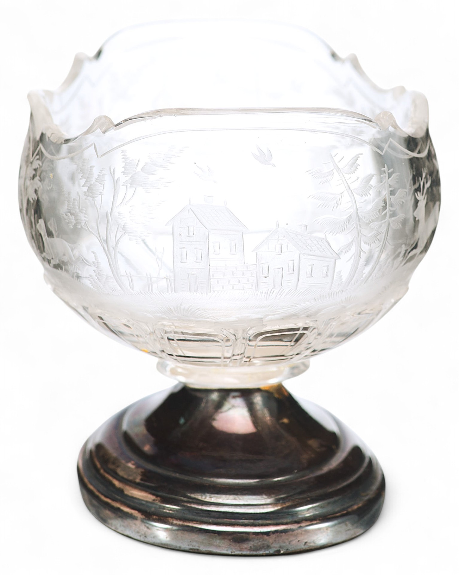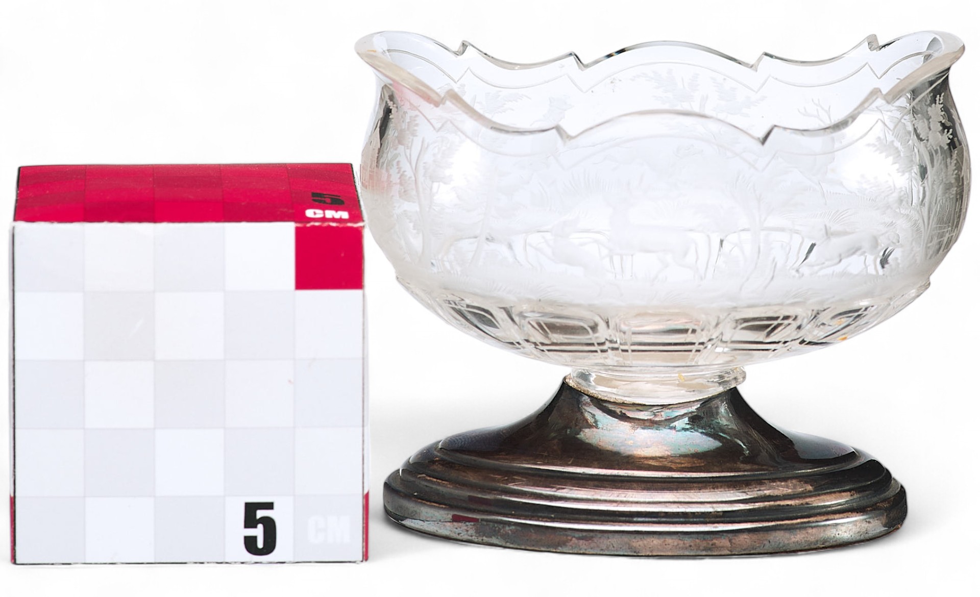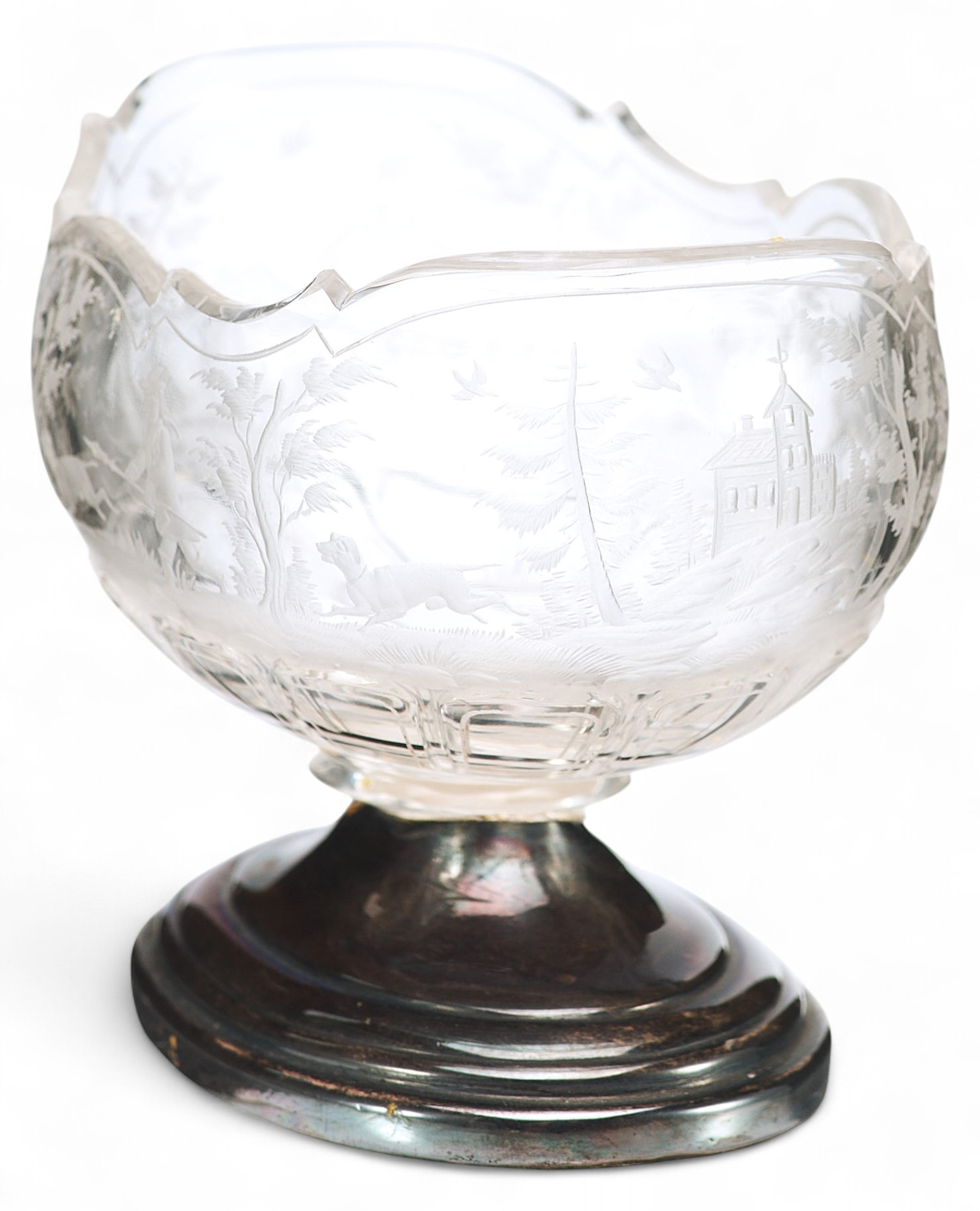 Стеклянная вазочка с металлическим основанием в необарочном стиле. Ваза украшена гравированным травленым рисунком изображающим сцену охоты.