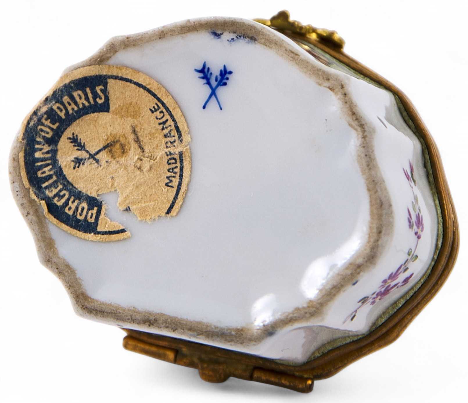 Представлена шкатулка неправильной формы. Тулово шкатулки украшено латунными накладками с рокайльными элементами. Возможно, это футляр для небольшого подарка даме, или бонбоньерка для хранения леденцов или таблеток. Художественное оформление предмета соответствует принципам стиля рококо. На дне шкатулки голубое клеймо в виде перекрещенных стрел. Подобное клеймение осуществлялось в период с 1939 до 1963 года.