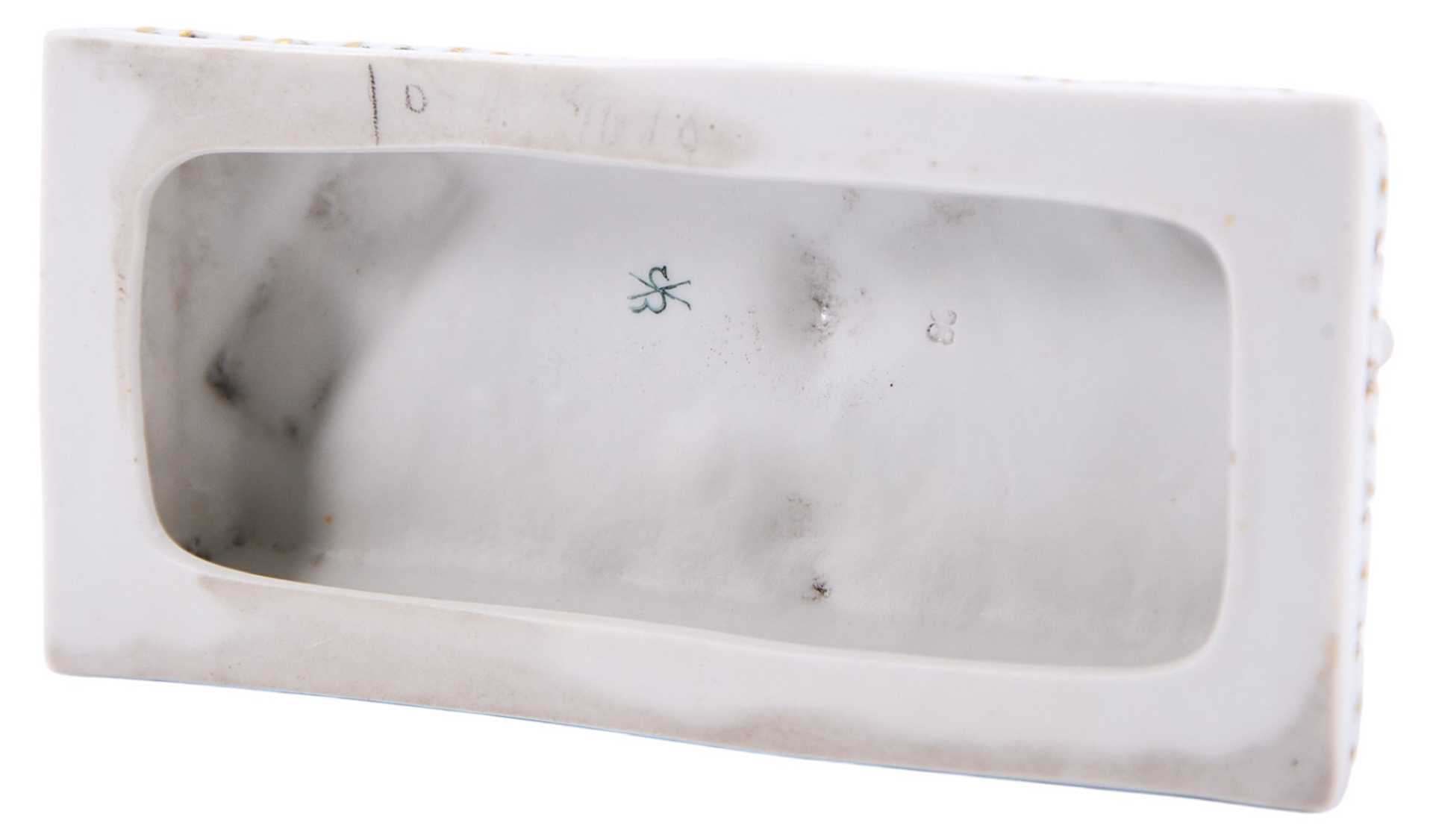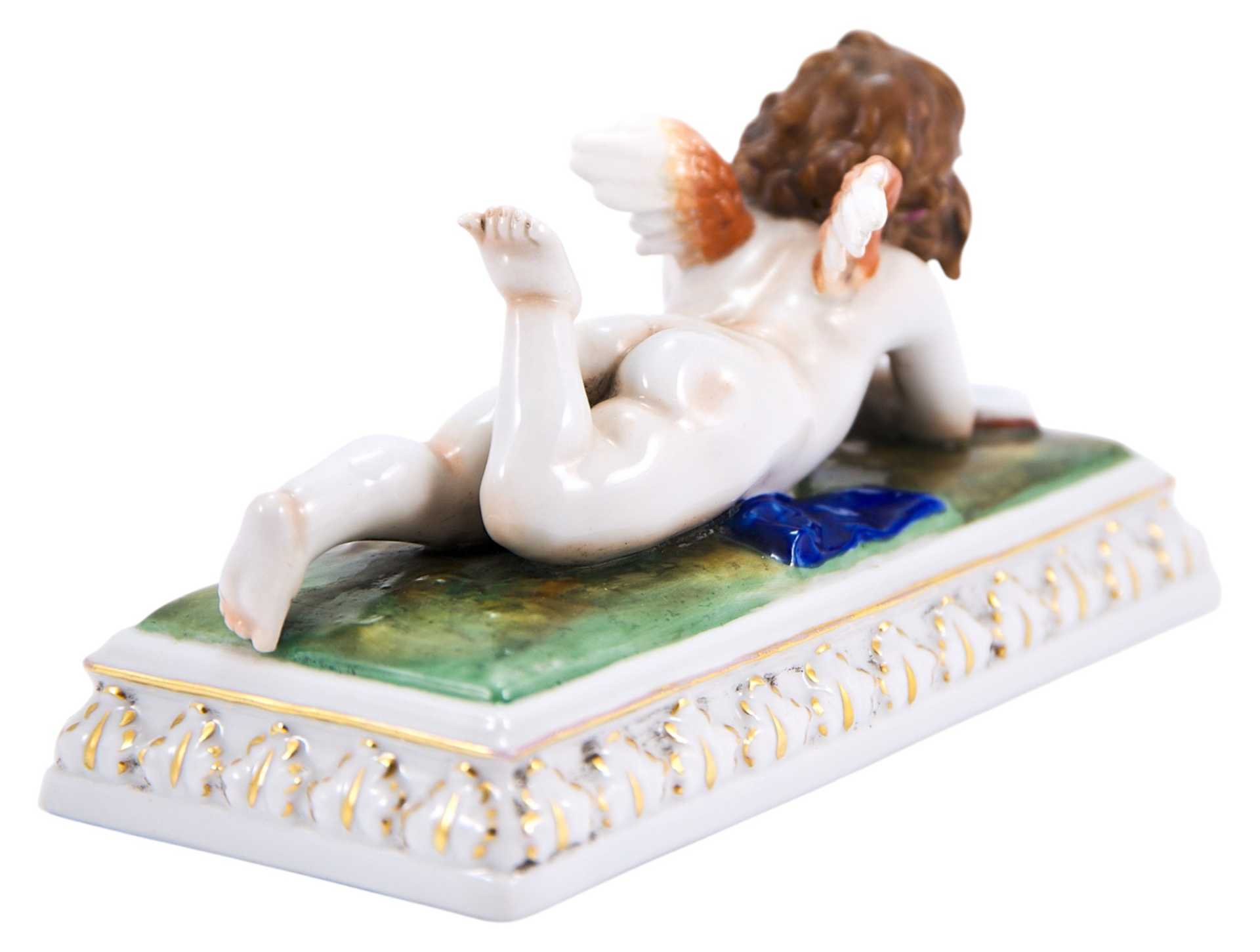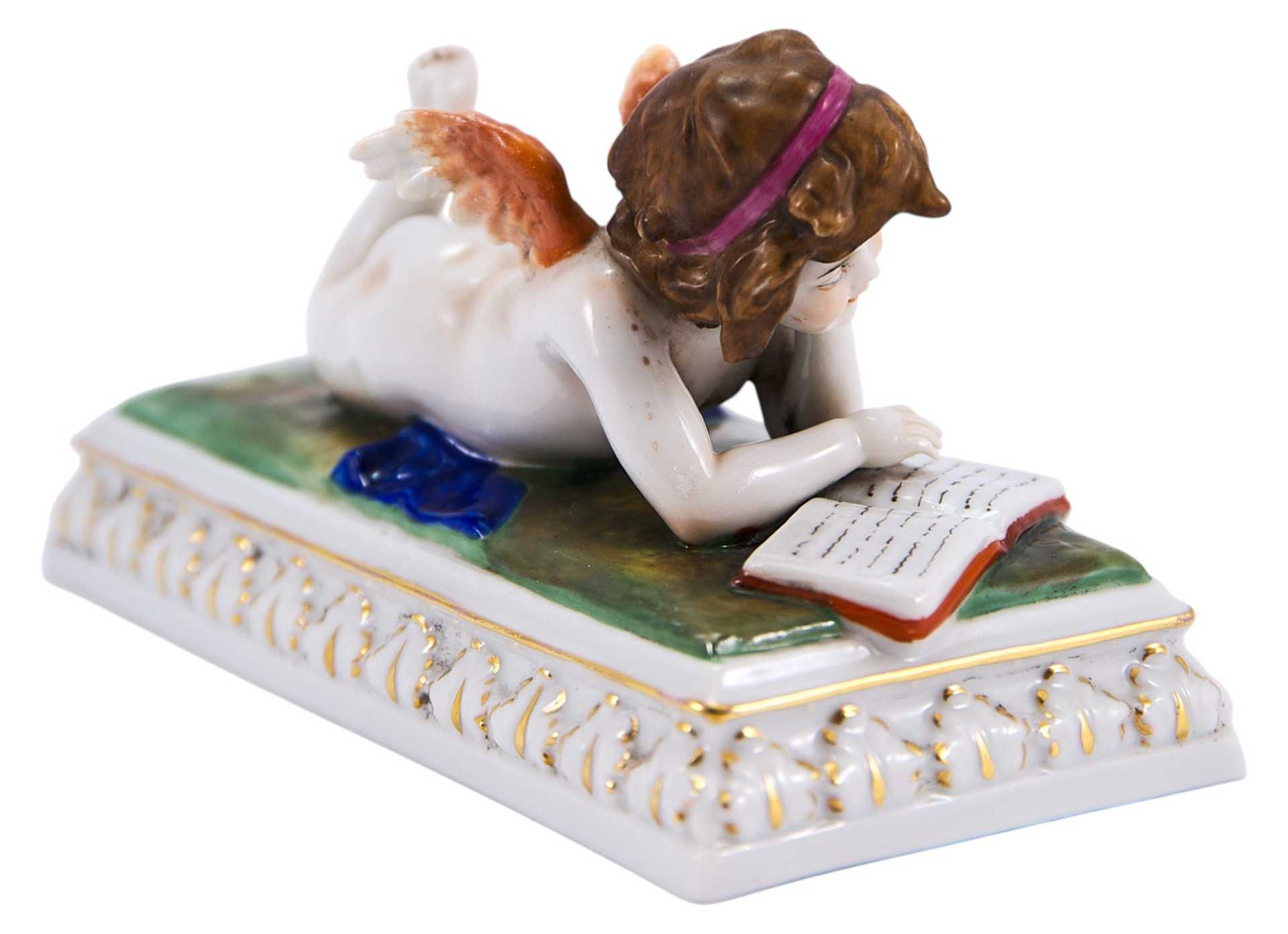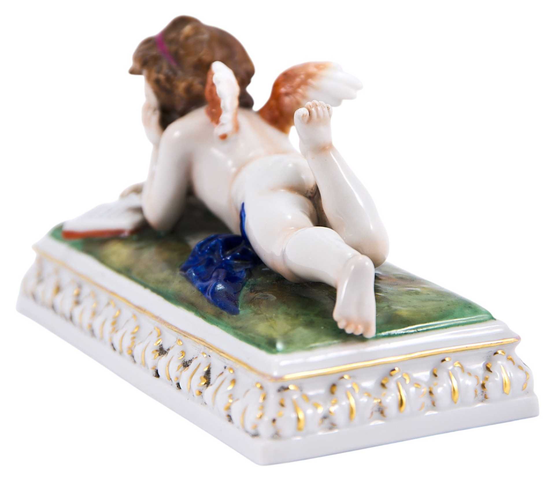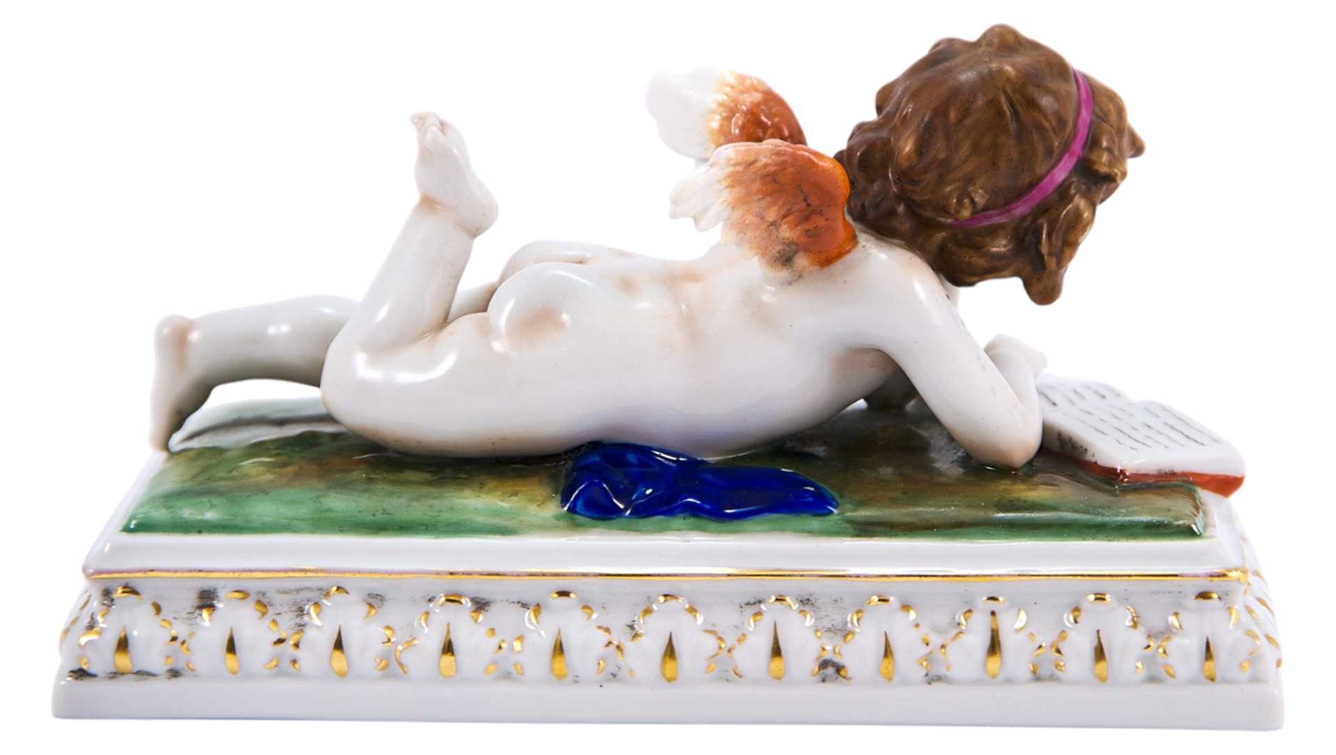 Пресс-бювар, в виде лежащего Амура, читающего книгу. На основании скульптуры клеймо фарфорового завода Шайбе-Альсбах, ставившееся с 1925 по 1972 гг. Фабрика Шайбе-Альсбах (Шайбэ-Альсбах, Scheibe-Alsbach) Основана в Тюрингии в 1835 г. Людвигом Оелсом (Ludwig Oels) и уже через несколько десятилетий приобрела мировую известность: с 1857 года она широко известна как первая тюрингская фабрика, изготовляющая фигуры большого размера (в основном религиозного толка - Мадонн) , надгробий, а также бюсты известных поэтов и композиторов, анималистические композиции и изделия в стиле Рококо и Бидермайер.
