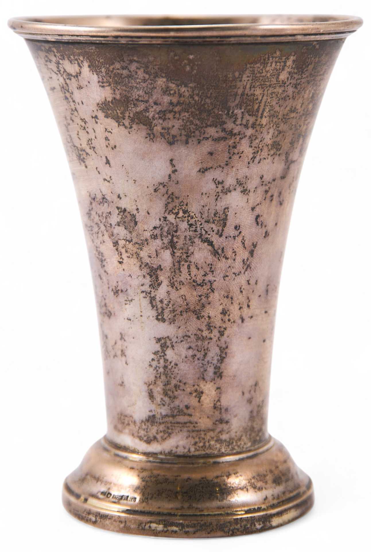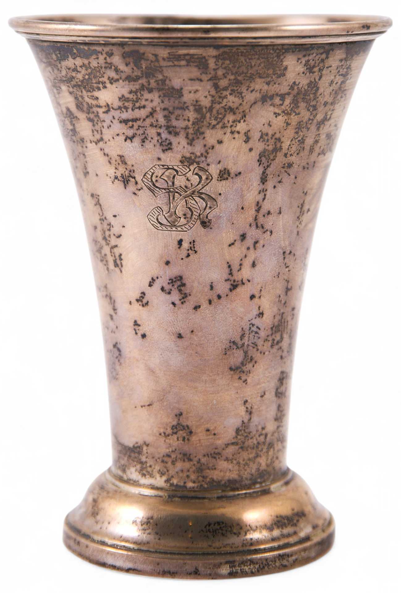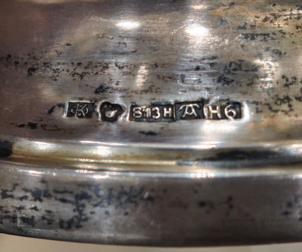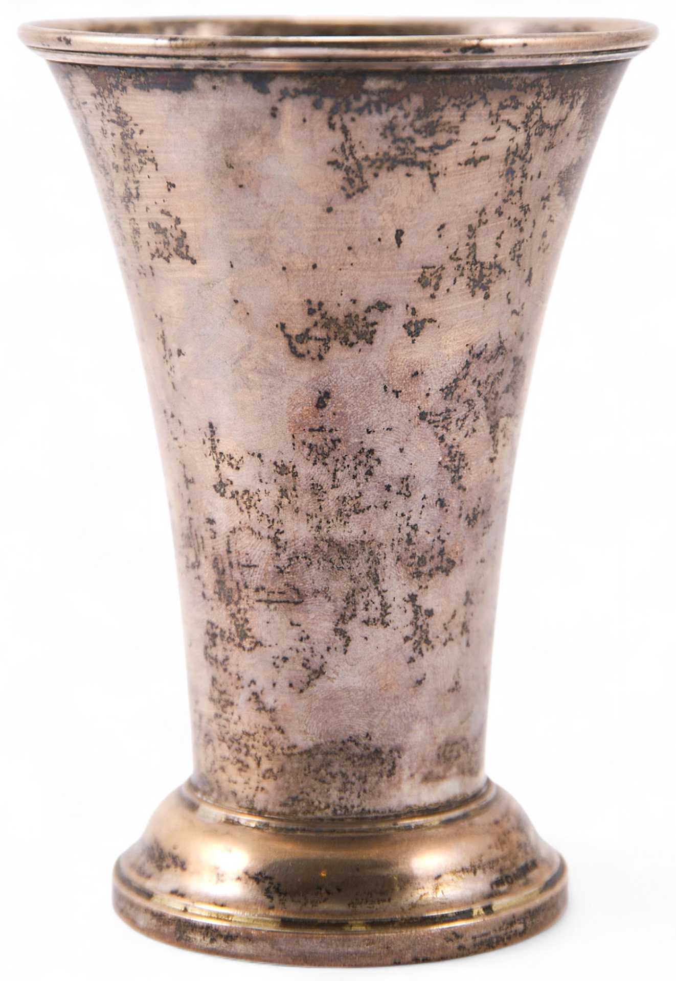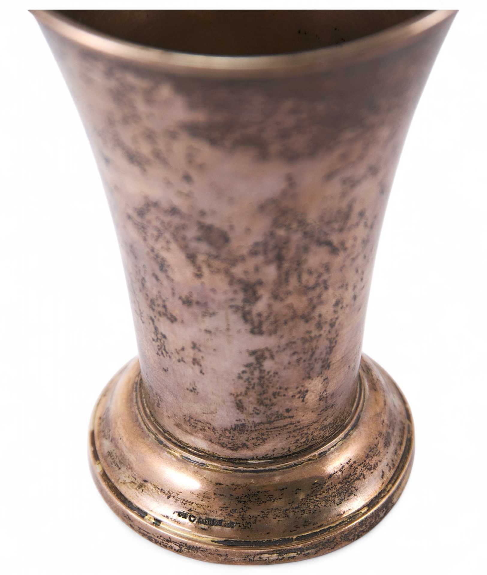 Представленный предмет кубок классической формы с расширением кверху, выполненный из серебра 813-й пробы. Декор отсутствует, поверхность гладкая. Кубок отличается строгостью и простотой исполнения, выполнен на хорошем техническом уровне.