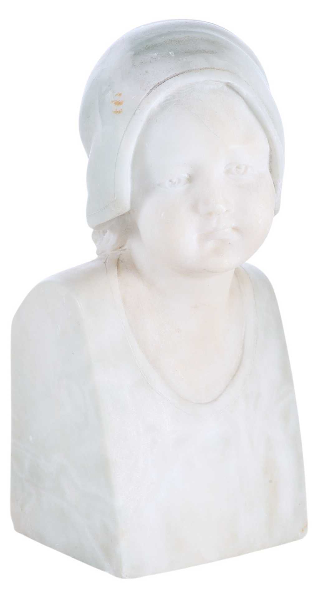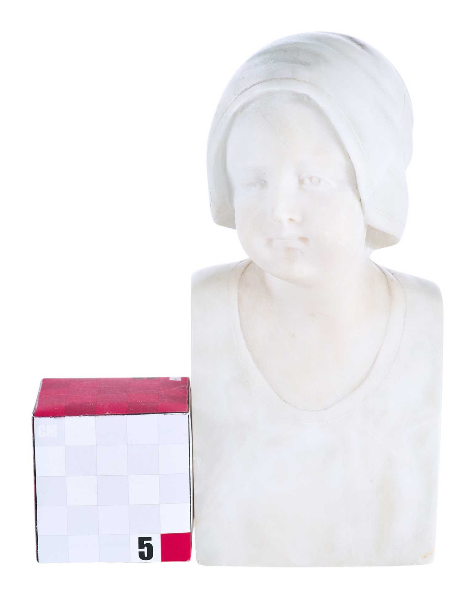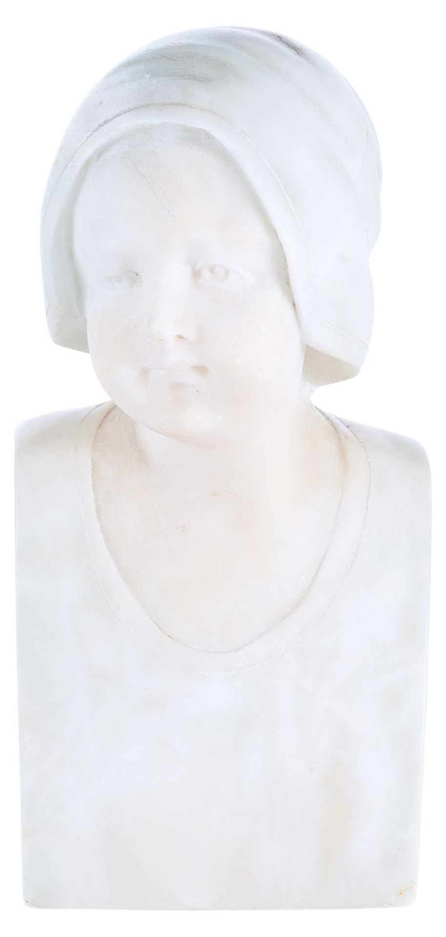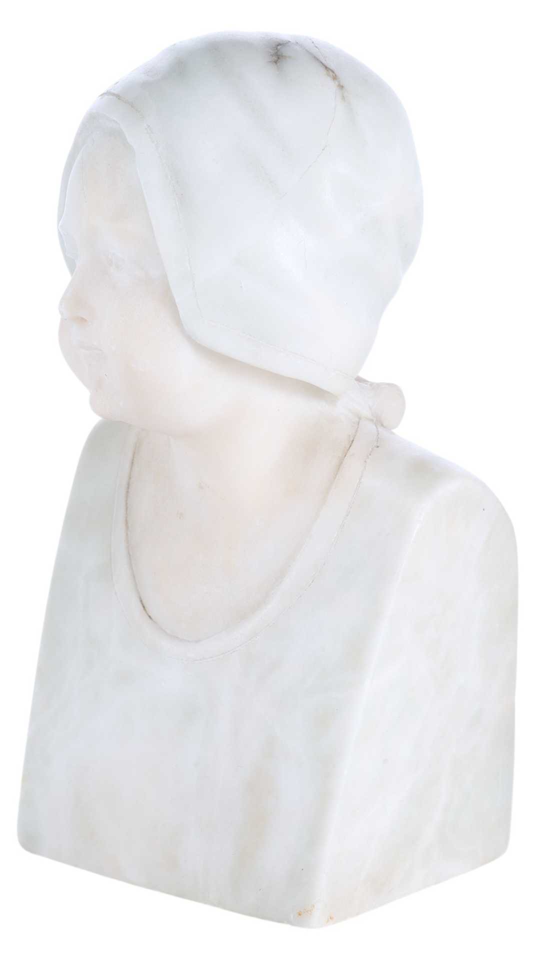 Бюст маленькой девочки вырезанный вручную из алебастра. На голове девочки чепчик. Алебастр как камень (кальцит) мягкий, прозрачный, блестящий и как бы расплывчатый пригоден для мелкой скульптуры, для тонкой обработки поверхности, хотя может быть пригоден и для крупных статуй. Алебастр использовался как материал скульптуры в очень древние времена в Месопотамии — в алебастре выполнены некоторые шедевры скульптуры древних шумеров. С XIV века алебастр начинают применять в скульптуре Западной Европы (в Англии и Нидерландах лежащие фигуры умерших на гробницах часто