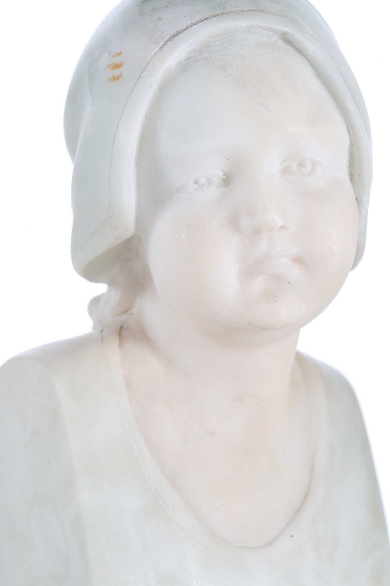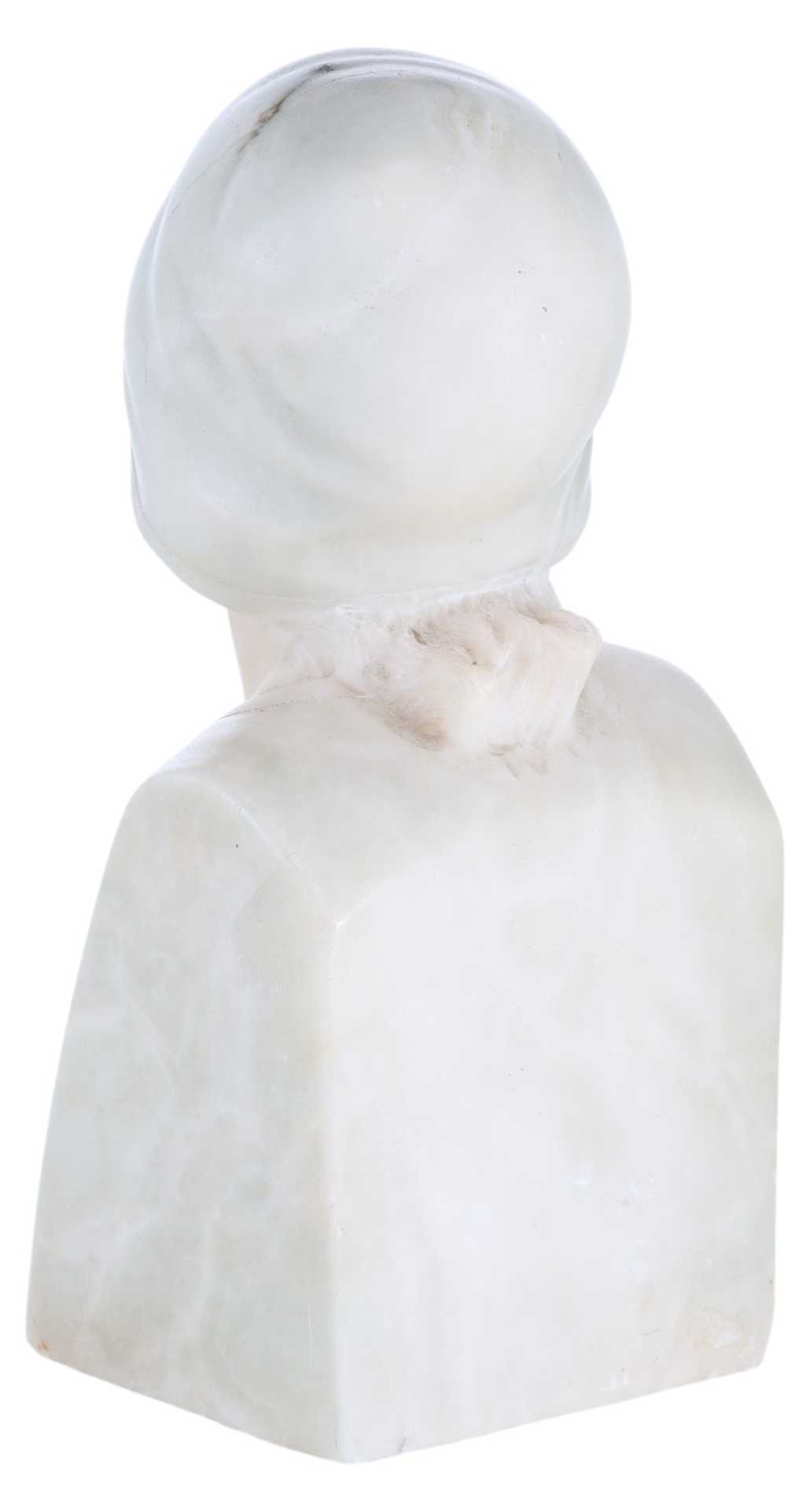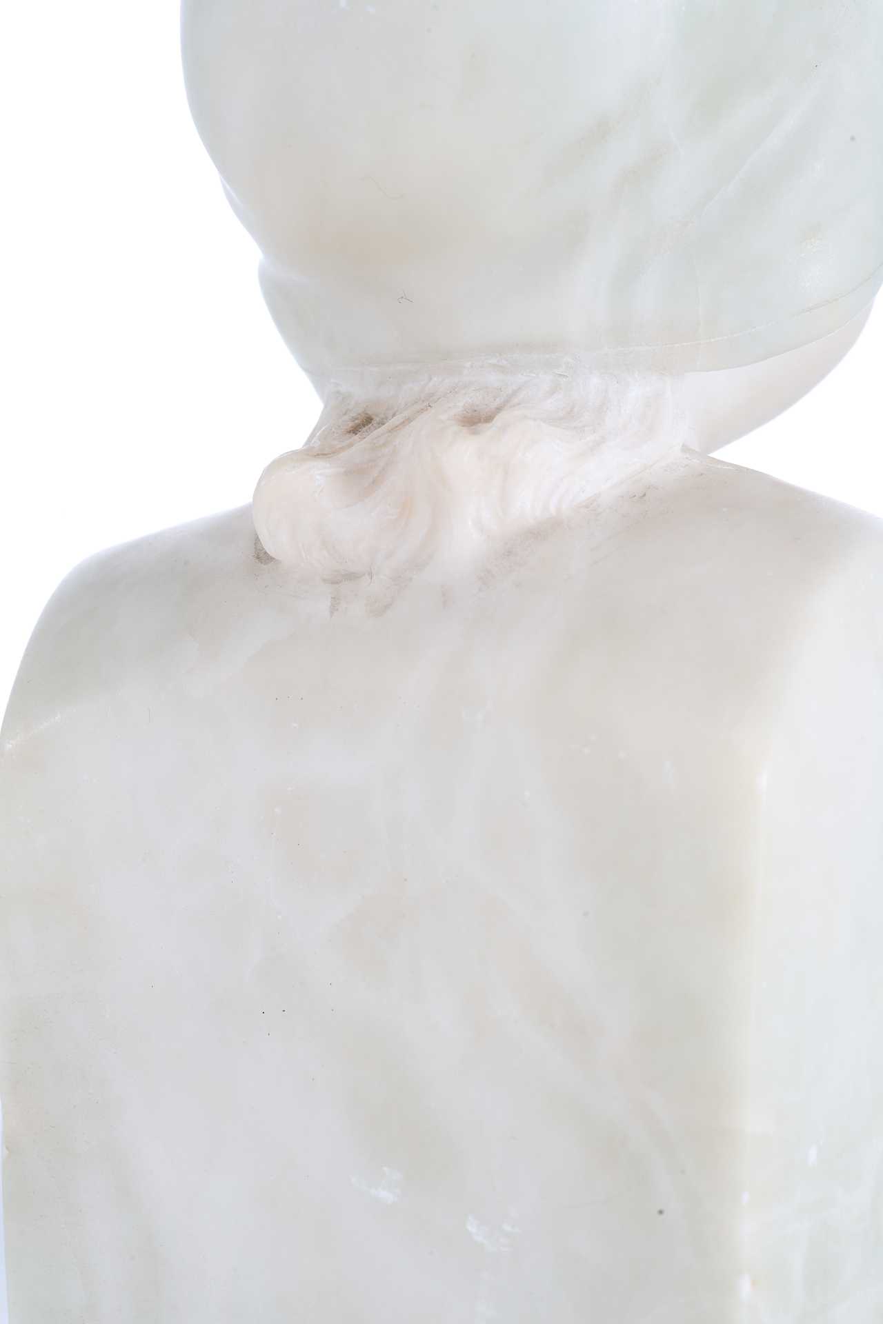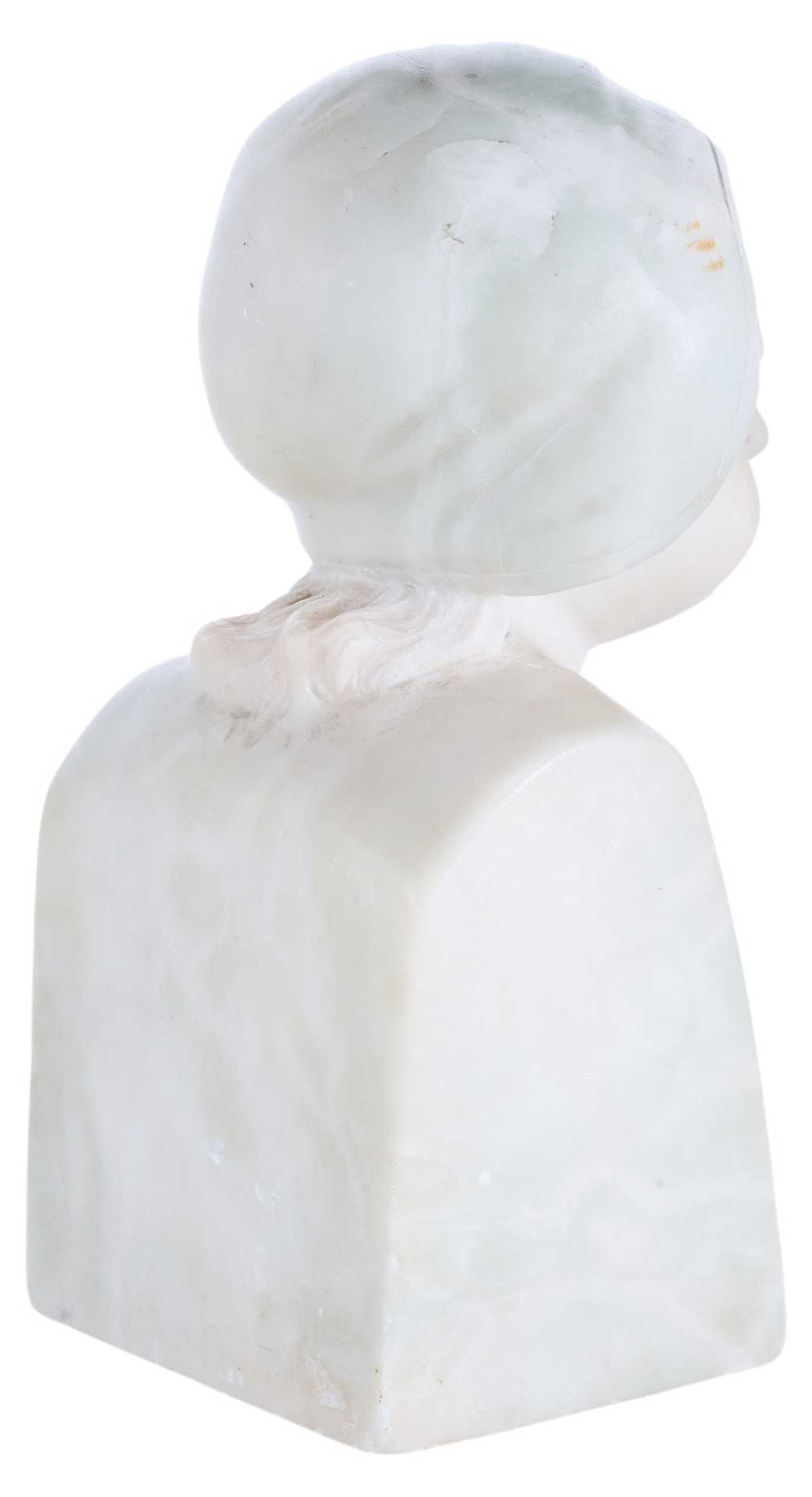 Бюст маленькой девочки вырезанный вручную из алебастра. На голове девочки чепчик. Алебастр как камень (кальцит) мягкий, прозрачный, блестящий и как бы расплывчатый пригоден для мелкой скульптуры, для тонкой обработки поверхности, хотя может быть пригоден и для крупных статуй. Алебастр использовался как материал скульптуры в очень древние времена в Месопотамии — в алебастре выполнены некоторые шедевры скульптуры древних шумеров. С XIV века алебастр начинают применять в скульптуре Западной Европы (в Англии и Нидерландах лежащие фигуры умерших на гробницах часто