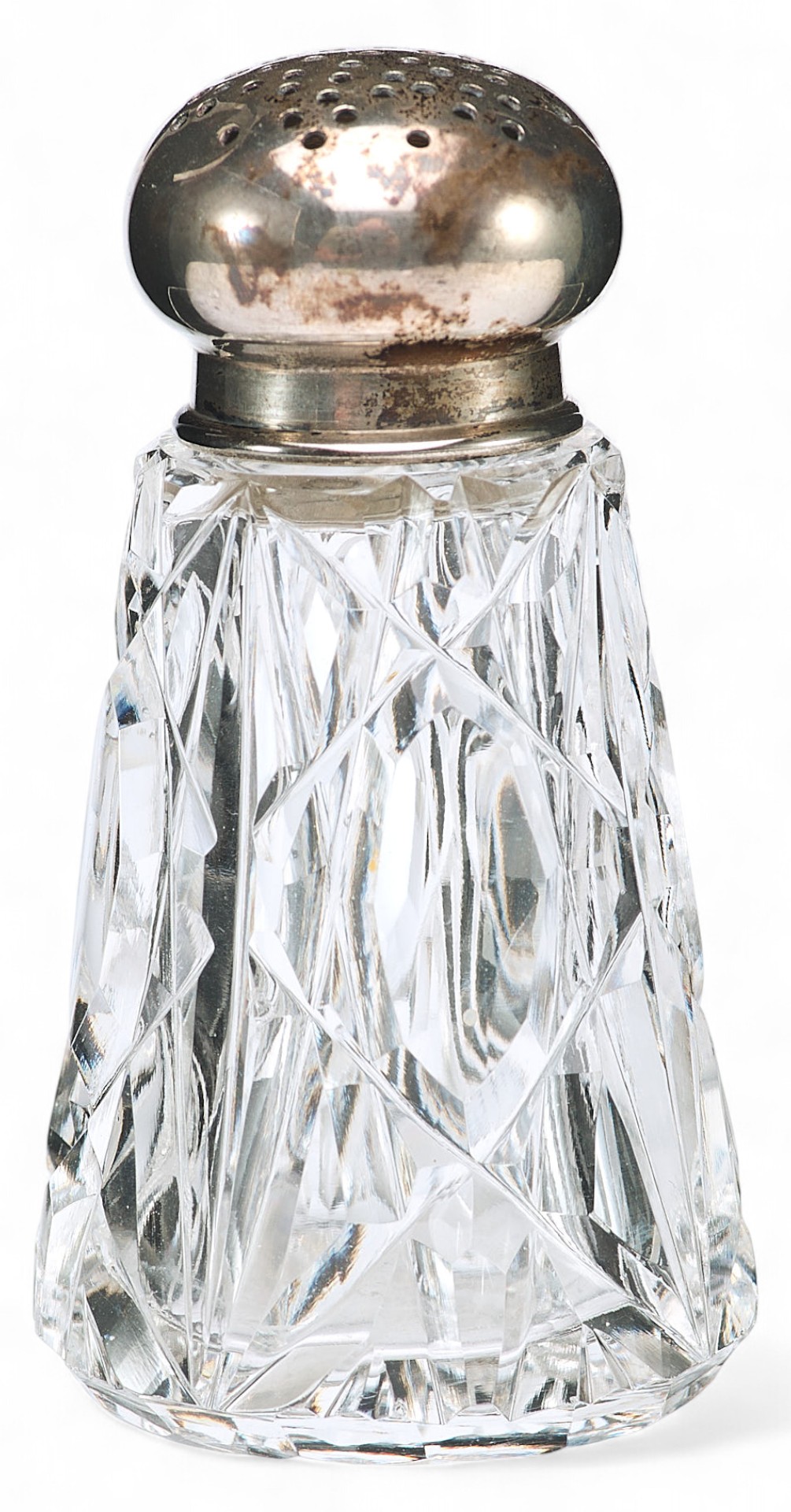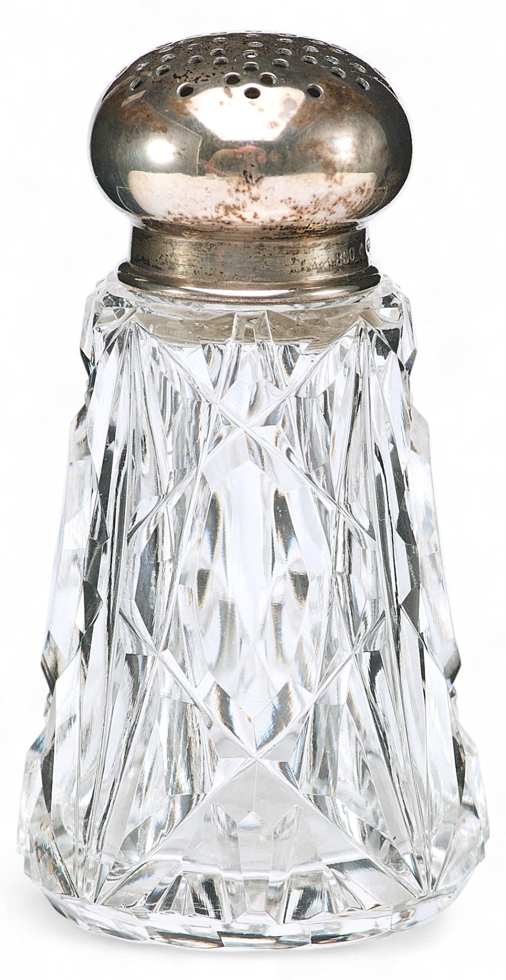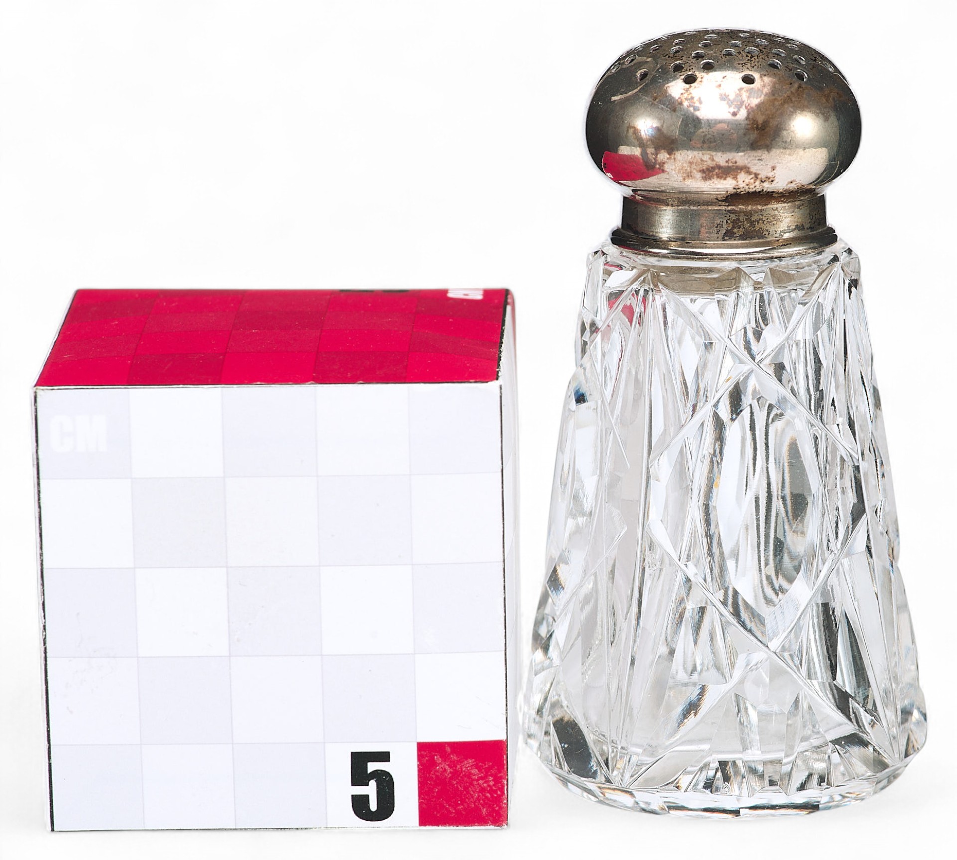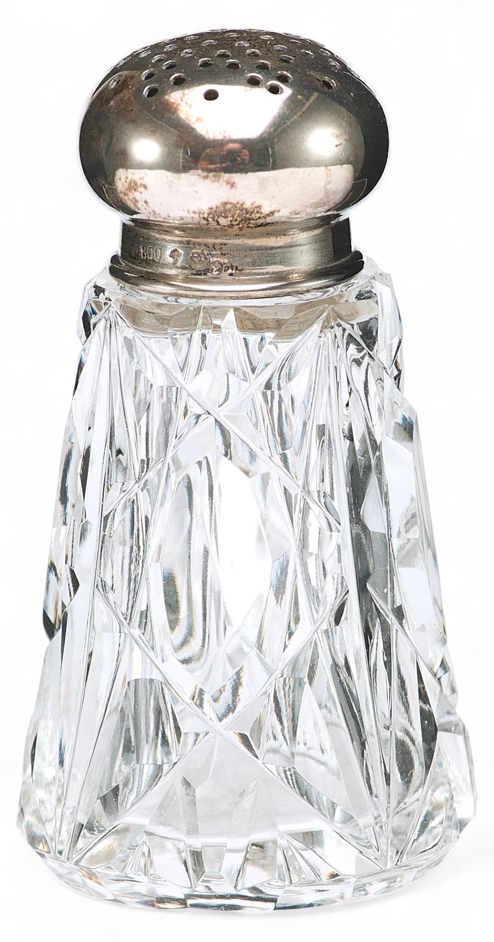 Представлена солонка с серебряными каймой и крышкой.