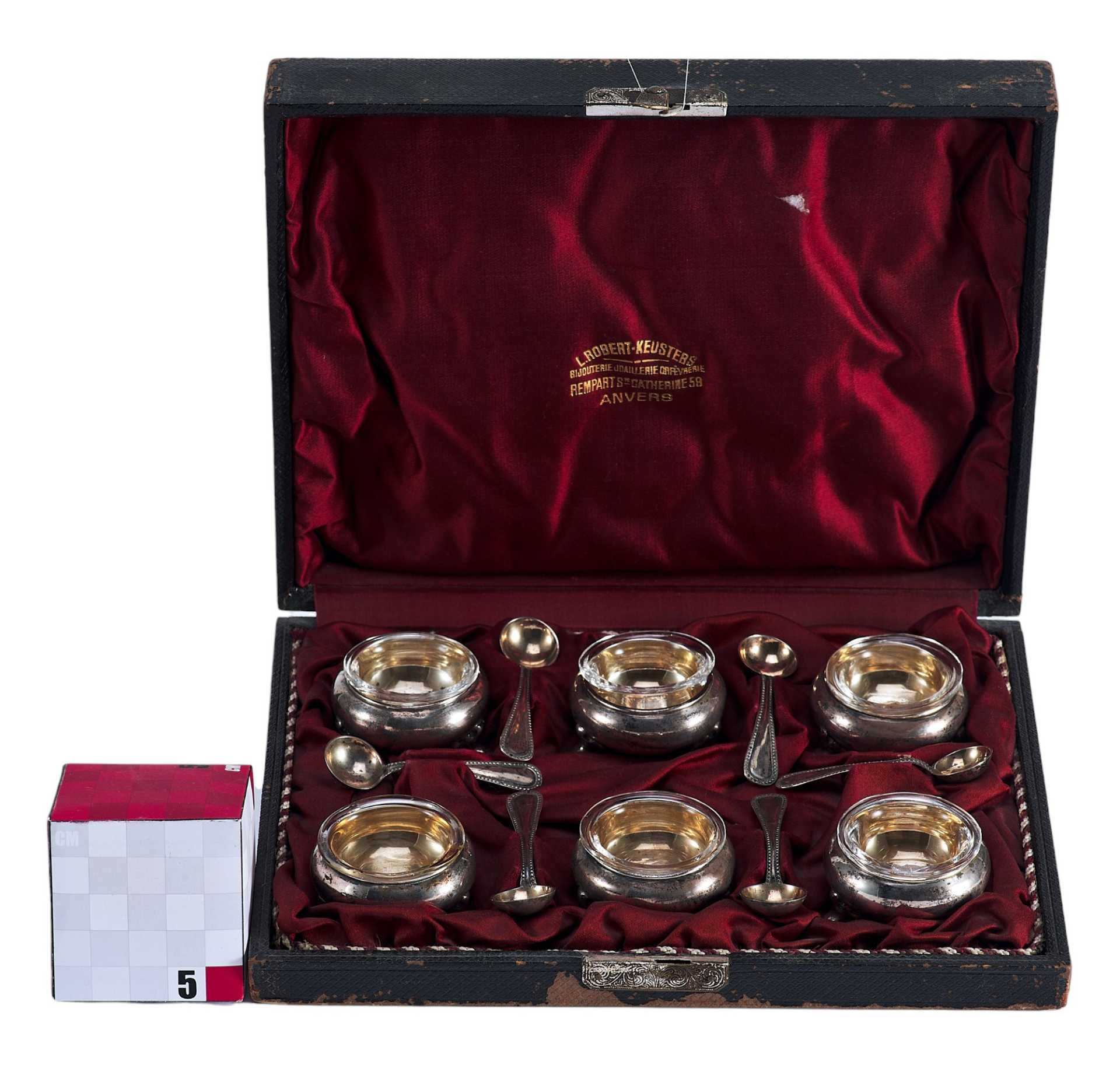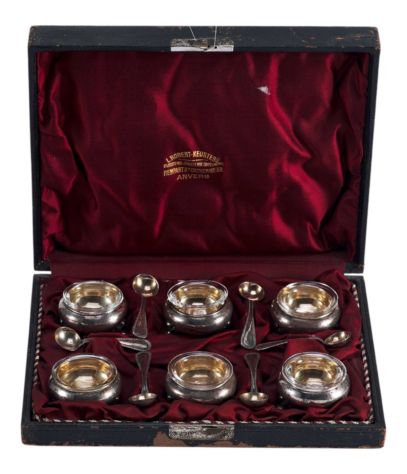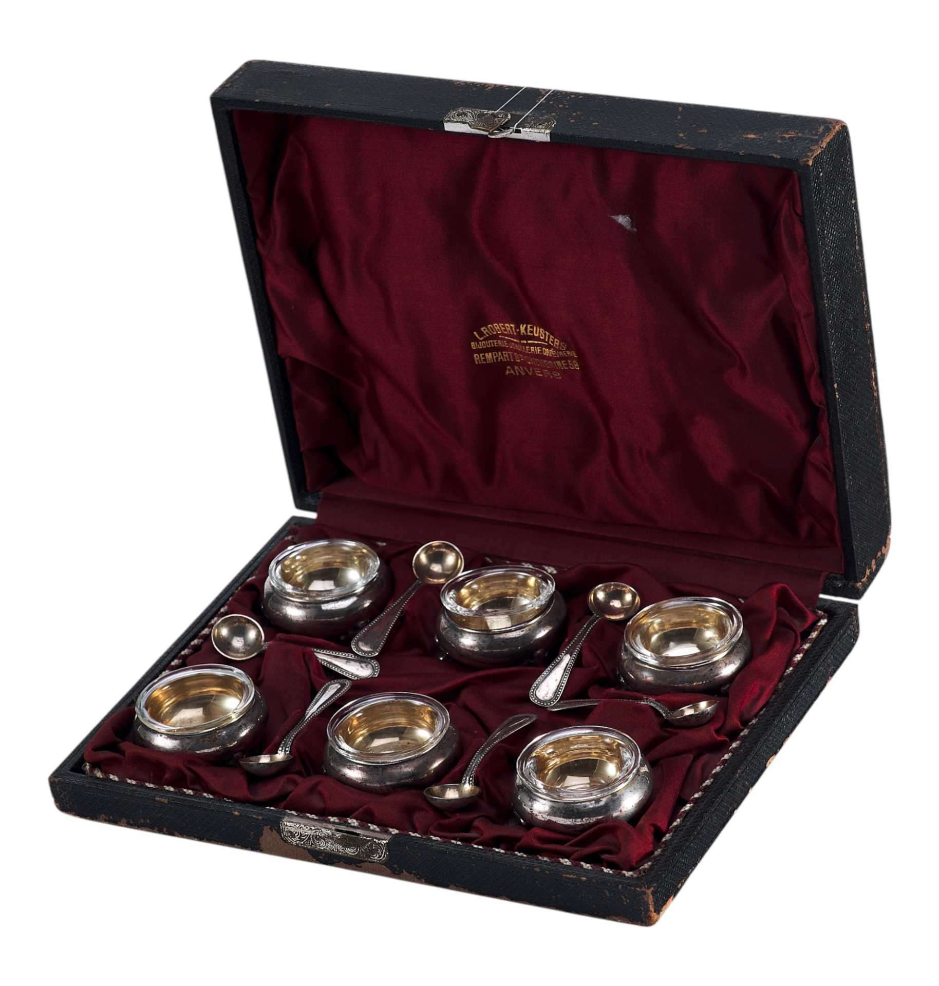 Представлен набор солонок с ложками в оригинальном футляре. Внутри, на бархате, фирменный штамп ювелирного салона: «L.Robert-Keusters bijouterie joaillerie orfevrerie (бижутерия ювелирные изделия) Rempart SdeGatherine 59 Anvers (Антверпен)».