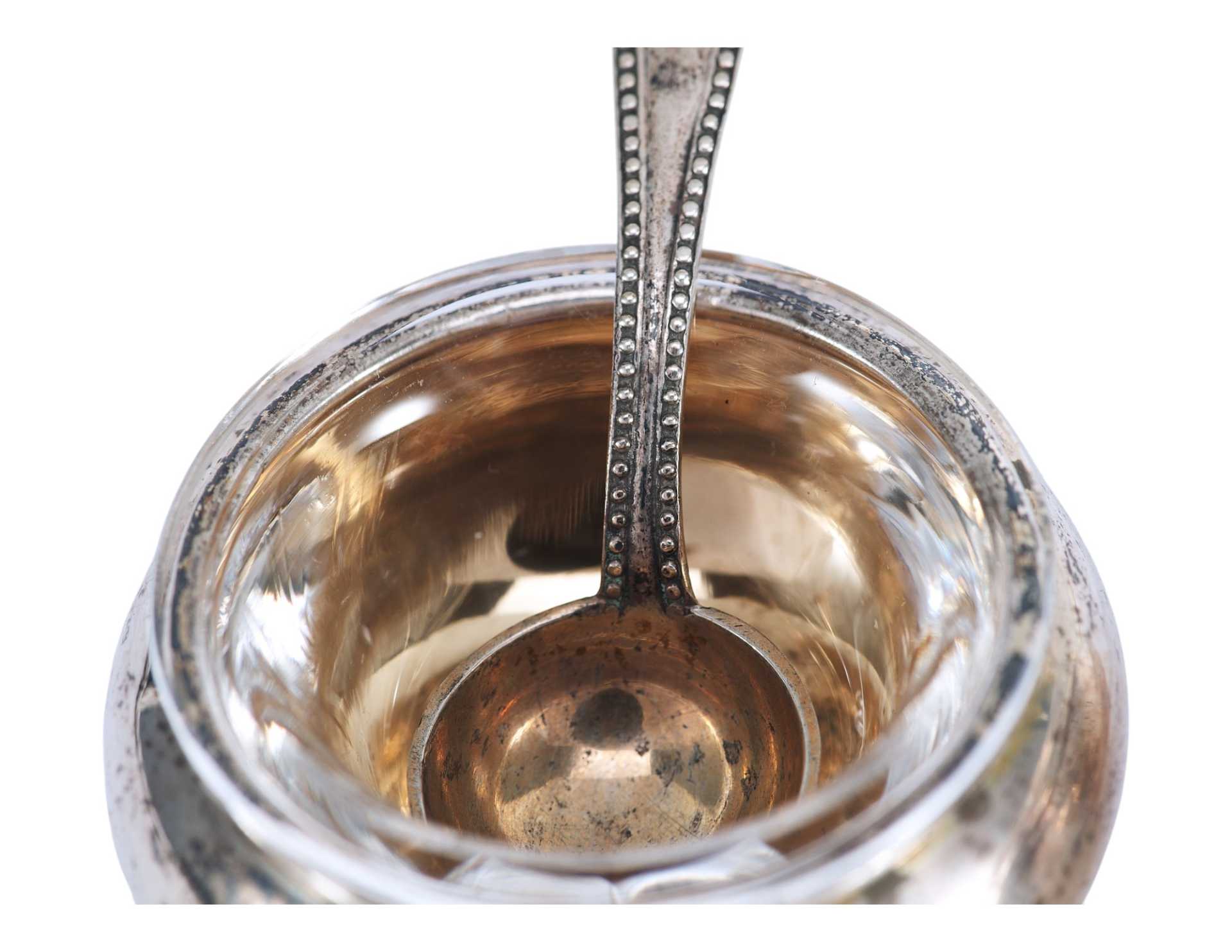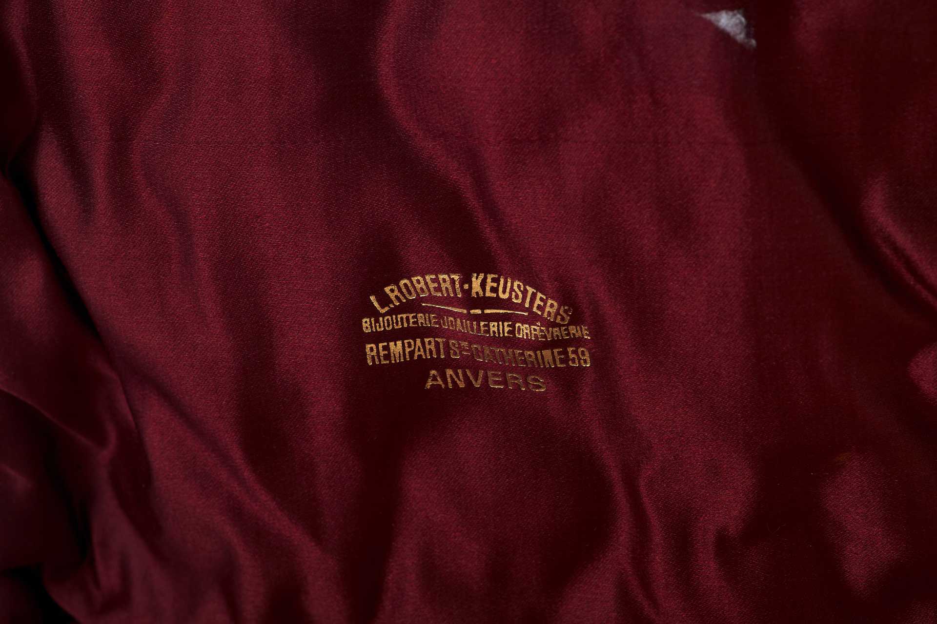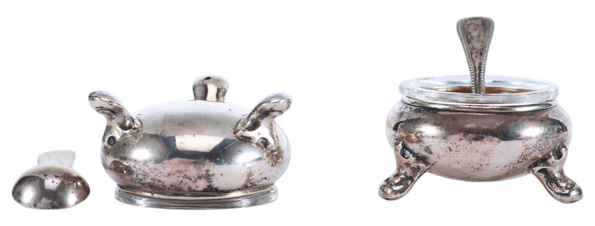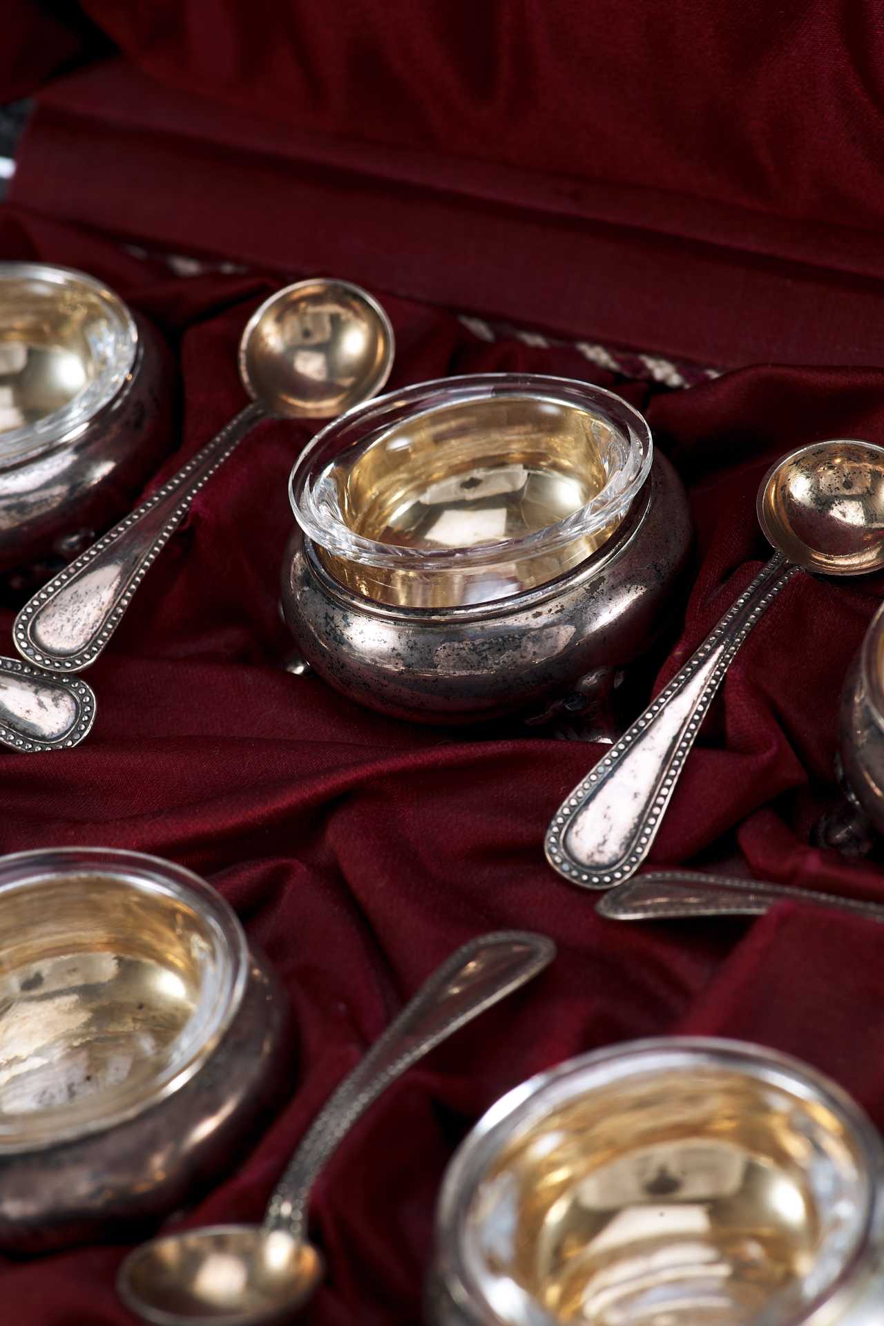 Представлен набор солонок с ложками в оригинальном футляре. Внутри, на бархате, фирменный штамп ювелирного салона: «L.Robert-Keusters bijouterie joaillerie orfevrerie (бижутерия ювелирные изделия) Rempart SdeGatherine 59 Anvers (Антверпен)».