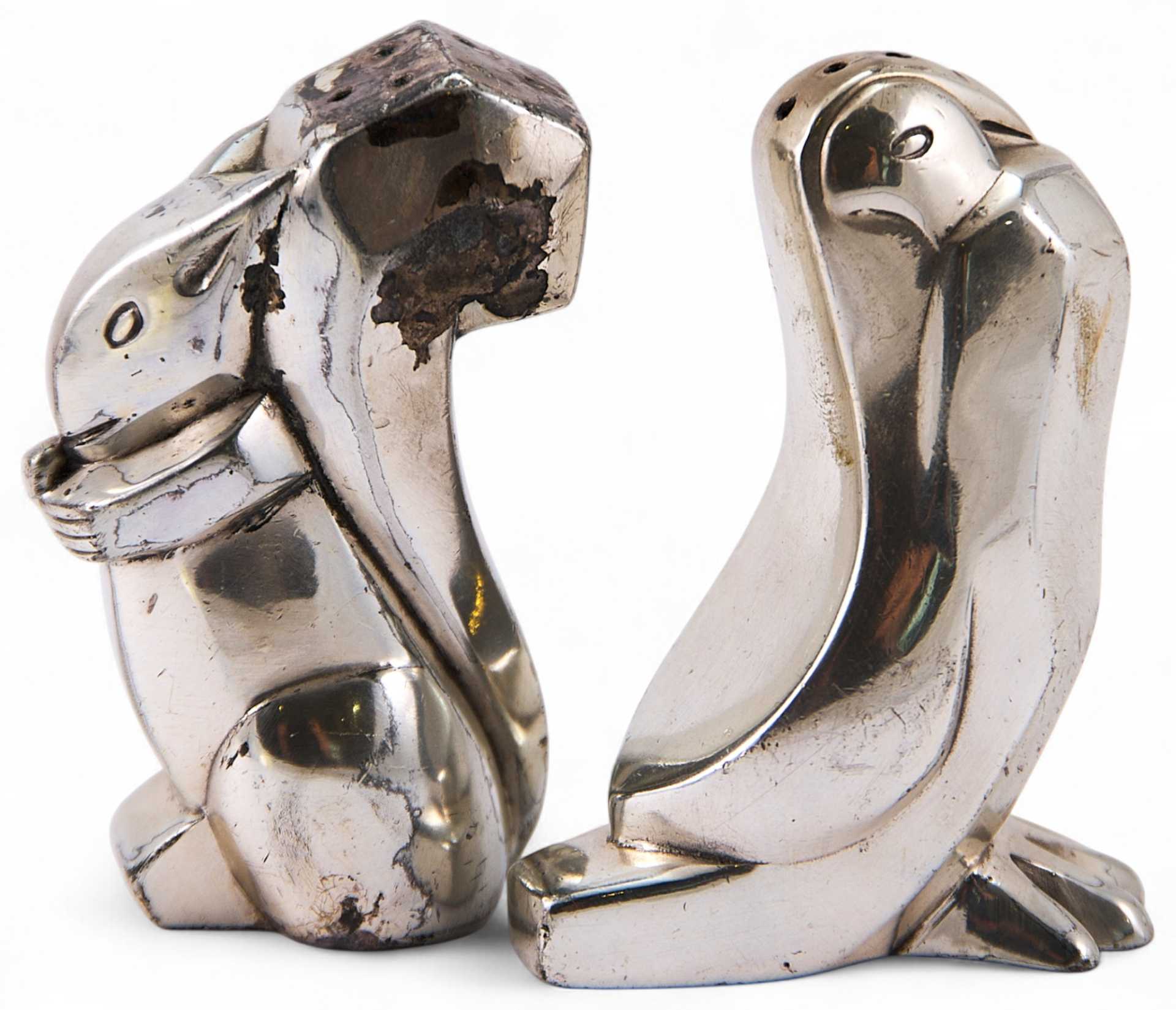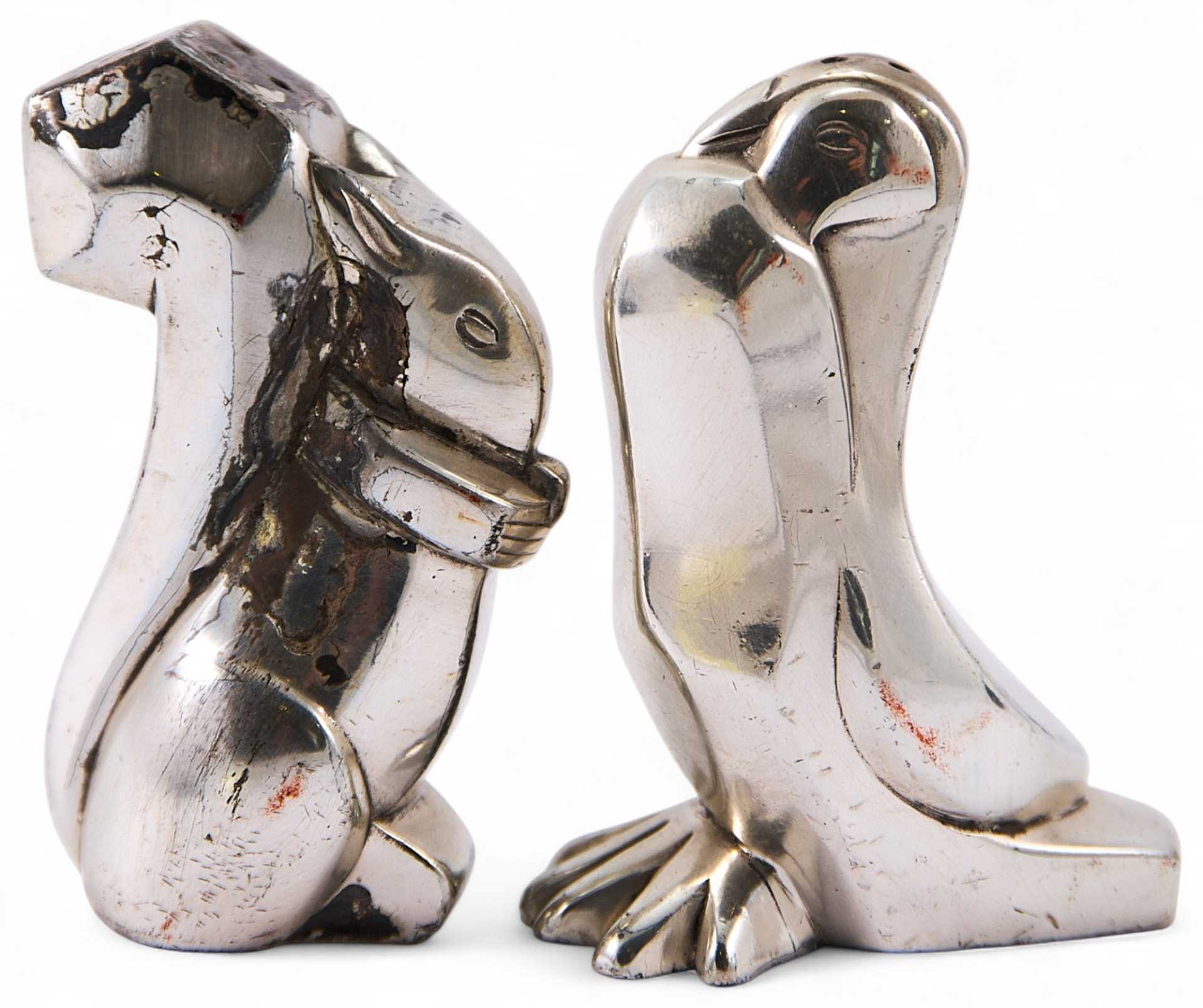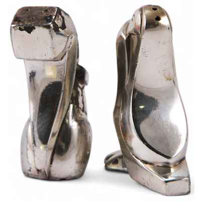 Представлены солонка и перечница в виде стилизованных фигурок птички и белочки. Дизайн фигур выполнен в характерных для художественных тенденций того времени рубленых формах.
