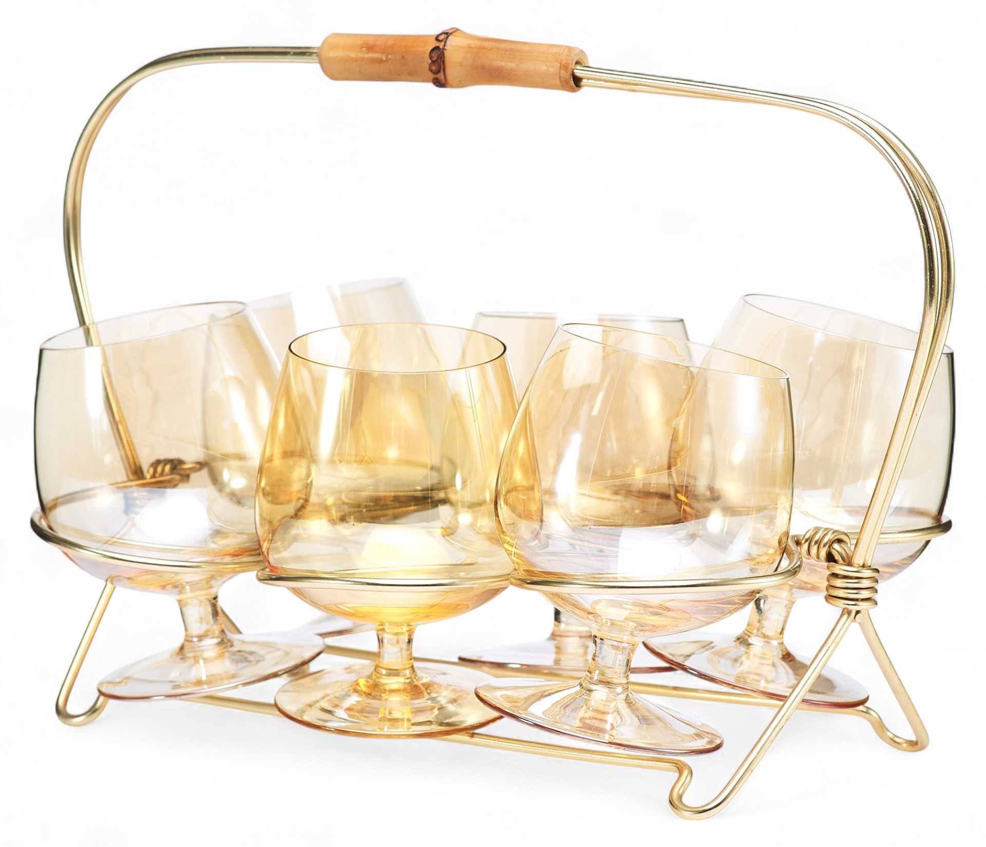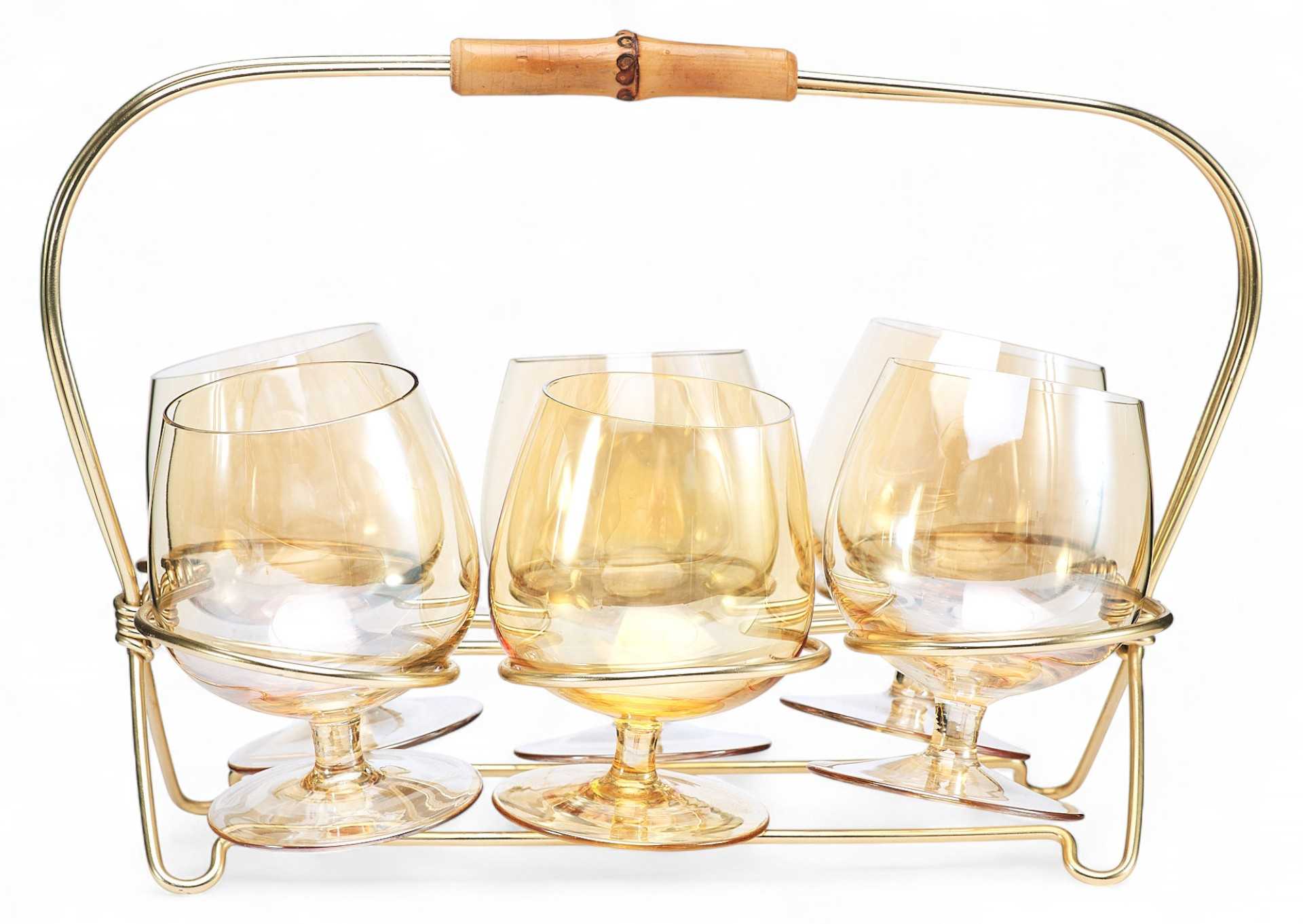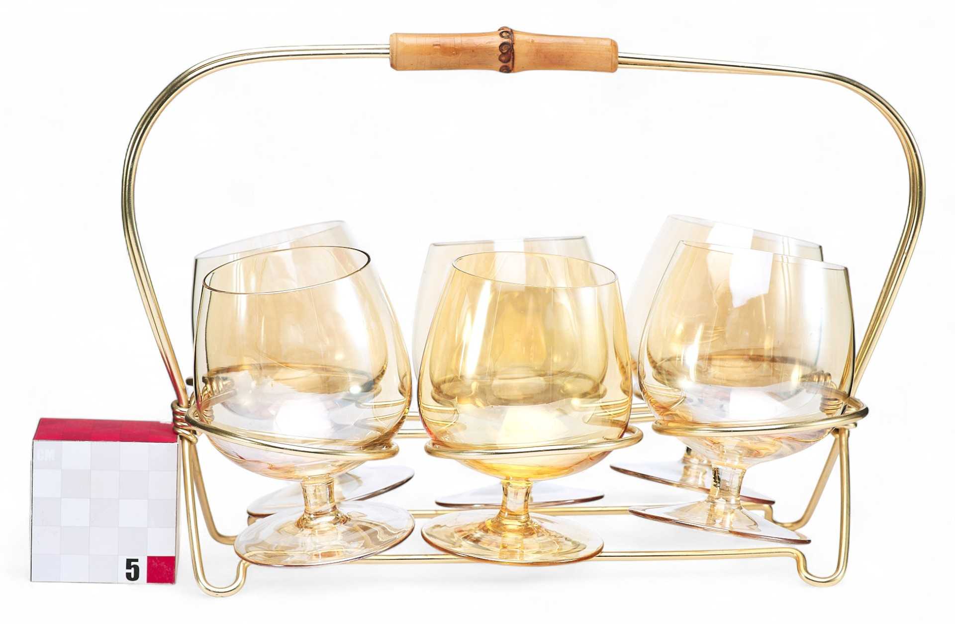 Подарочный набор из шести коньячных рюмок на подставке. Рюмки округлые в форме тюльпана, на крепких коротких ножках, выполнены из прозрачного стекла. Подставка из золотистого металла с ручкой из бамбука. Рюмки для спиртных напитков пришли в Россию в средние века, «заступив» на смену более объемным и менее изящным братинам, чашам и чаркам. Есть несколько версий происхождения самого слова «рюмка».