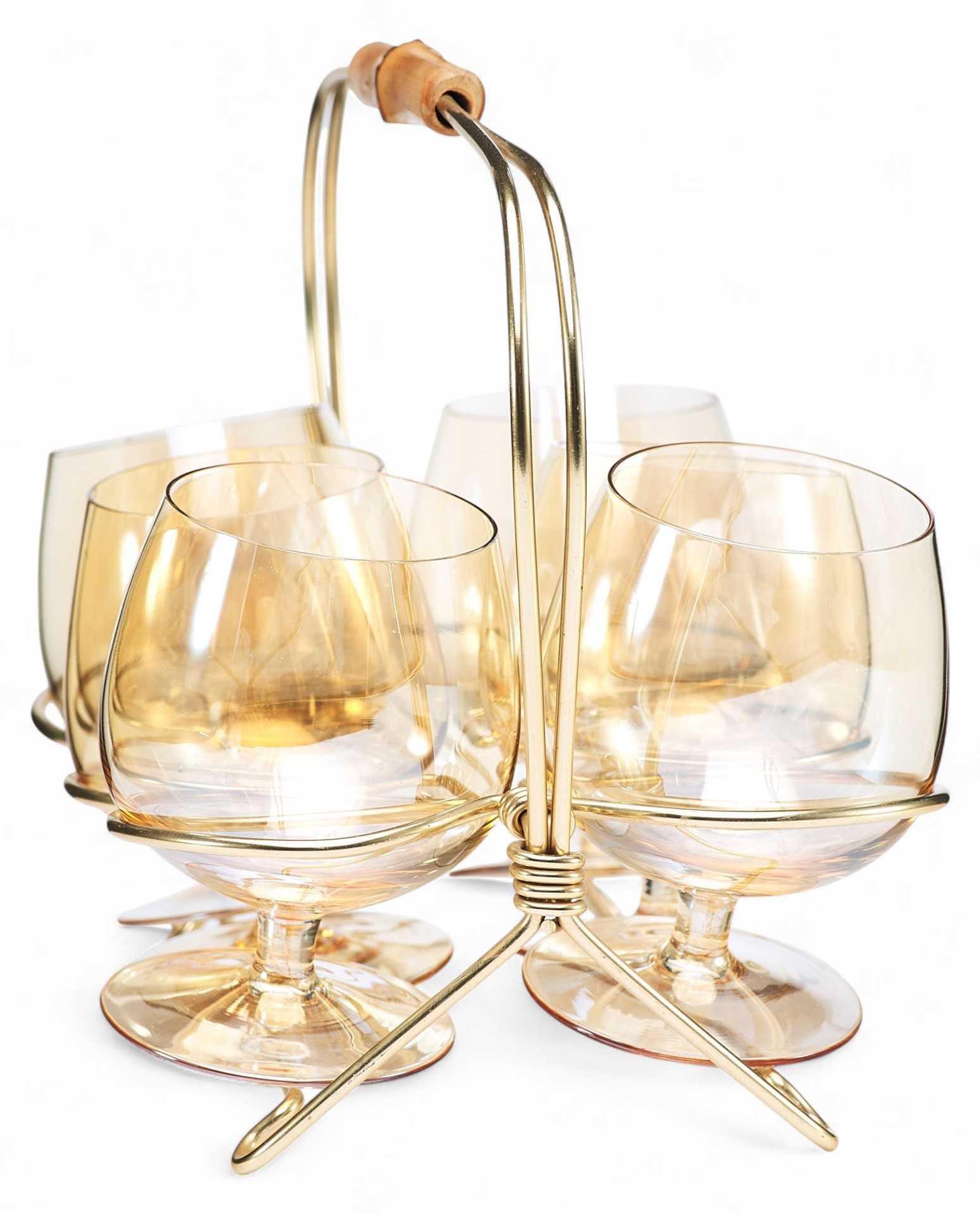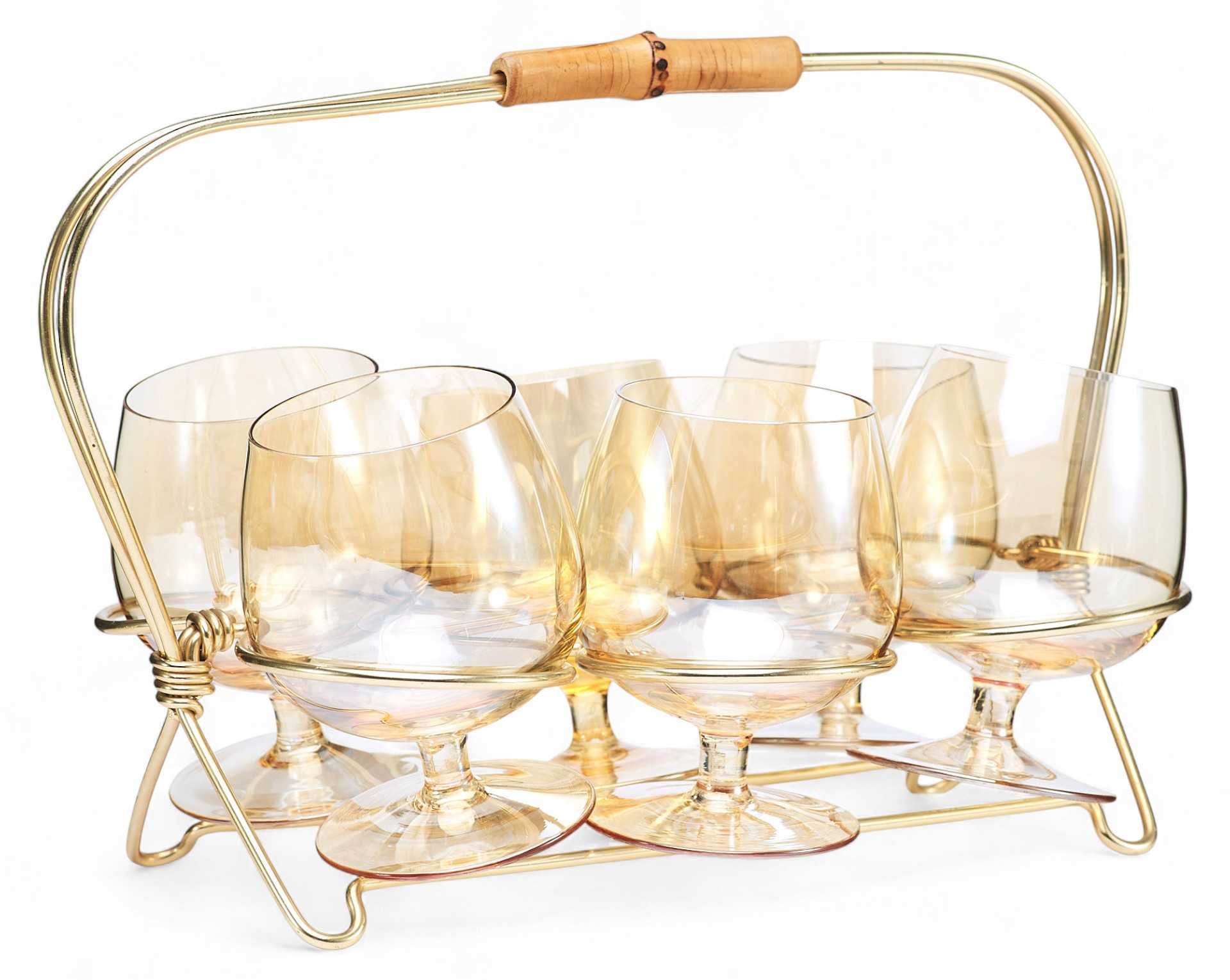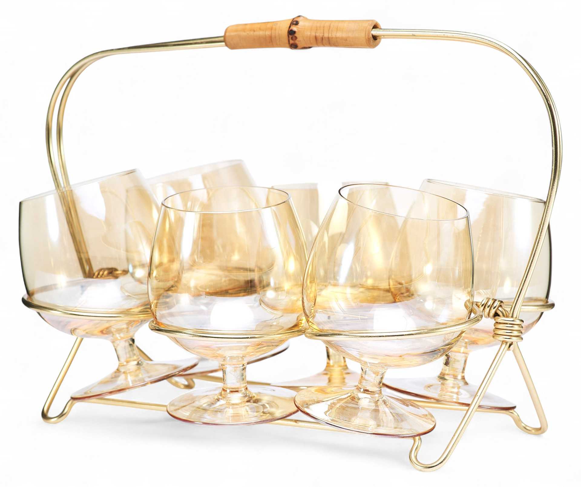 Подарочный набор из шести коньячных рюмок на подставке. Рюмки округлые в форме тюльпана, на крепких коротких ножках, выполнены из прозрачного стекла. Подставка из золотистого металла с ручкой из бамбука. Рюмки для спиртных напитков пришли в Россию в средние века, «заступив» на смену более объемным и менее изящным братинам, чашам и чаркам. Есть несколько версий происхождения самого слова «рюмка».
