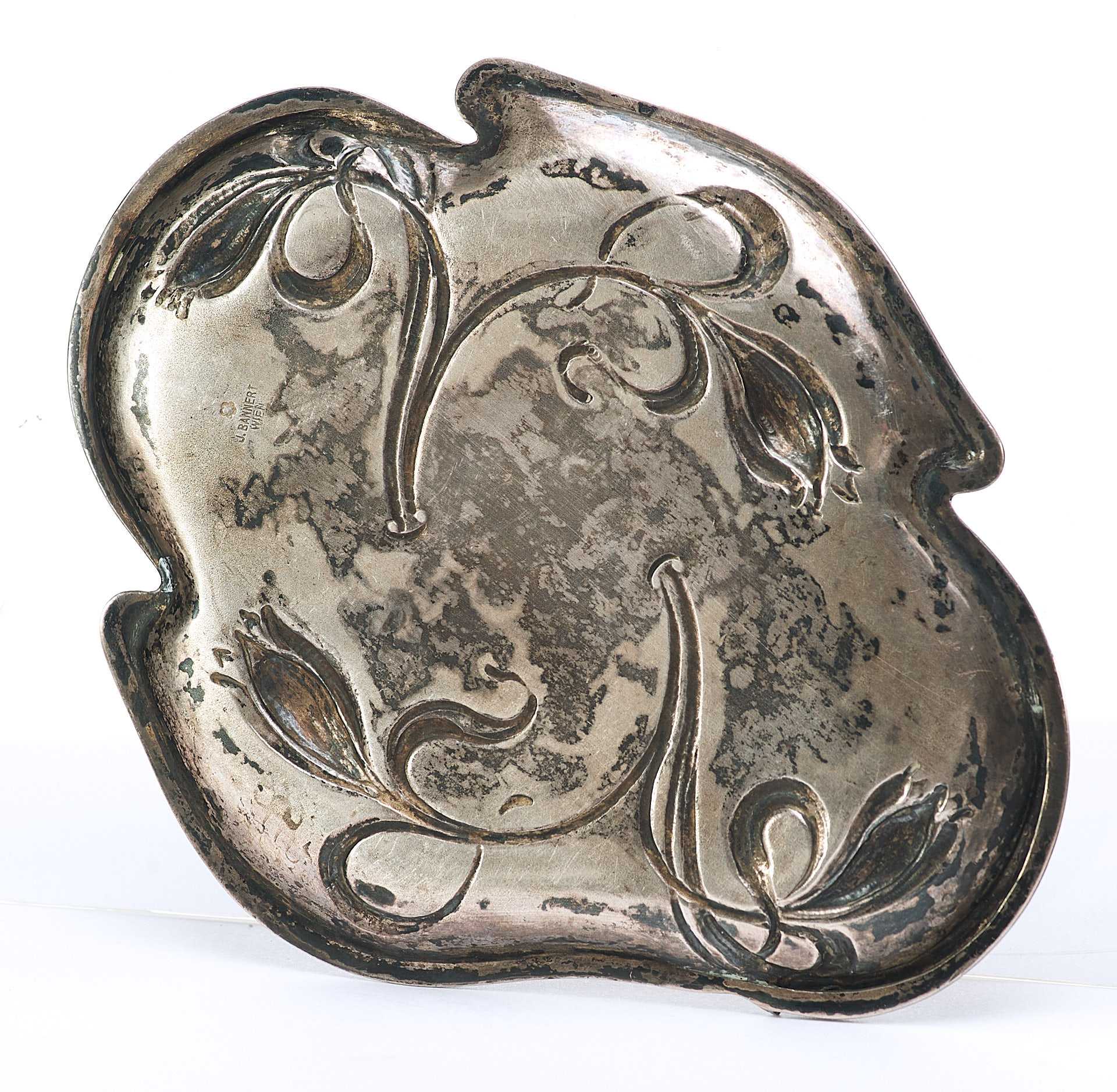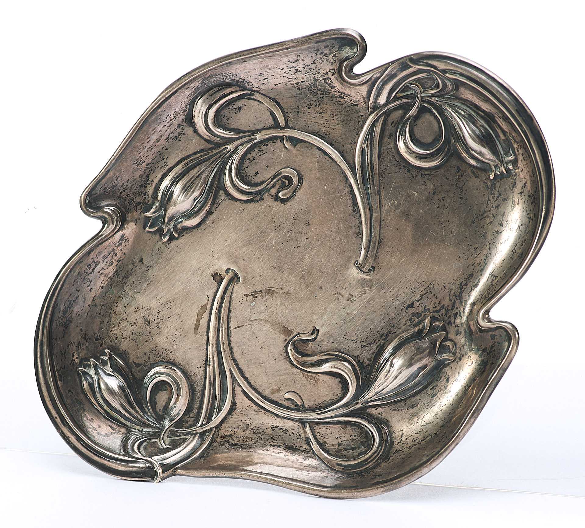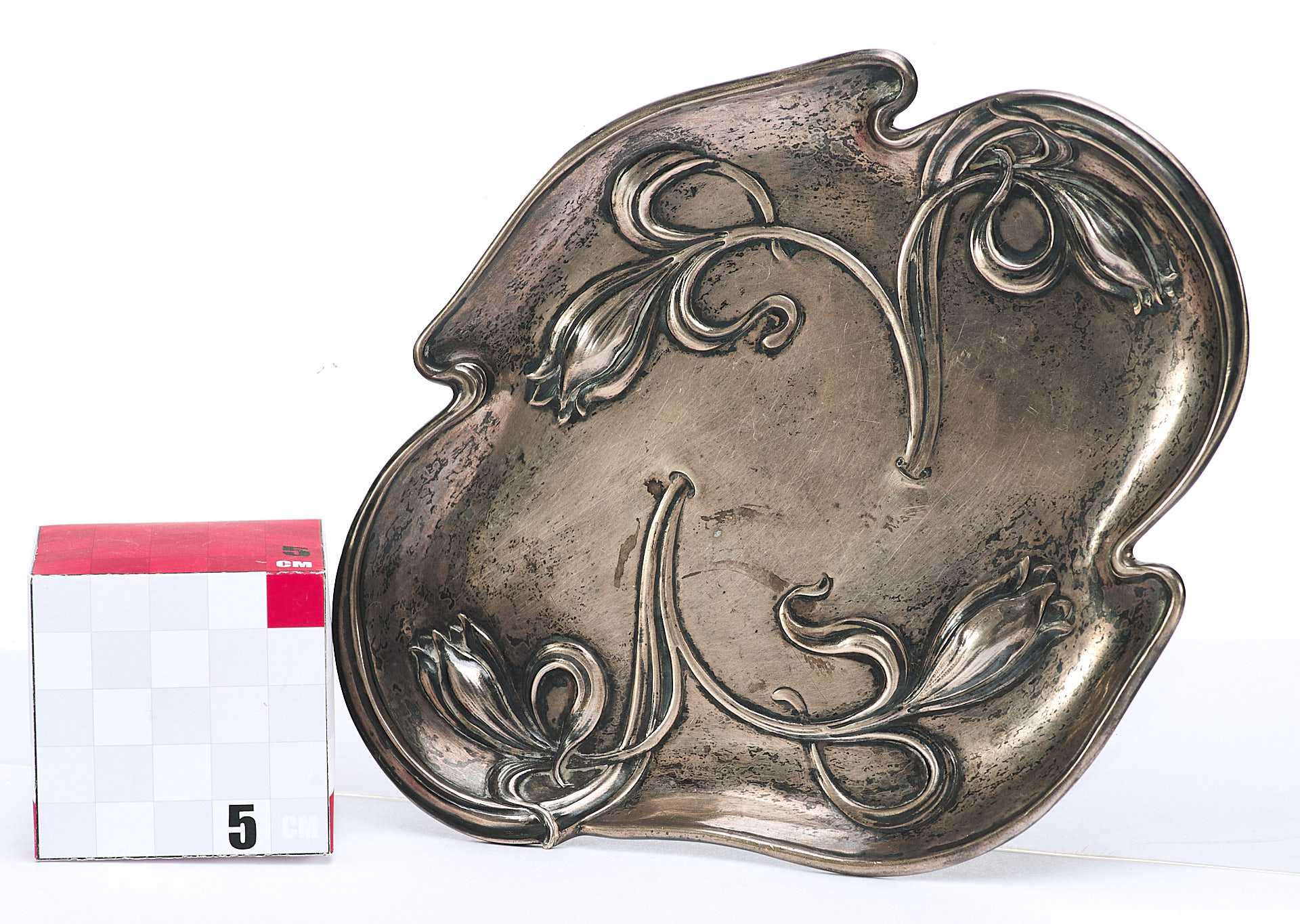Представлен поднос, украшенный стилизованным изображением цветов в стиле модерн. Мотив цветочного декора был явно заимствован автором у Германа Обриста (1863 - 1927), швейцарского художника и ученого-натуралиста, с его знаменитого произведения - гобелена «Удар бича» («Цикламен»), который он создал в 1895 г.