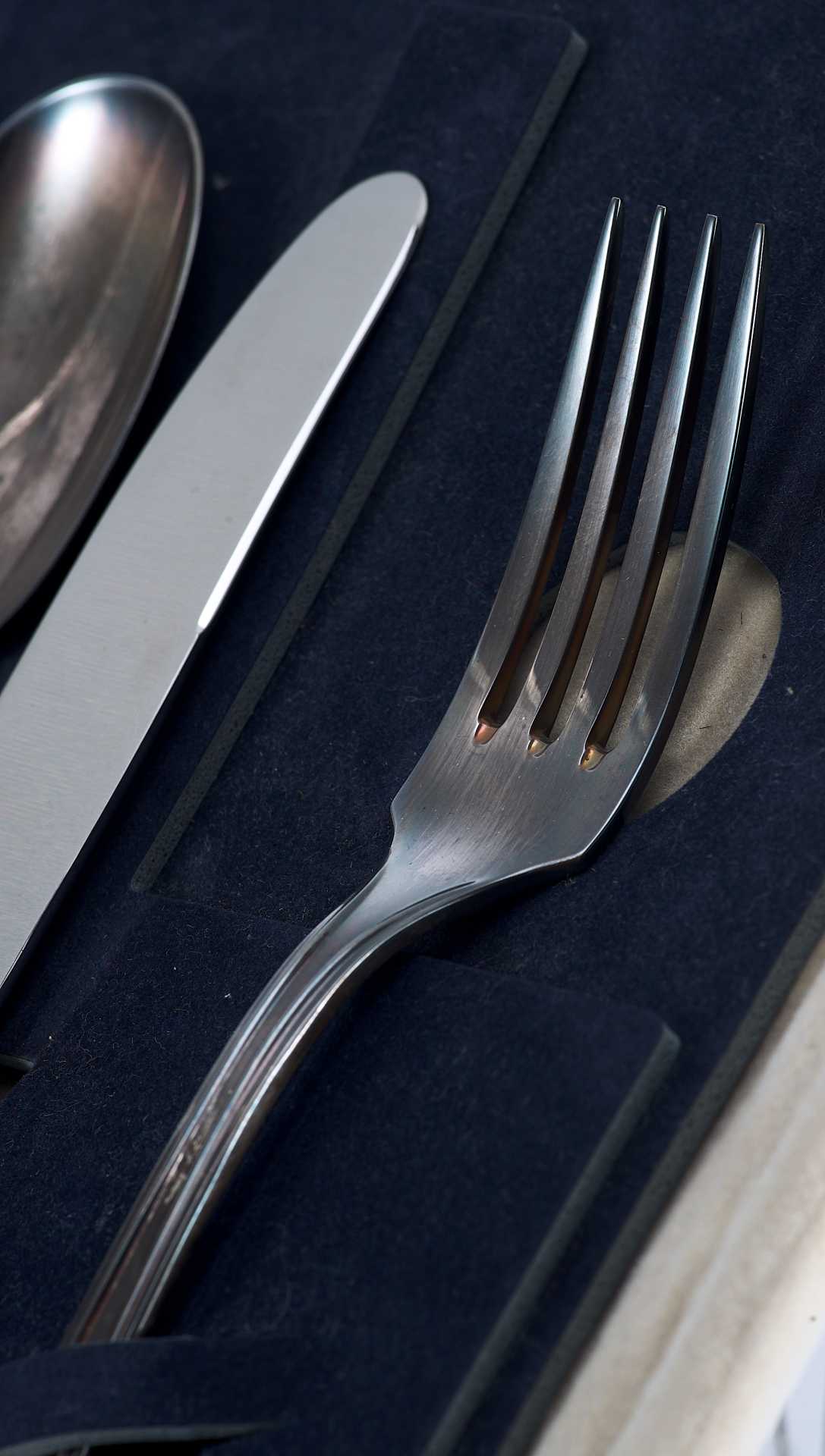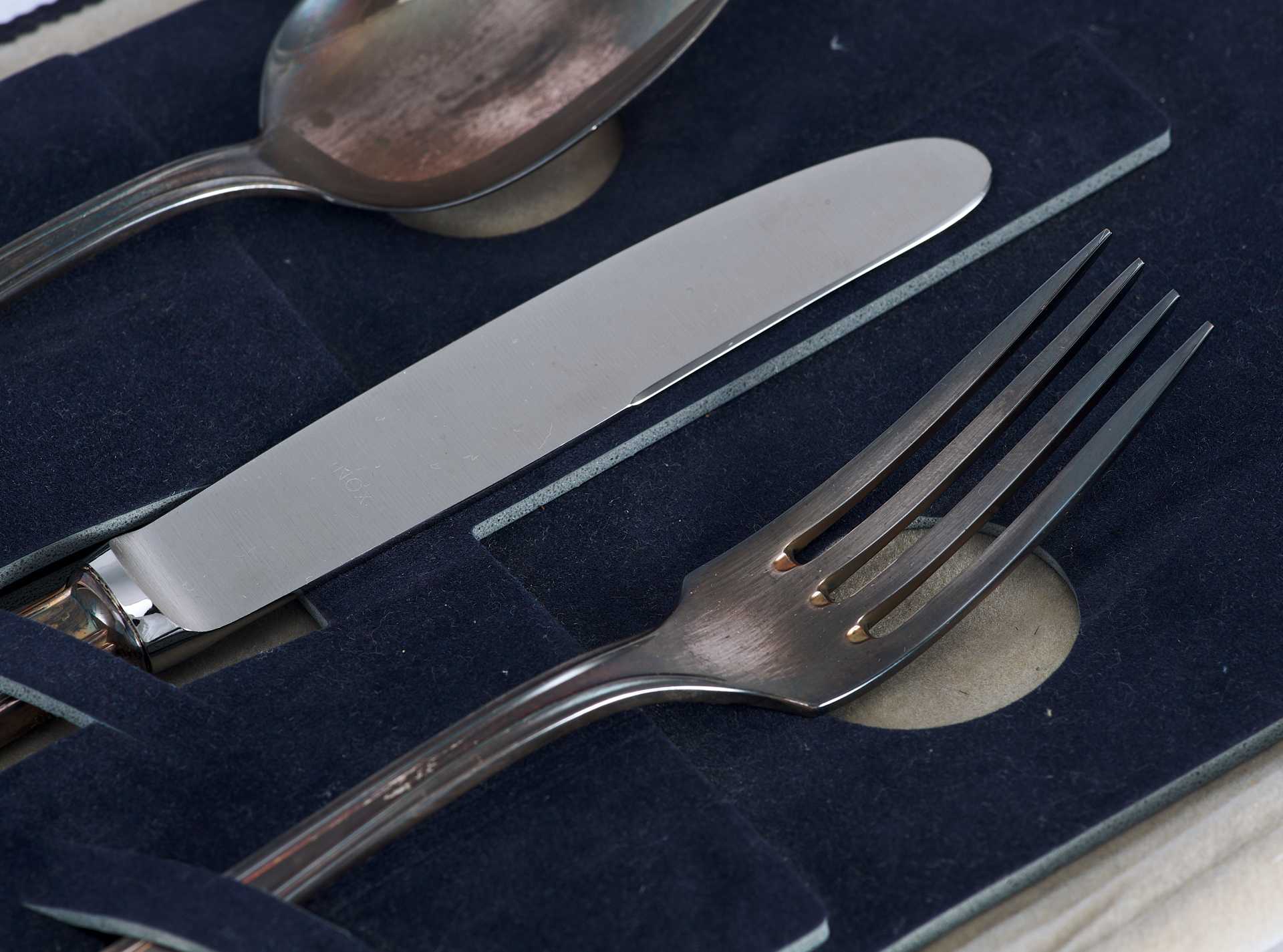 Представлен набор столовых приборов состоящих из вилки, ложки и ножа, в подарочном оригинальном футляре.