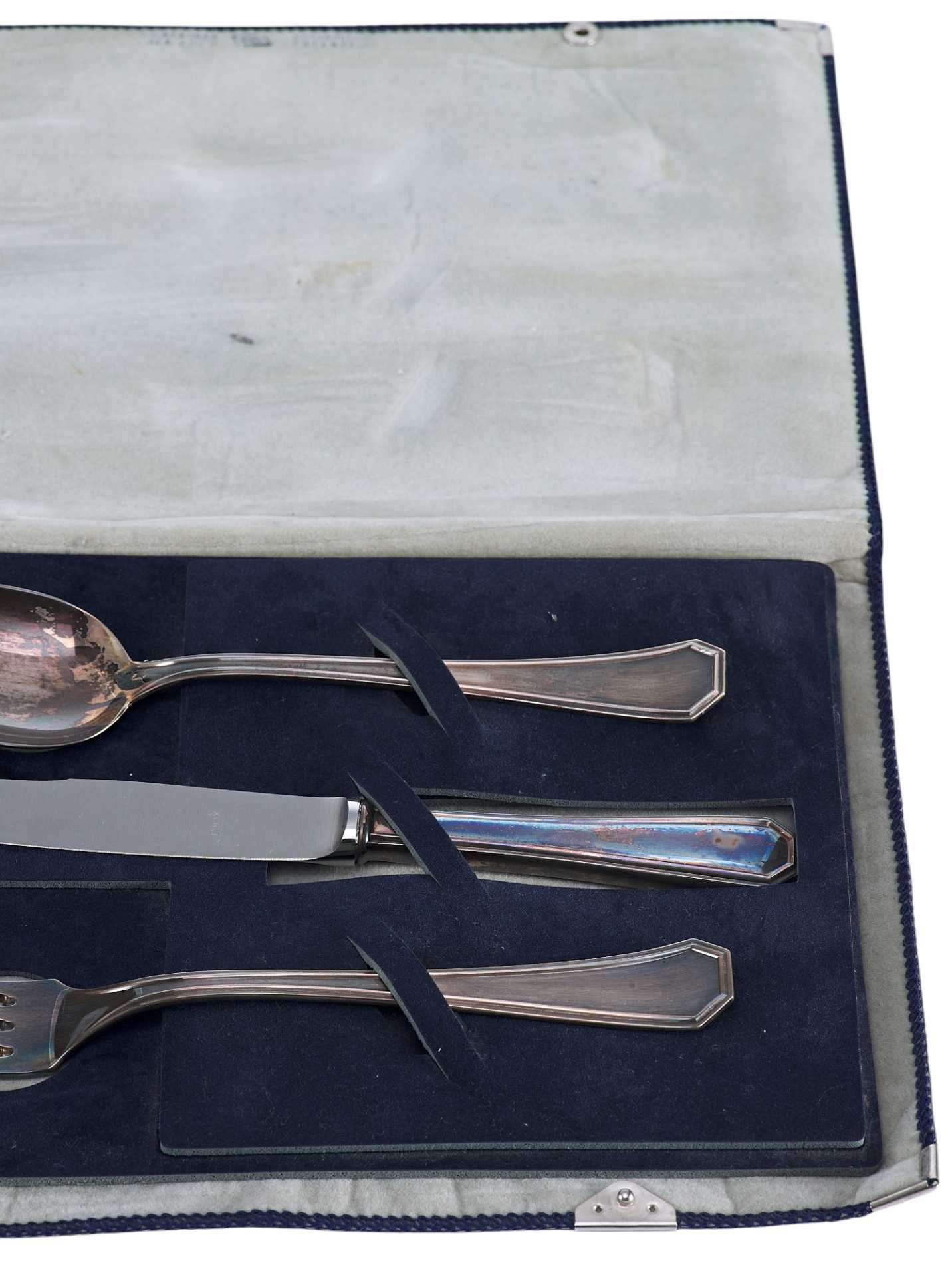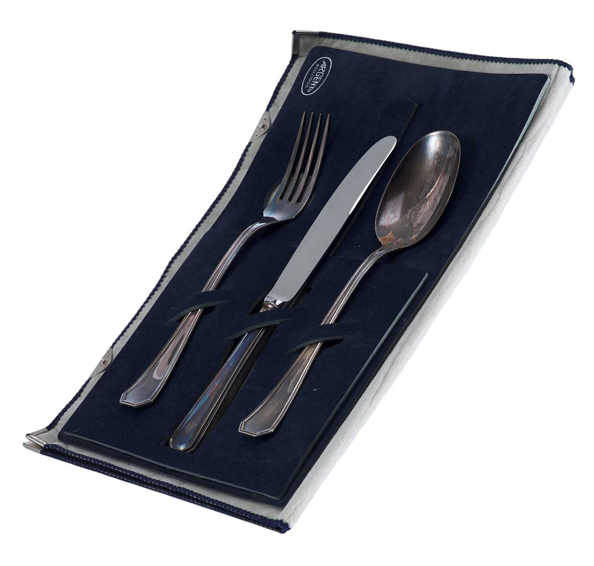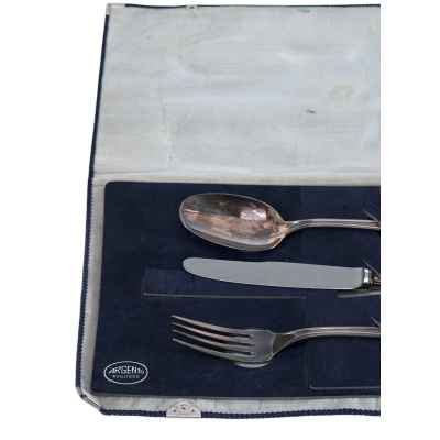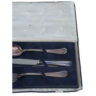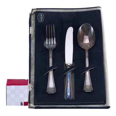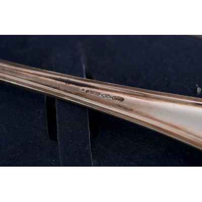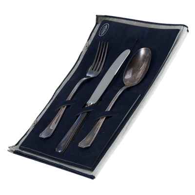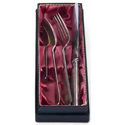 Представлен набор столовых приборов состоящих из вилки, ложки и ножа, в подарочном оригинальном футляре.