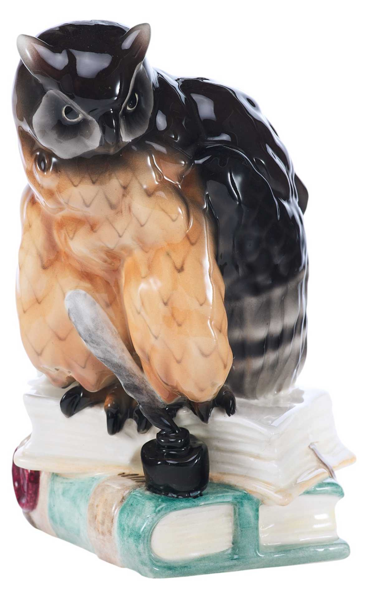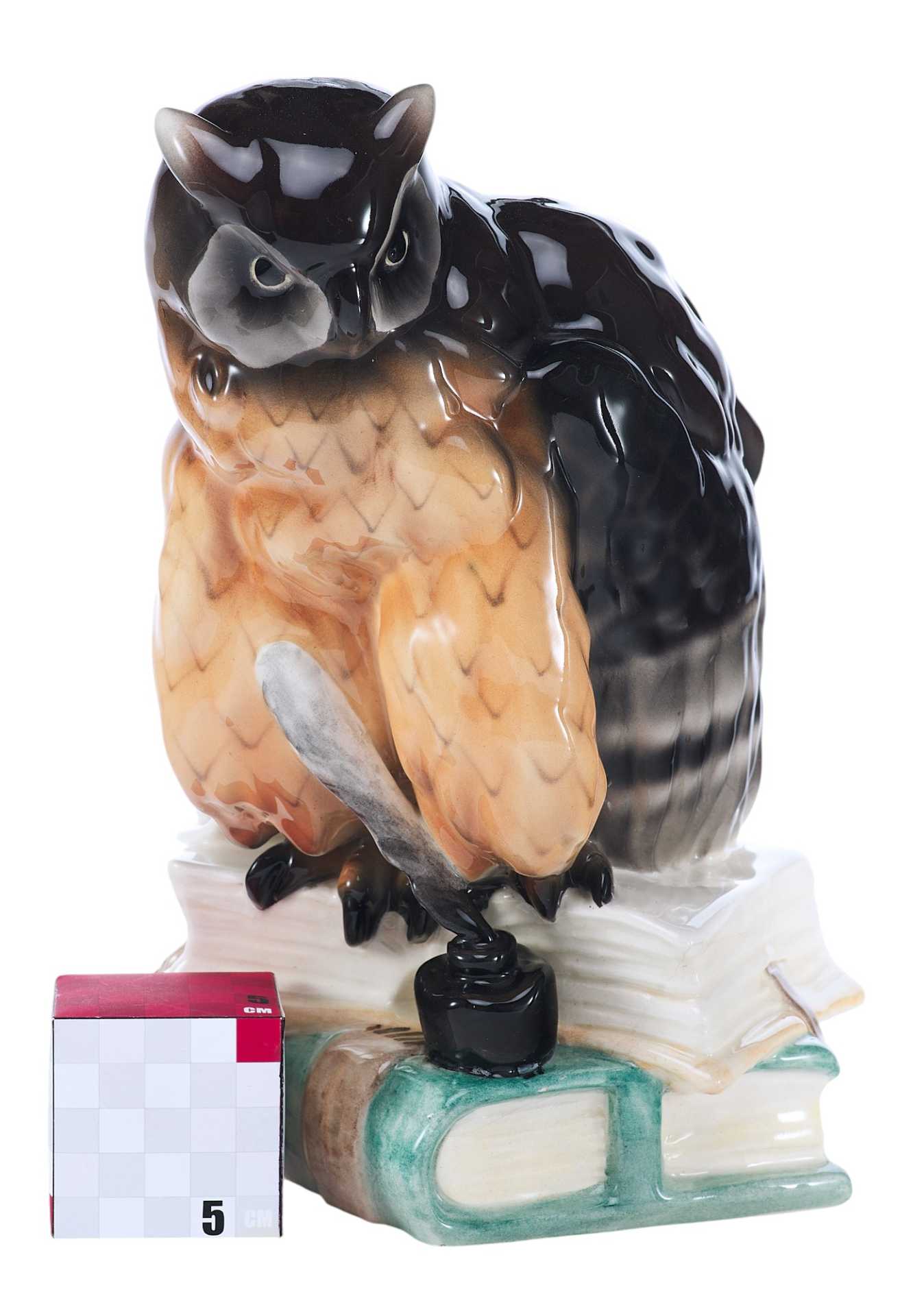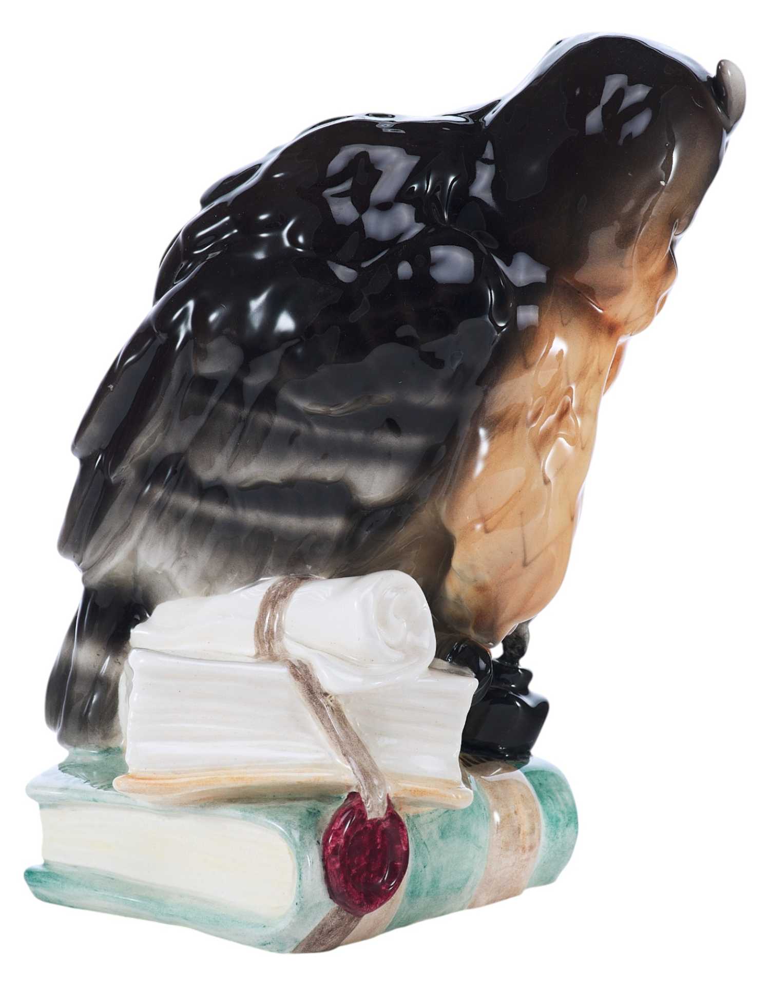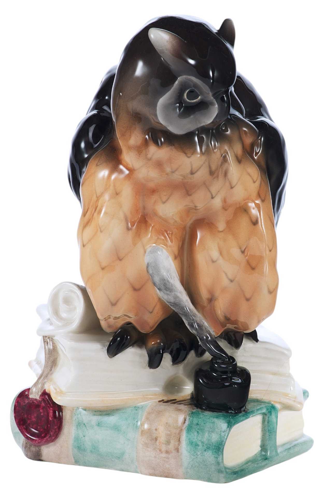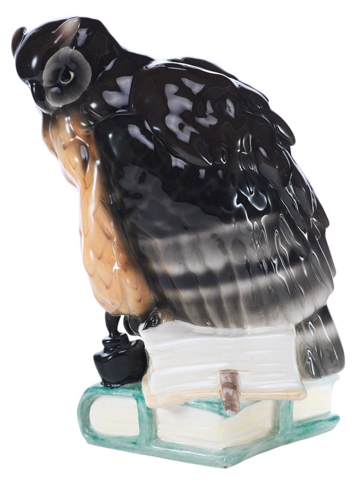 Скульптура филина сидящего на книгах, у чернильницы с пером. На основании фигуры клеймо производителя - художественной мастерской Голдшейдера в Вене (Австрия).