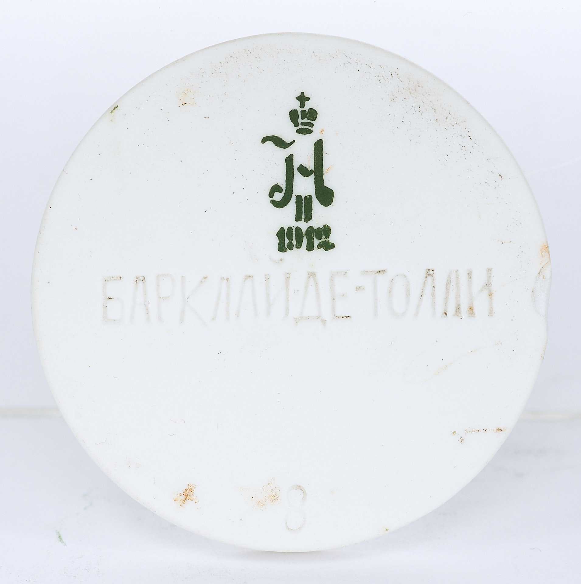 На обороте клеймо Императорского фарфорового завода - НИ под императорской короной, дата — 1912 г. Ниже надпись «в тесте»: Барклай-де-Толли.