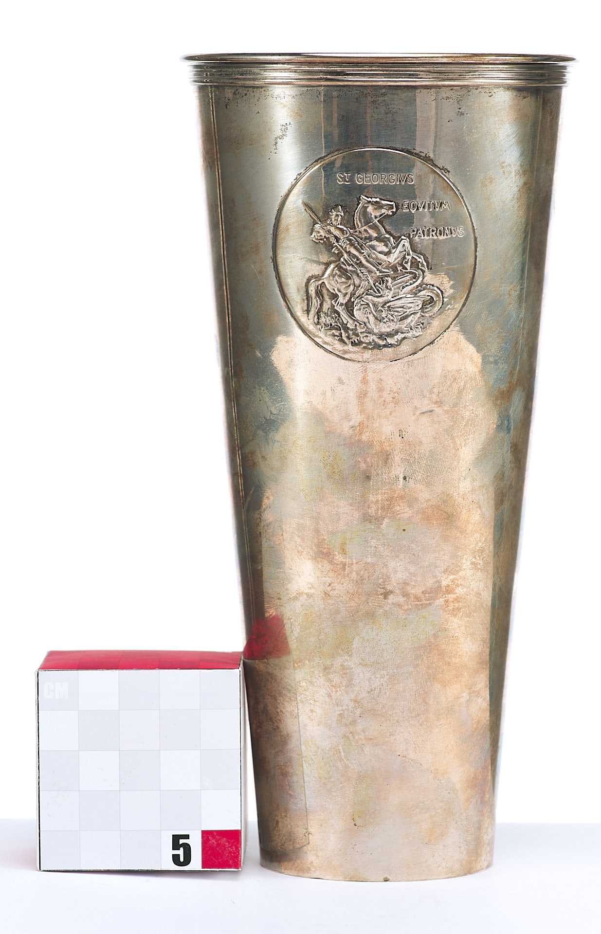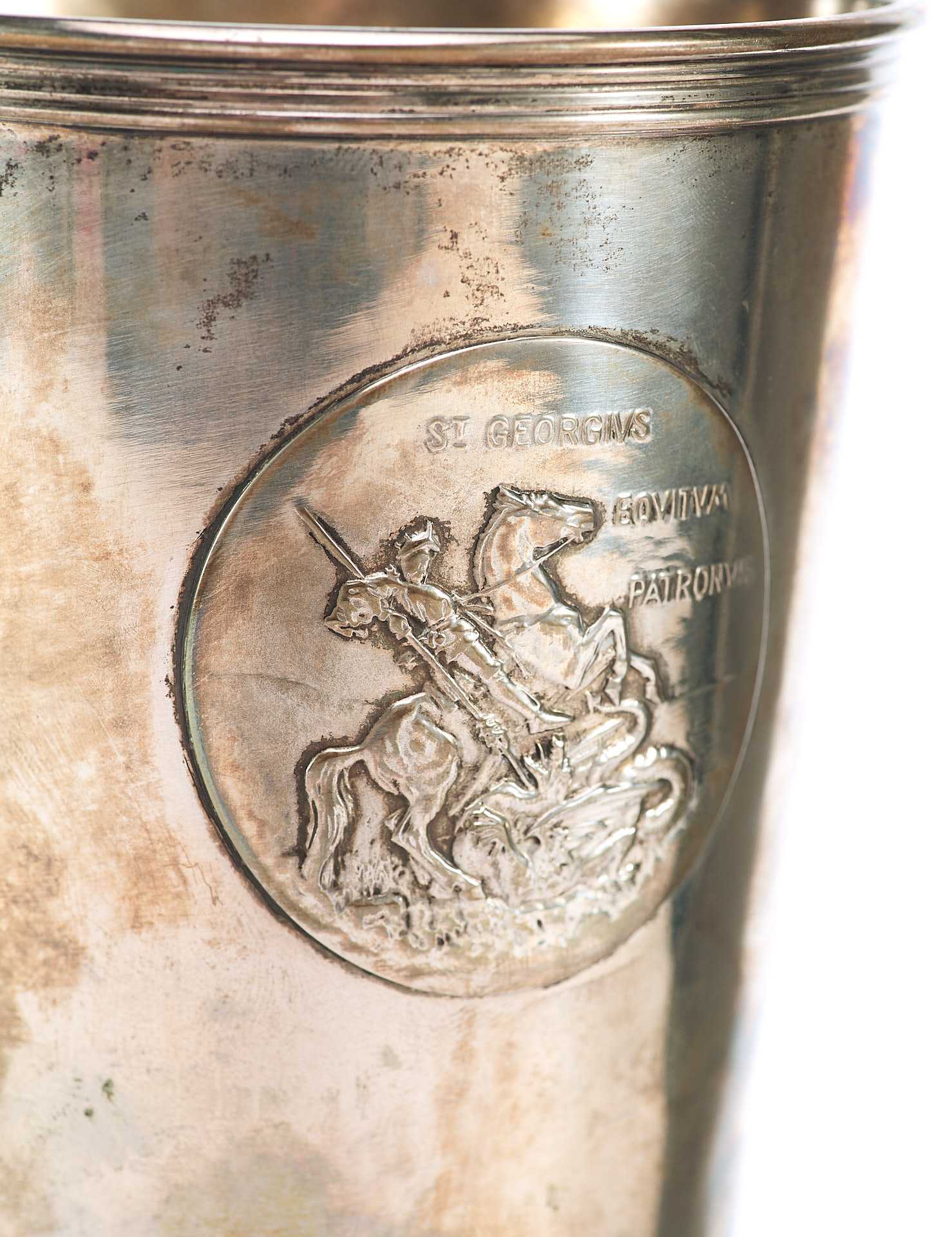 Клейма подлинные. Их наличие позволяет установить, что стакан изготовлен на указанной фабрике в Вене (Австрия), в период 1872 — 1922 гг. Св. Георгий изображен на коне, в развевающемся плаще и с острым копьем в руках. Под копытами коня - погибающий змей. Образ святого символизирует победу христианства над язычеством.