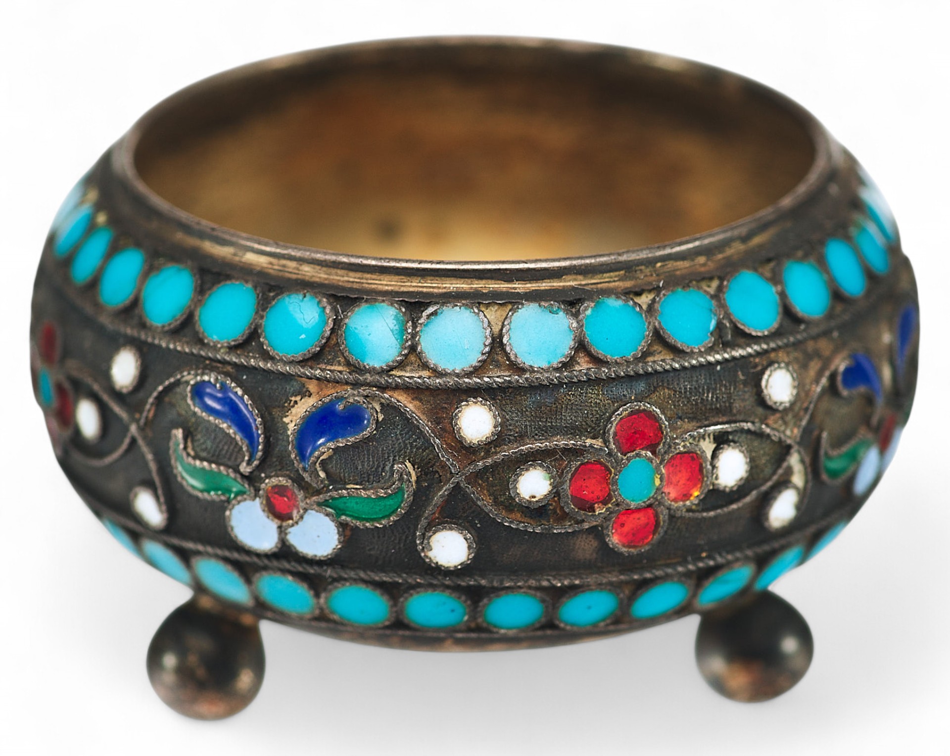 Солонка выполнена в так называемом «неорусском стиле», который отличает стремление к созданию национальных русских форм и интерес к древнерусскому и народному искусству. В сфере декоративно-прикладного искусства своеобразным символом стиля является художественная эмаль, и, в частности, ее самая популярная в конце XIX - начале ХХ вв. техника - эмаль по скани.