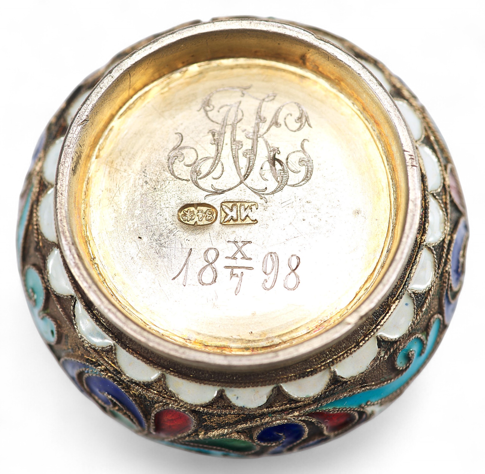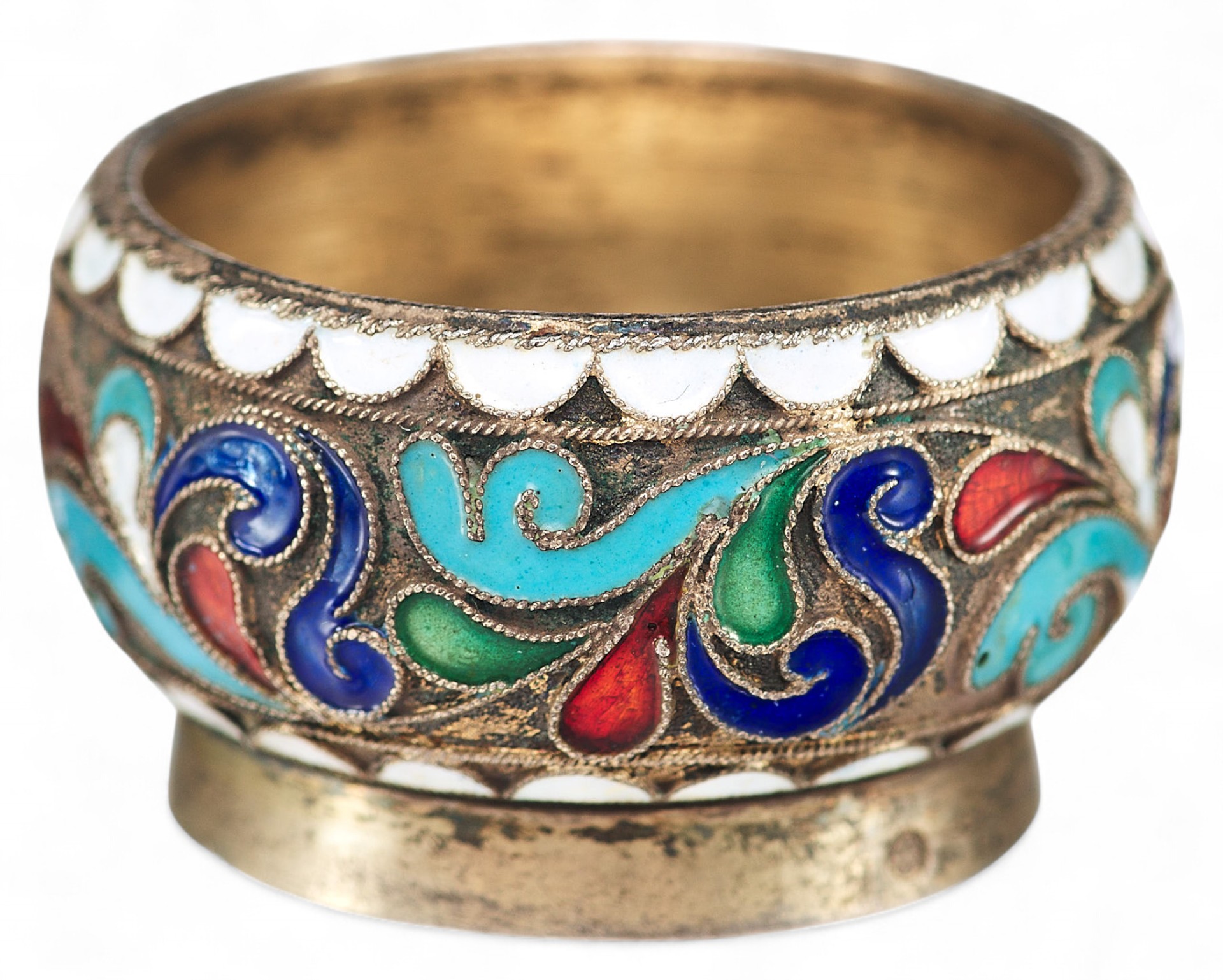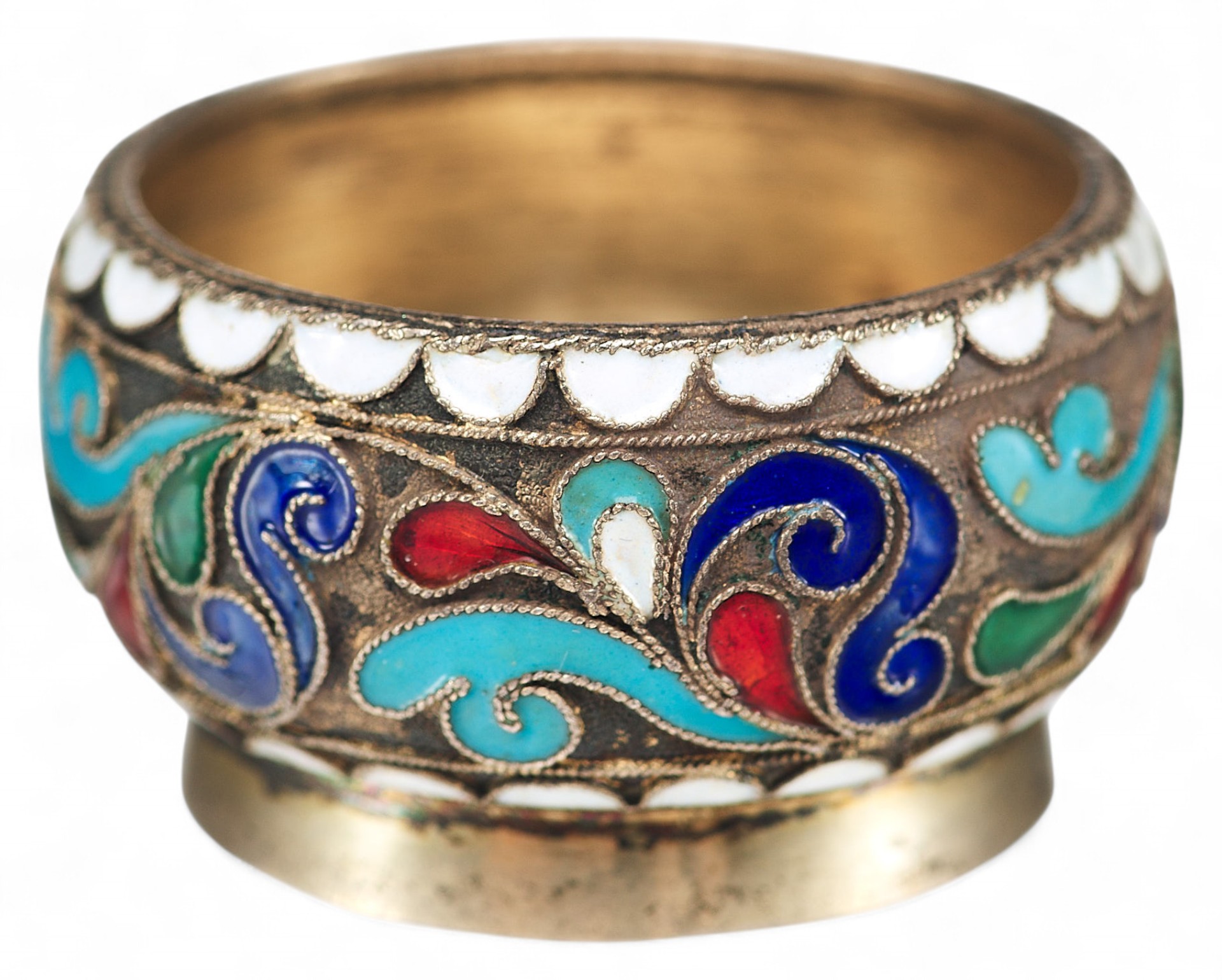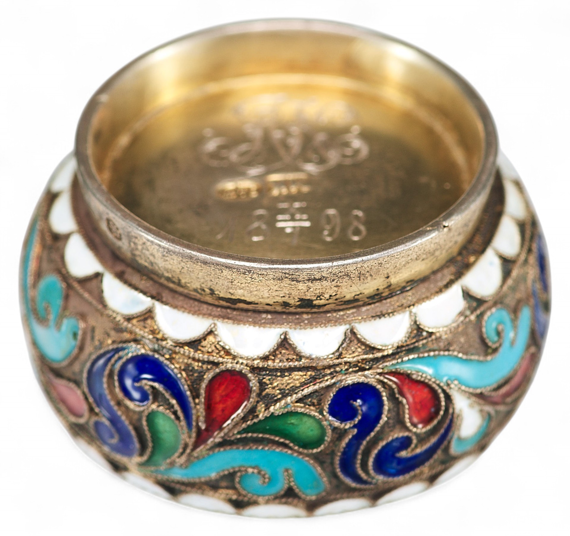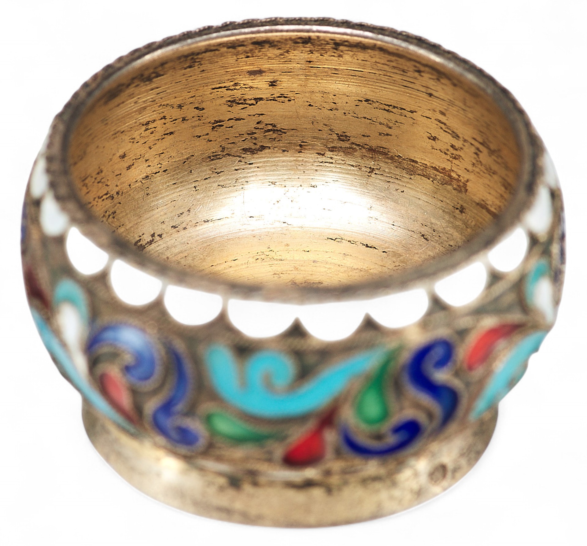 Солонка выполнена в так называемом «неорусском стиле», который отличает стремление к созданию национальных русских форм и интерес к древнерусскому и народному искусству. В сфере декоративно-прикладного искусства своеобразным символом стиля является художественная эмаль, и, в частности, ее самая популярная в конце XIX - начале ХХ вв. техника - эмаль по скани.