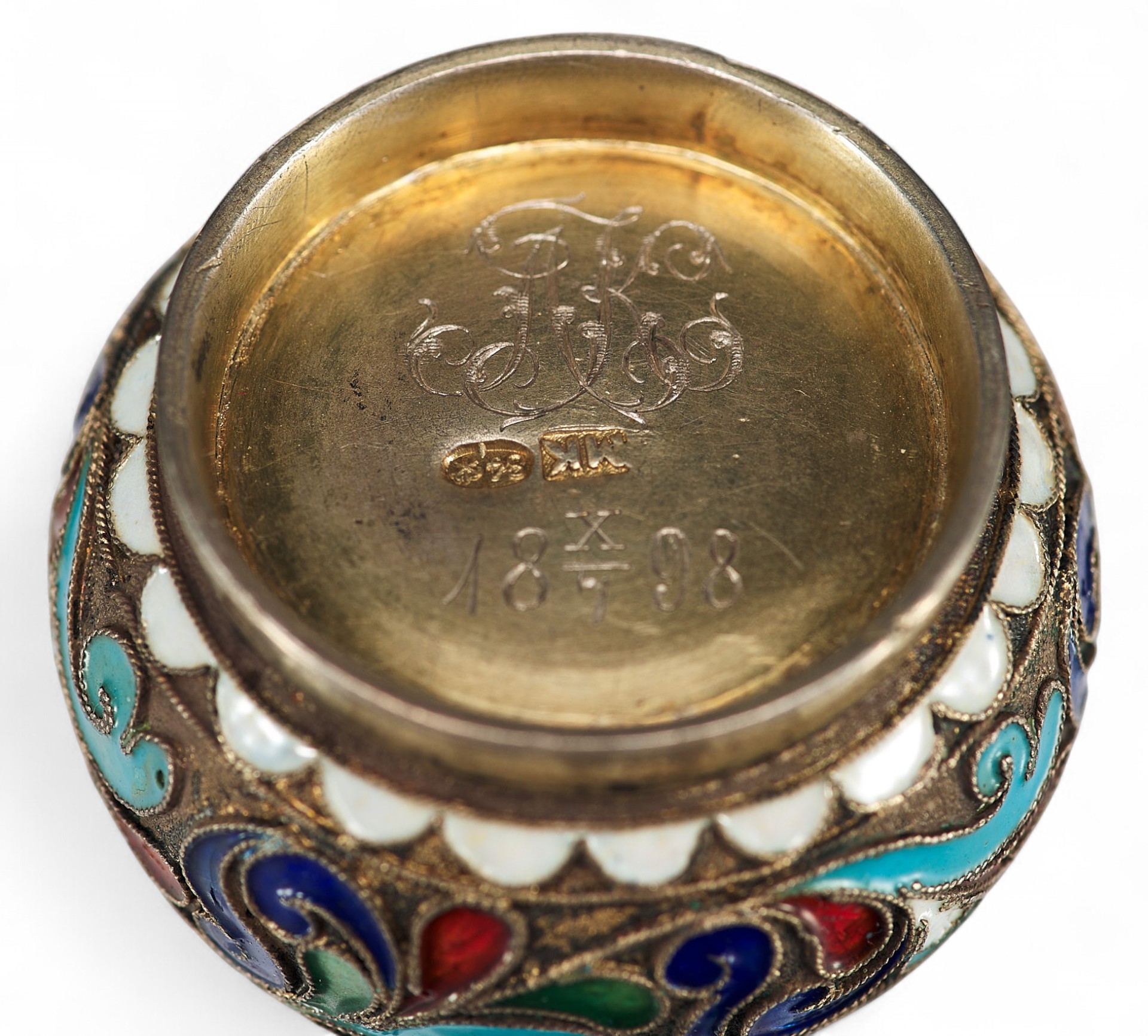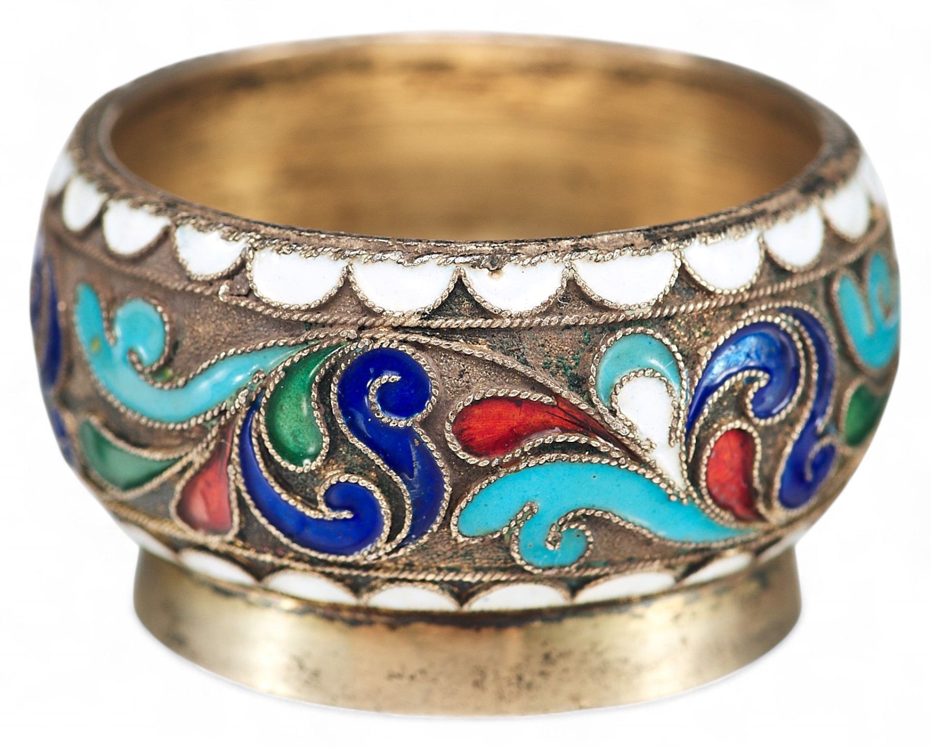 Солонка вьполнена в так называемом «неорусском стиле», который отличает стремление к созданию национальных русских форм и интерес к древнерусскому и народному искусству. В сфере декоративно-прикладного искусства своеобразным символом стиля является художественная эмаль, и, в частности, ее самая популярная в конце XIX - начале ХХ вв. техника - эмаль по скани.
