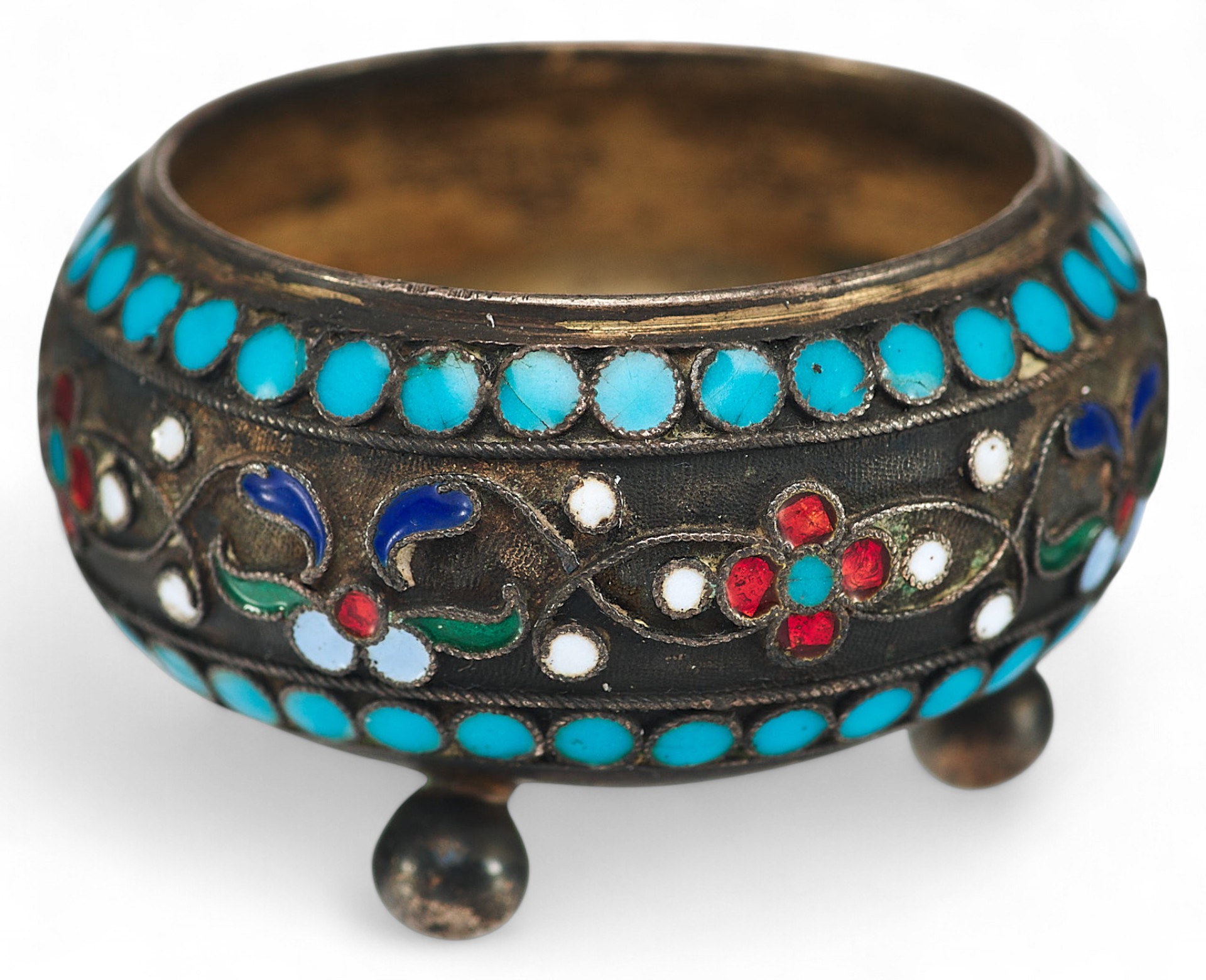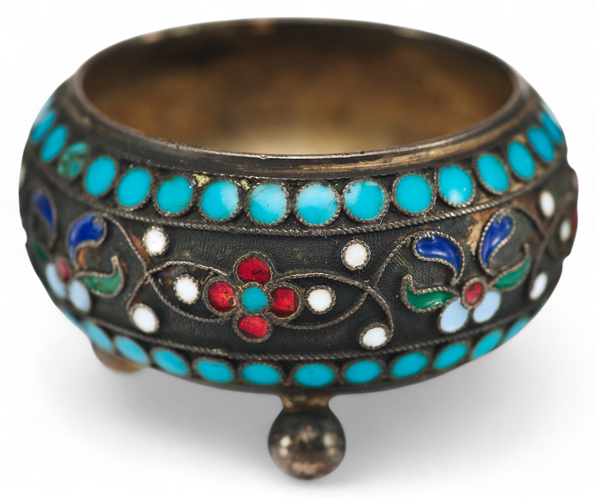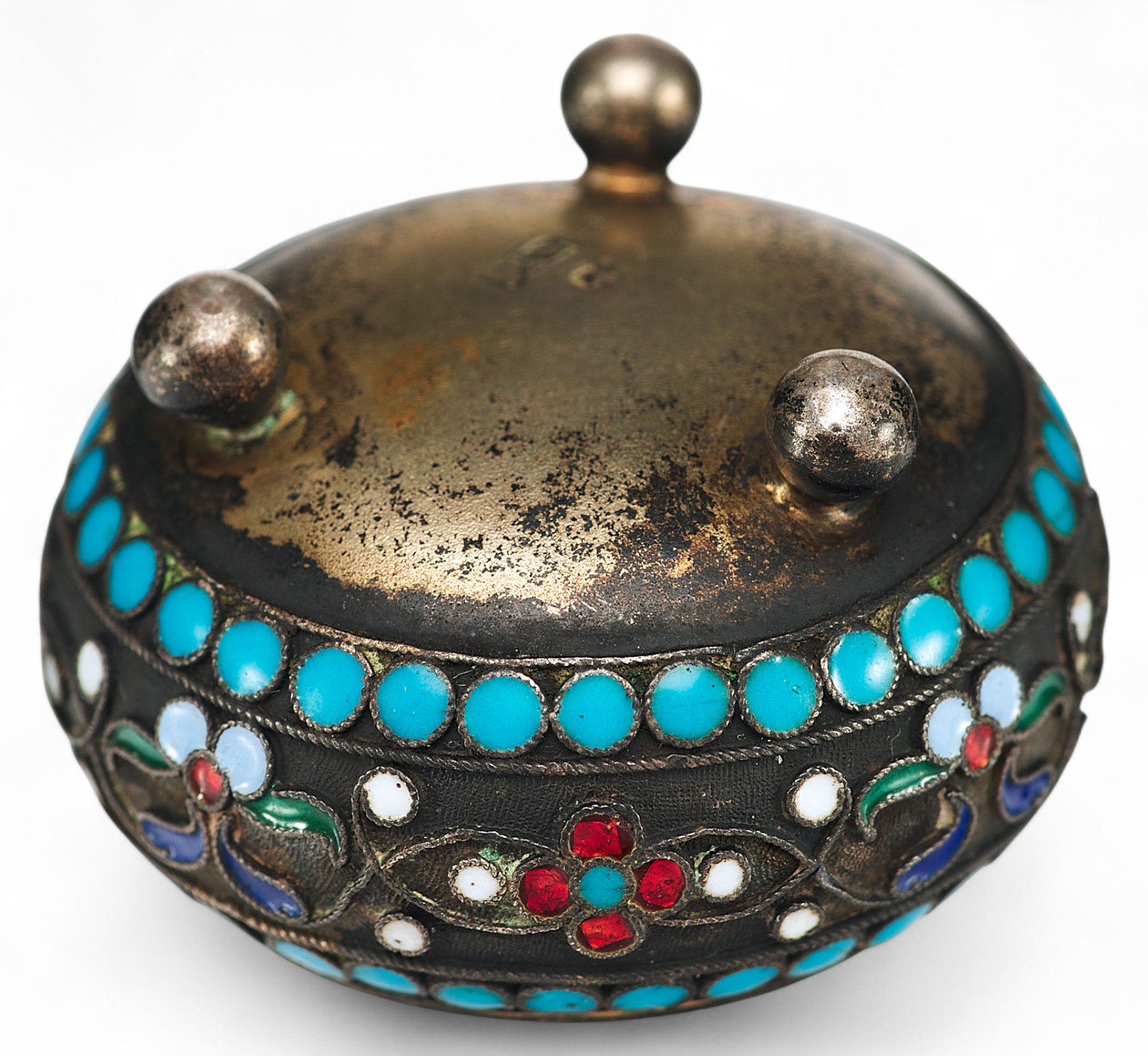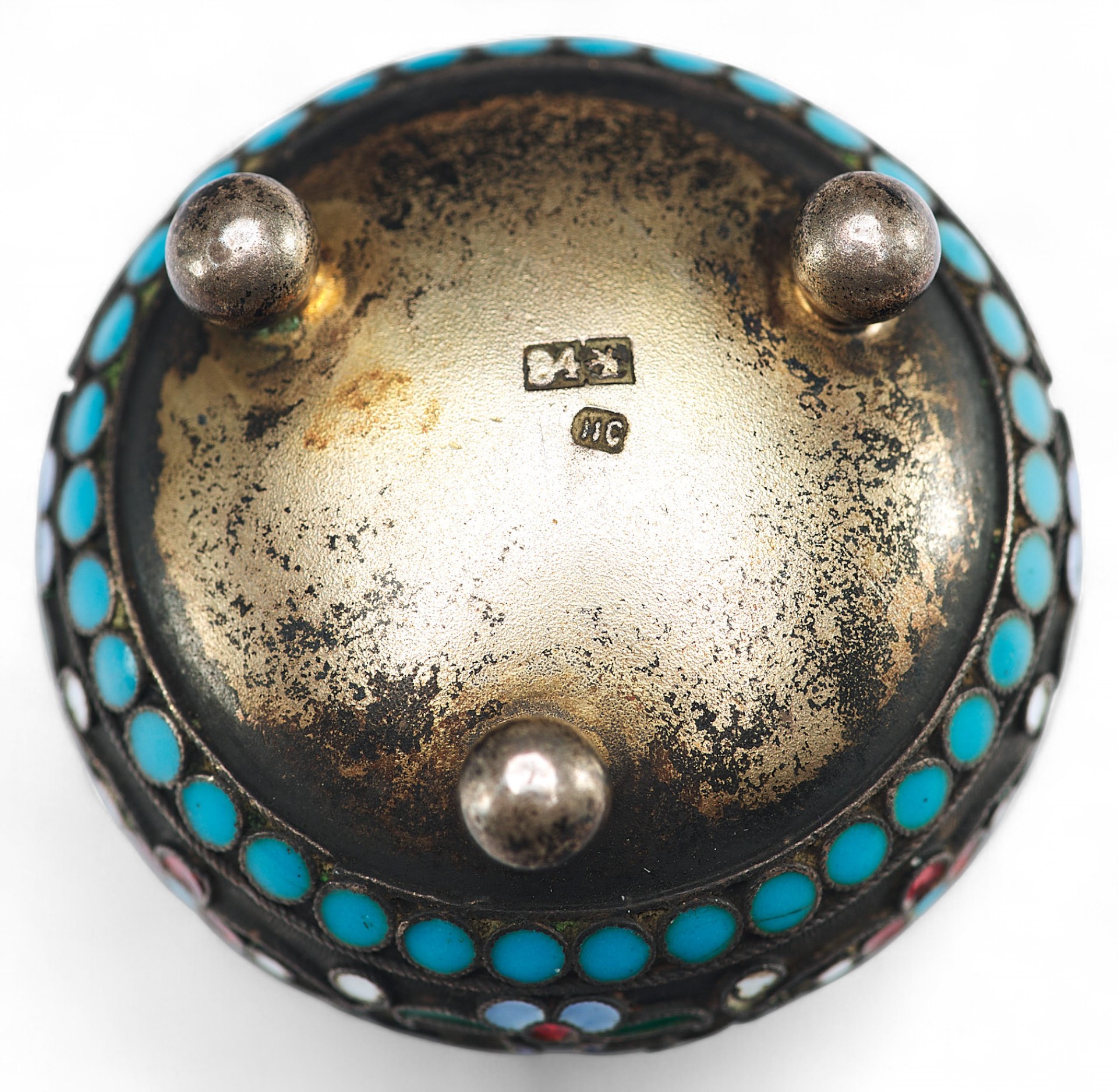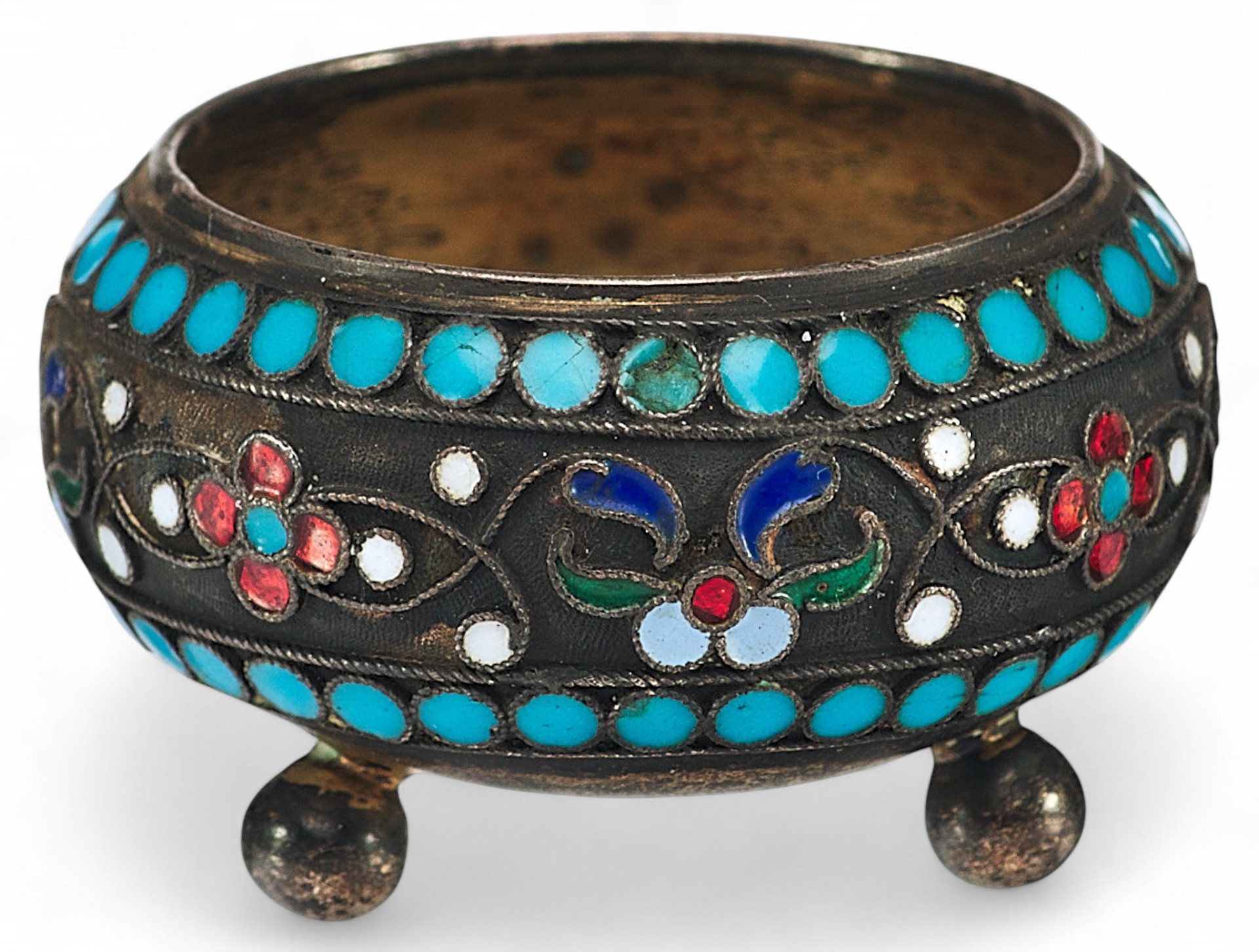 Принадлежность изделия к началу ХХ века подчеркивает использование широкой цветовой палитры эмалей.