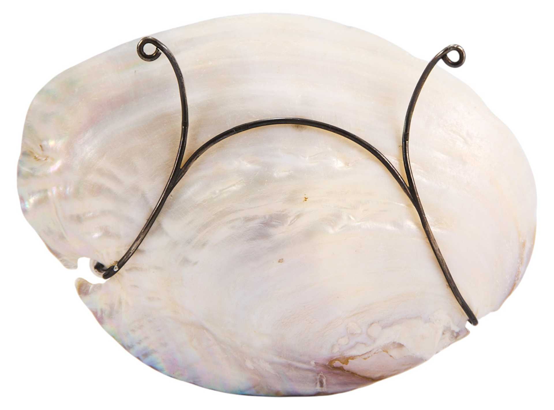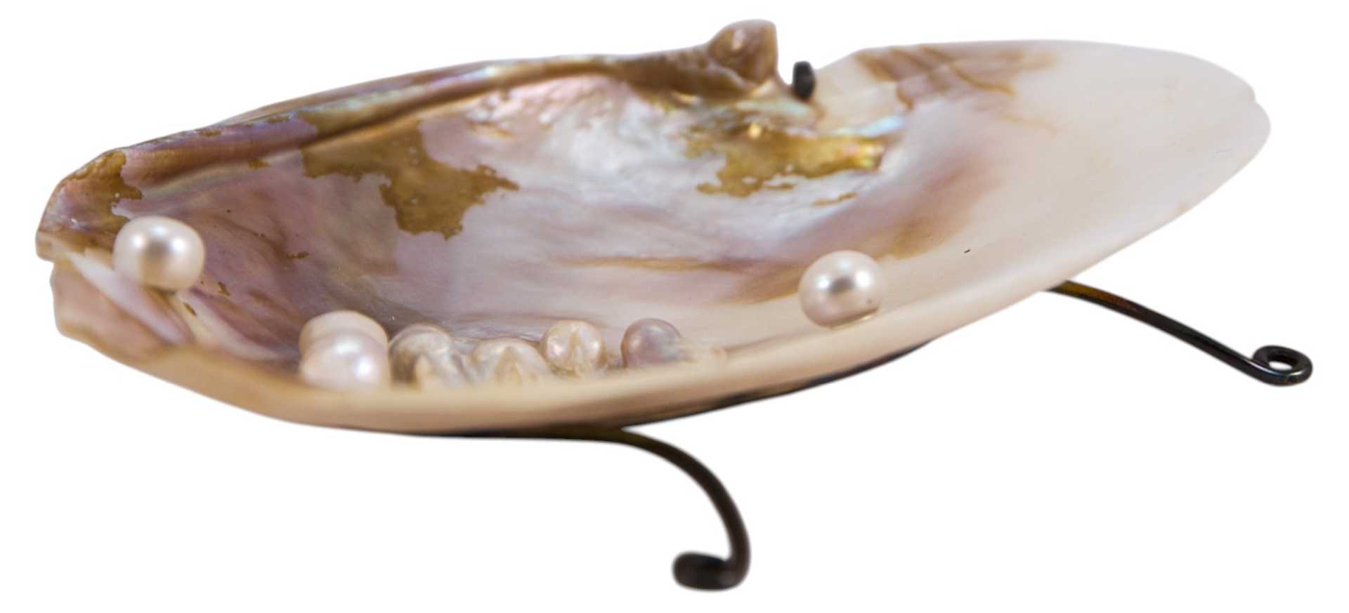 На подставке из толстой серебряной проволоки большая перламутровая раковина овальной формы. На внутренней поверхности раковины причудливые наросты, а также несколько круглых жемчужин. По краю раковины естественные золотистые разводы.