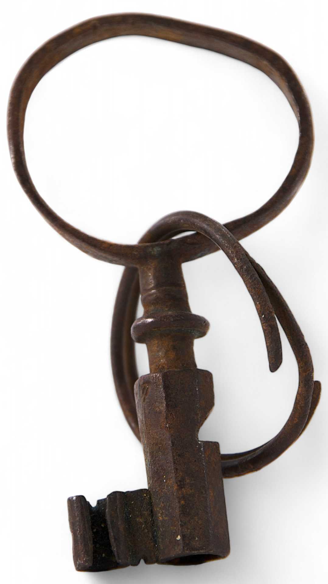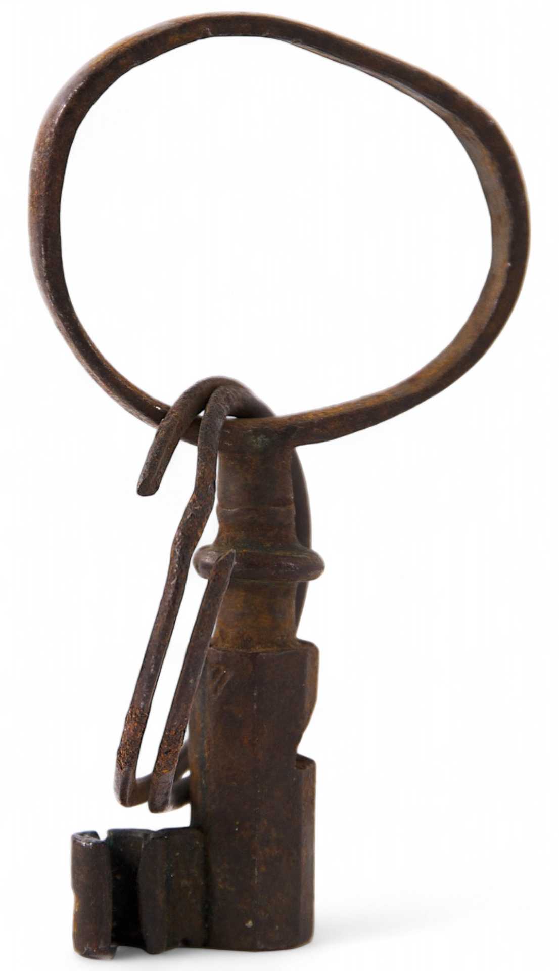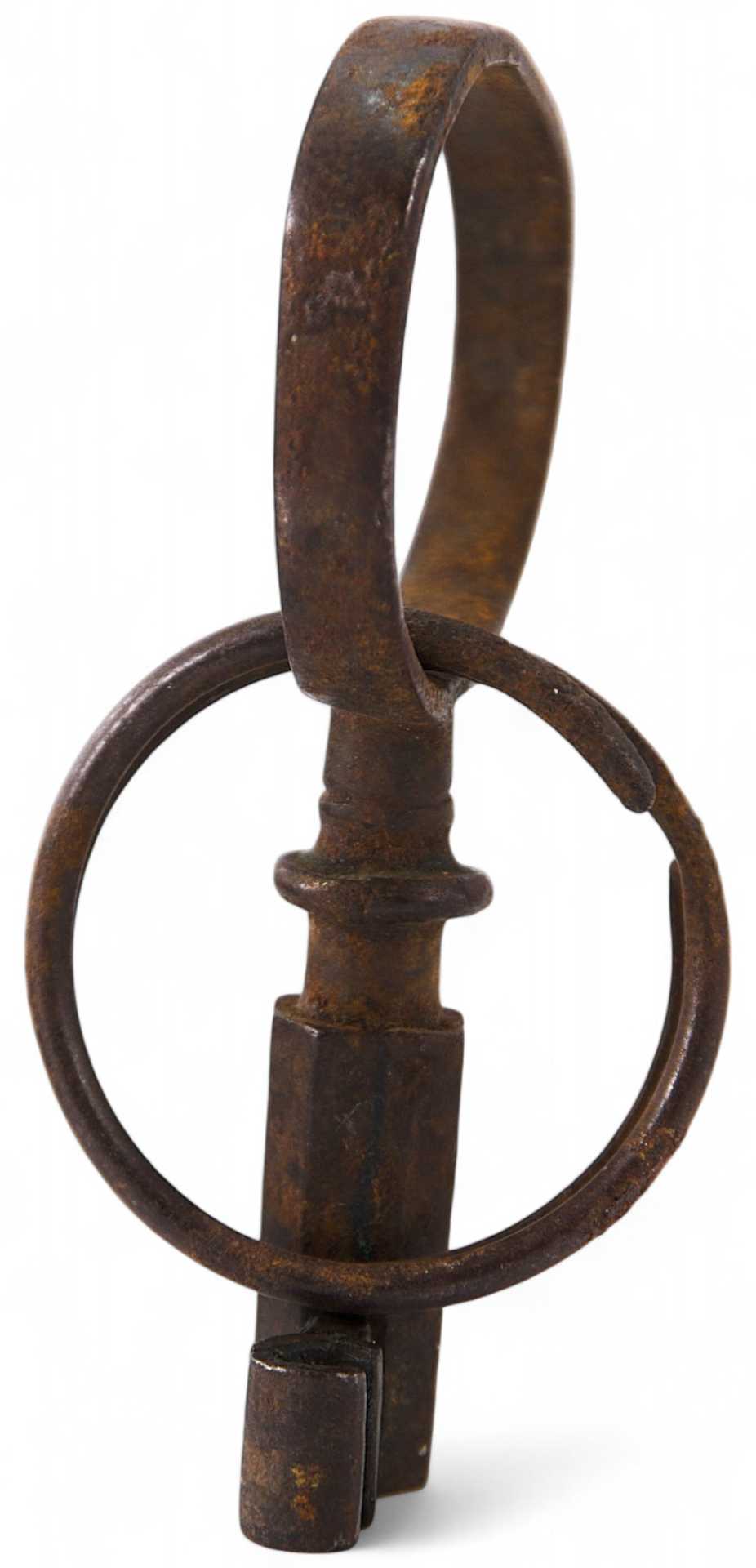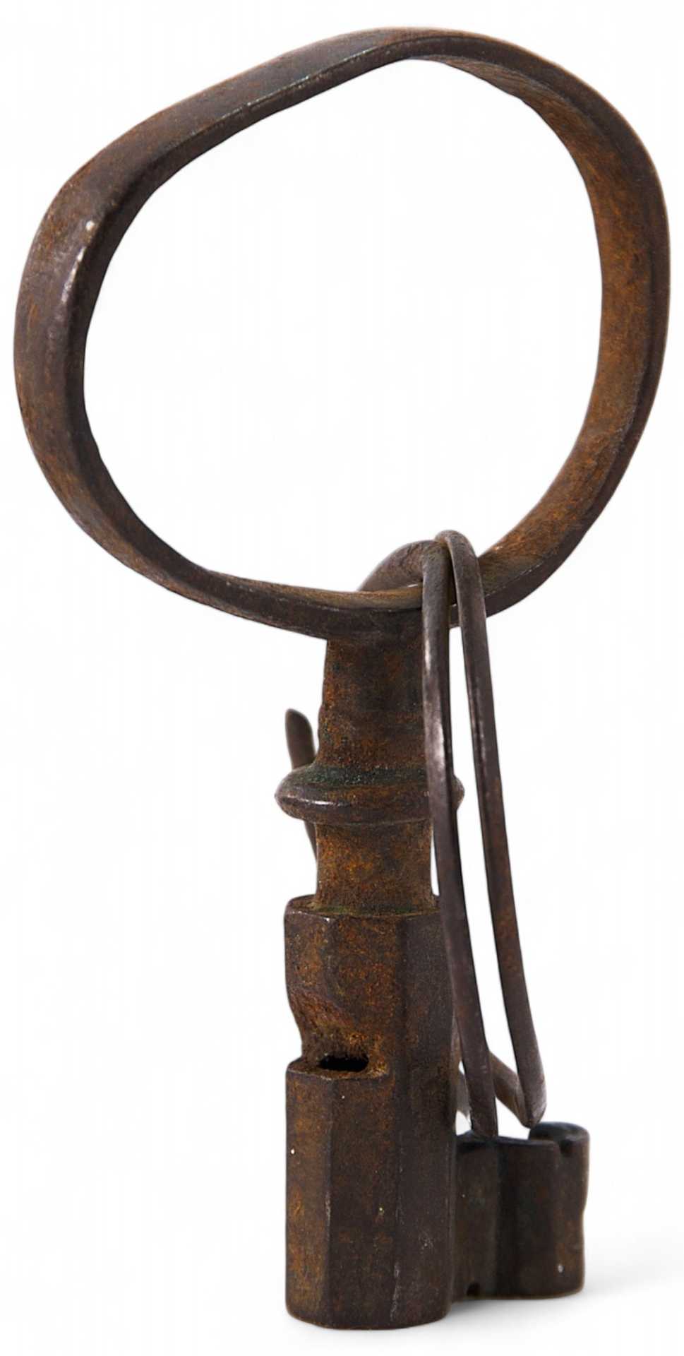 Представлен ключ для навесного амбарного замка. Среди самых распространенных дверных замков преобладали навесные (назывались часто "вислыми”, “висячими”). Их производство было спецификой Павловских мастеров, в отличие, от туляков или пермяков, специализировавшихся преимущественно на изготовлении врезных замков. В XVIII — XIX веках в селе Павлово Нижегородской губернии Горбатовского уезда изготовляли шкатулочные фантазийные, объемные анималистические, плоские силуэтные, сундучные, конные, дверные и другие. Кроме Павлова — крупного центра замочного дела — замки изготавливались в других районах Нижнего Новгорода, а также таких российских городах, как Устюжна-Железнопольская, Тихвин, Москва, Каргополь, в районах Каширы, Тулы, Уральского края, в частности, в Пермской губернии, где были сосредоточены все виды промыслов по обработке металлов.