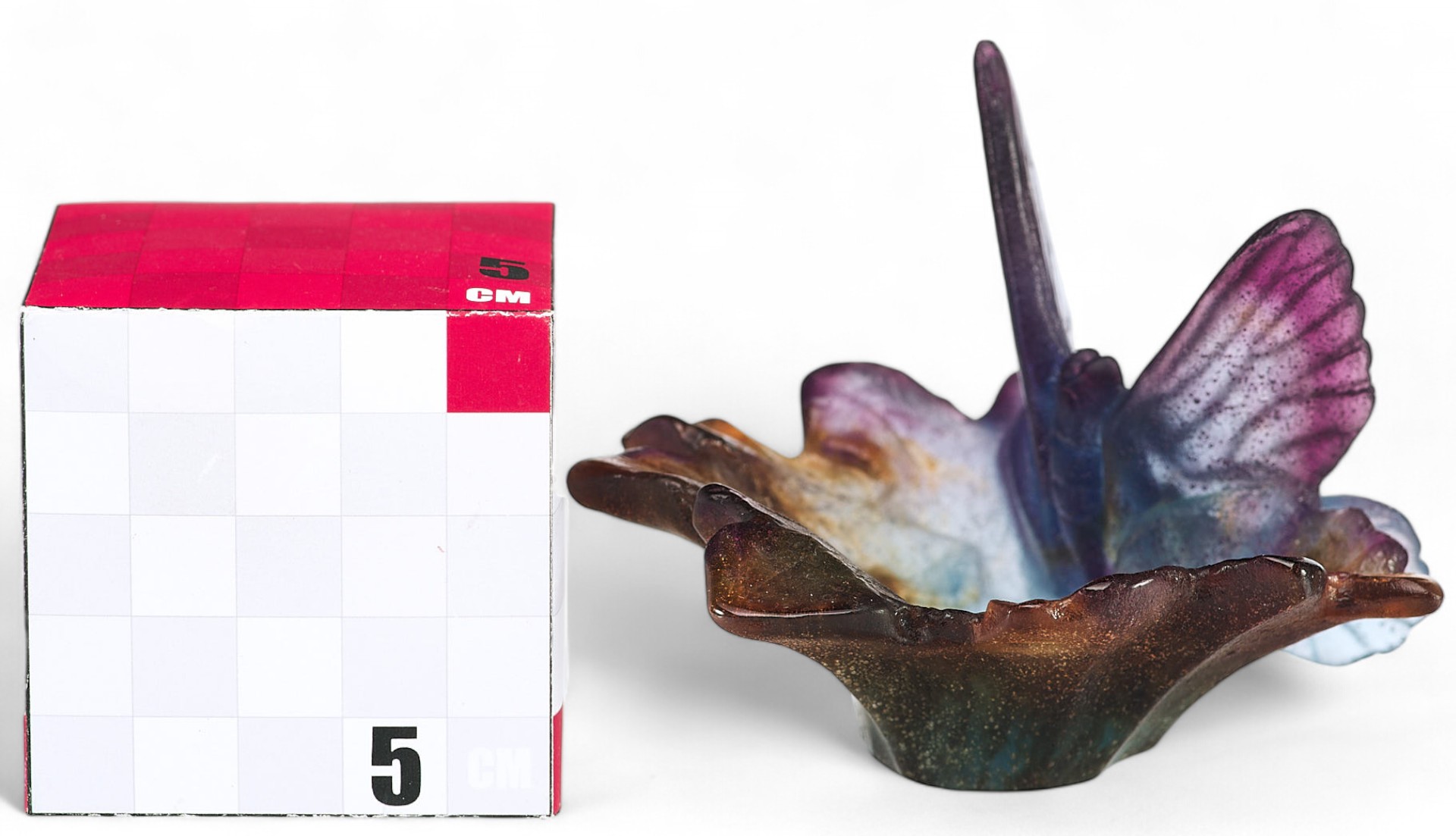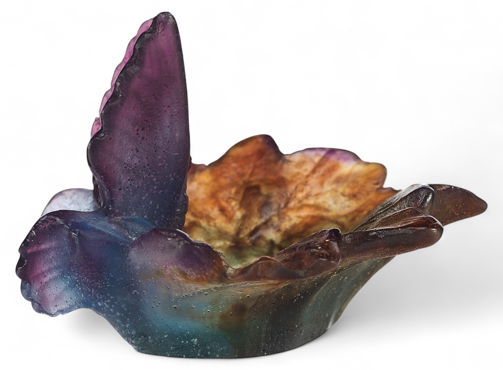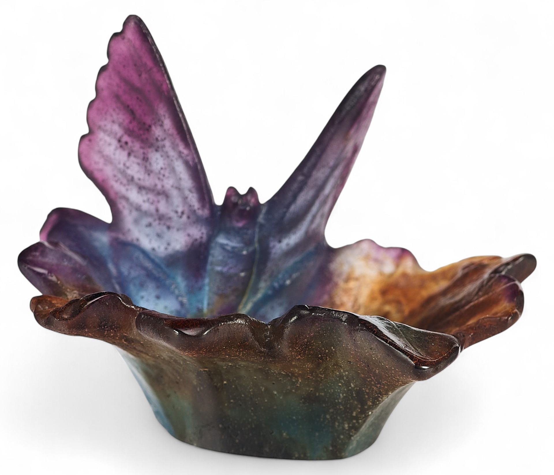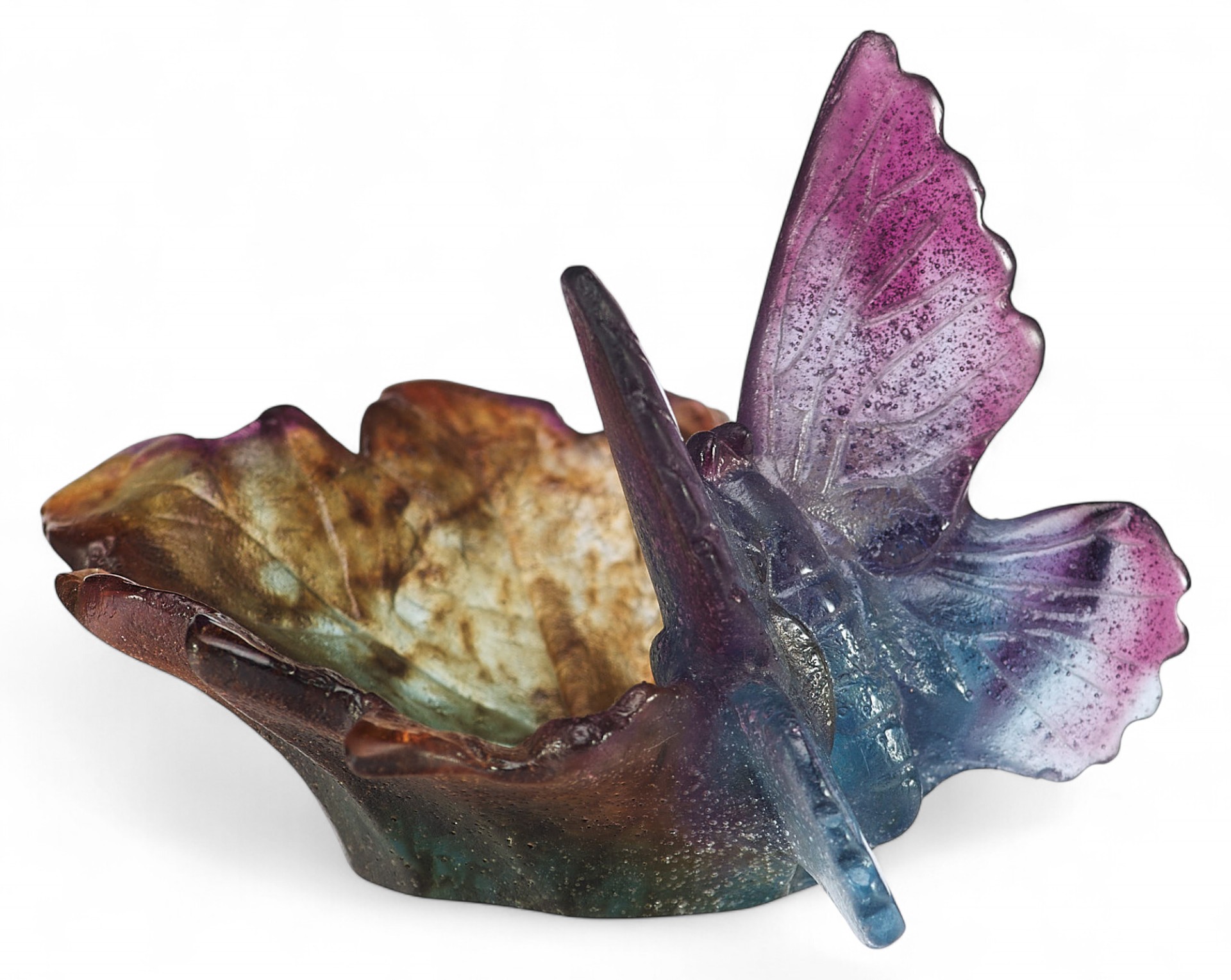 Чаша в виде листочка с фигуркой бабочки. На основании надпись: “Daum Nancy”. Изделие изготовлено по модели художника Амальрика Вальтера (Victor Amalric Walter, 1870 — 1959), который пришел на фирму “Братья Дом” в 1906 году. Сын художника Севрской мануфактуры, А. Вальтер с 1885 года обучался в циональной школе керамики Севра, а с 1887 по 1892 года занимался на Севрской мануфактуре декорированием фарфора. В собственной мастерской, которую он устроил в 1895 году, А. Вальтер разрабатывает глазурованные покрытия фаянсовых изделий.