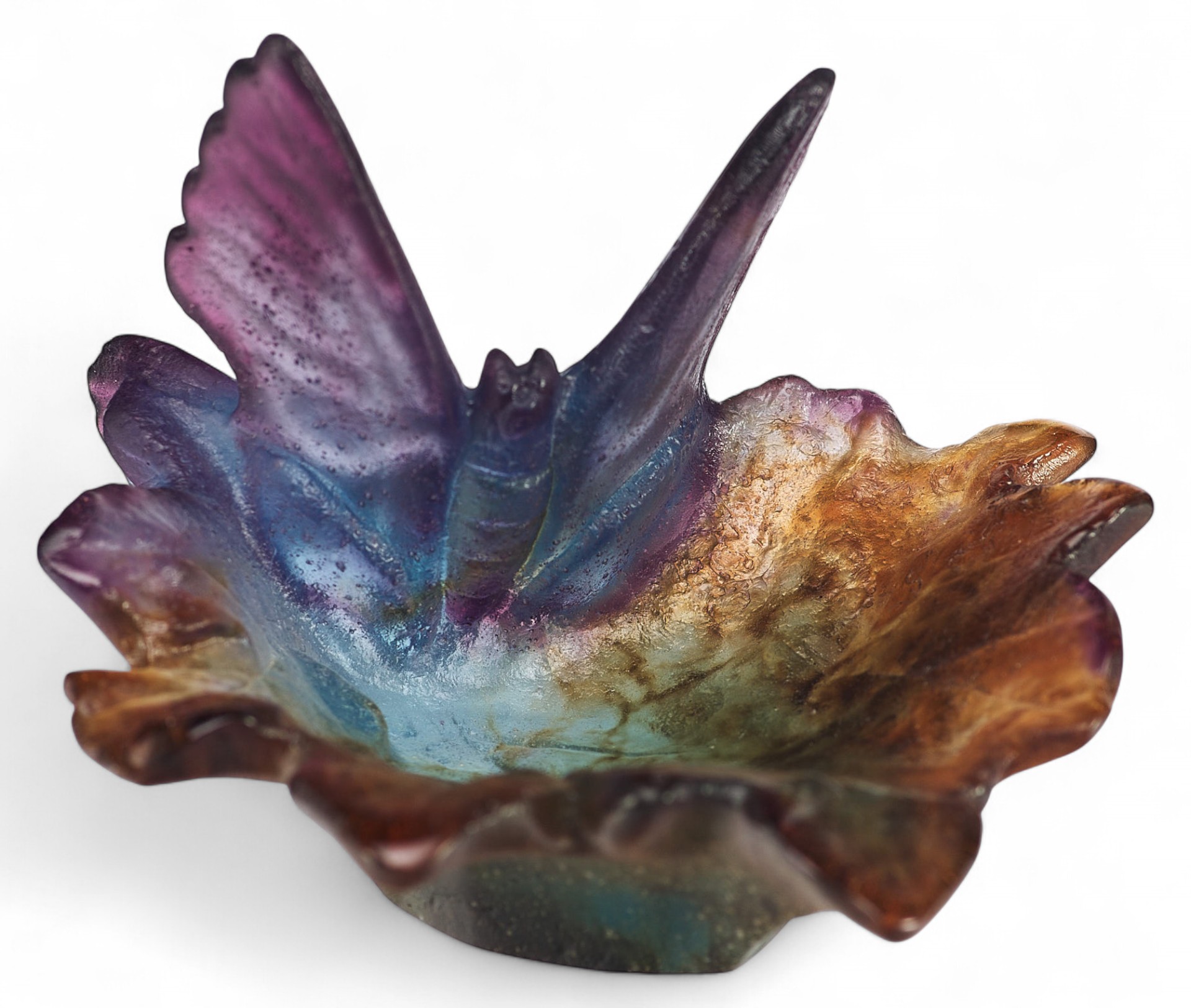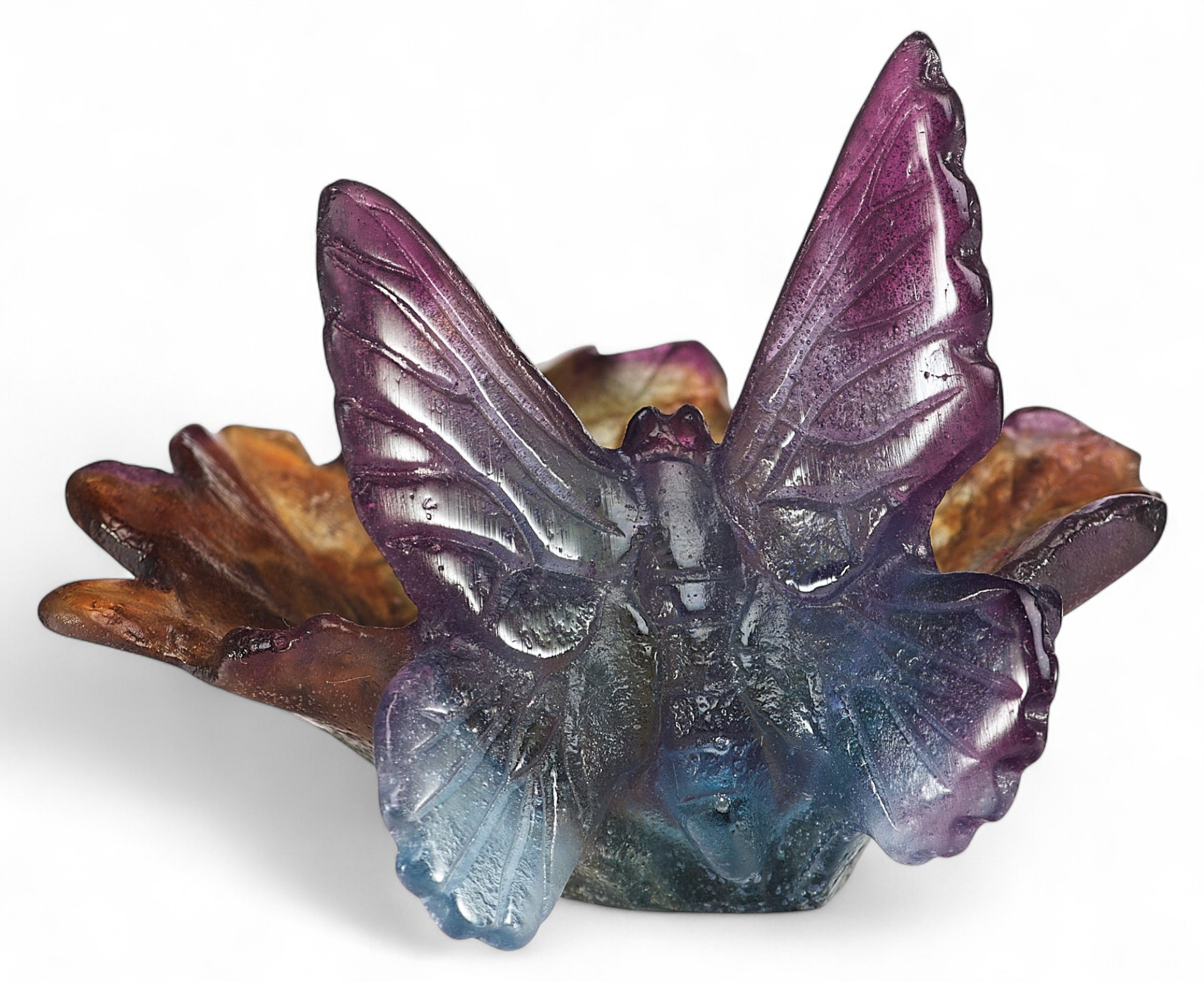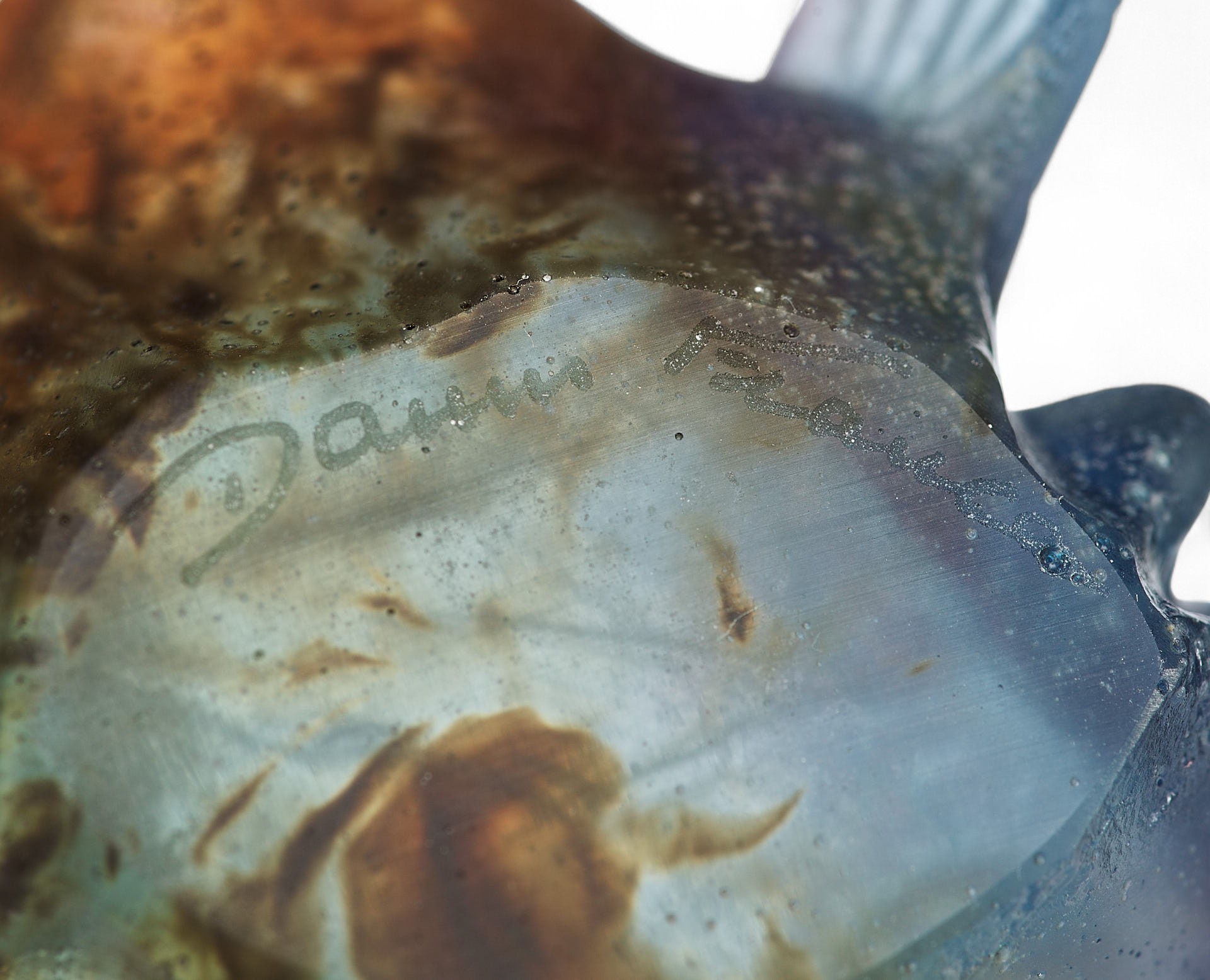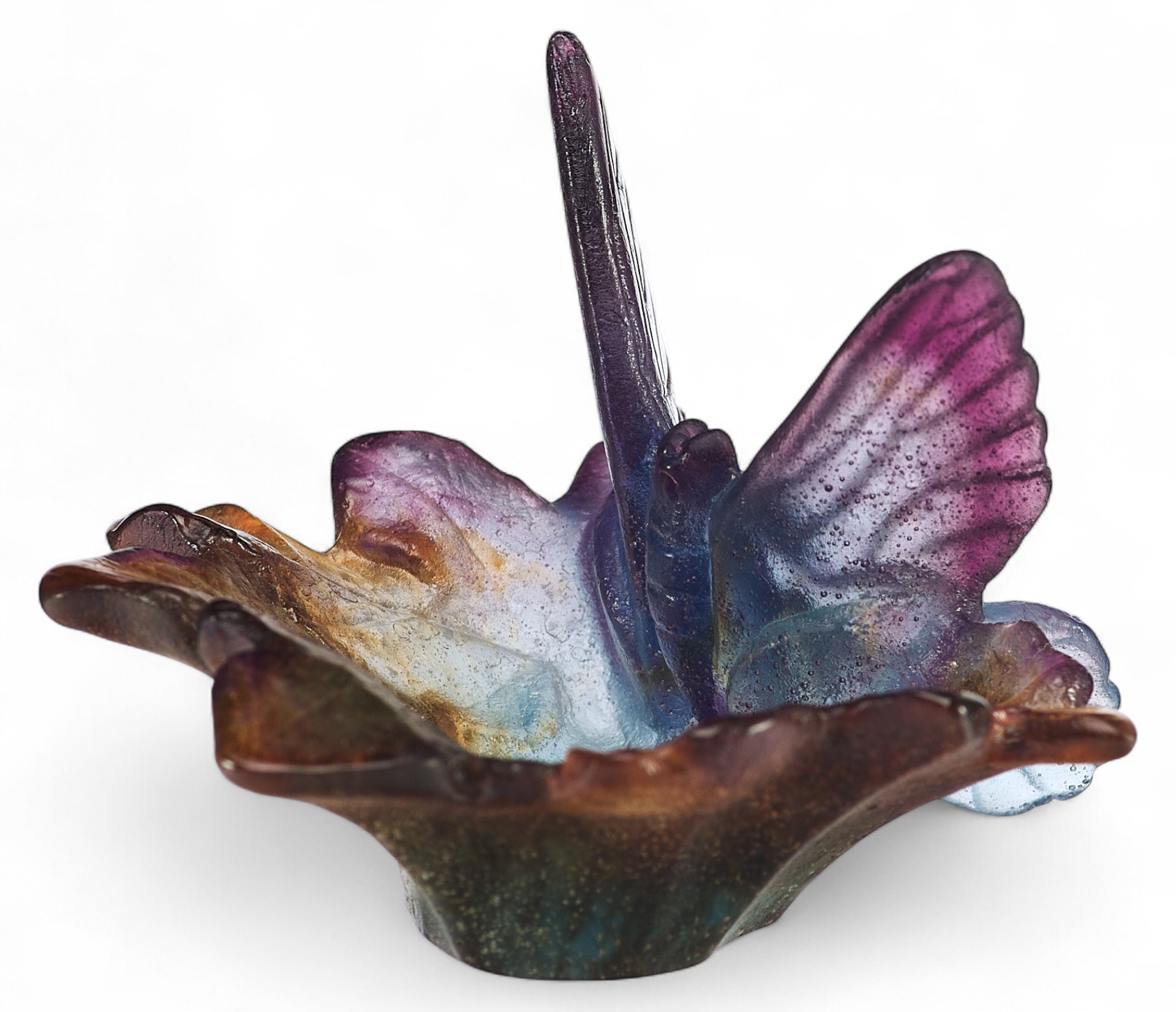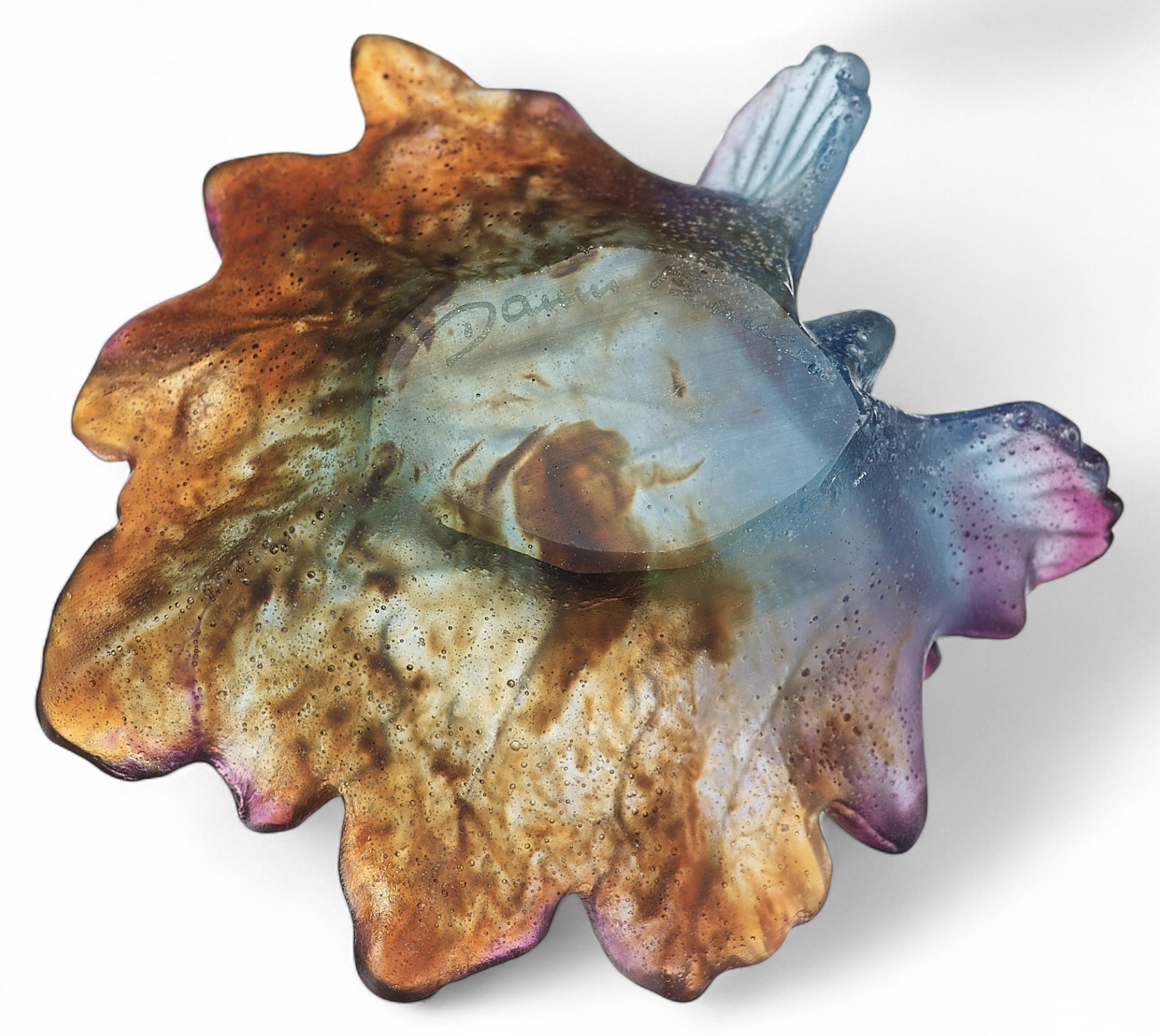 Чаша в виде листочка с фигуркой бабочки. На основании надпись: “Daum Nancy”. Изделие изготовлено по модели художника Амальрика Вальтера (Victor Amalric Walter, 1870 — 1959), который пришел на фирму “Братья Дом” в 1906 году. Сын художника Севрской мануфактуры, А. Вальтер с 1885 года обучался в циональной школе керамики Севра, а с 1887 по 1892 года занимался на Севрской мануфактуре декорированием фарфора. В собственной мастерской, которую он устроил в 1895 году, А. Вальтер разрабатывает глазурованные покрытия фаянсовых изделий.