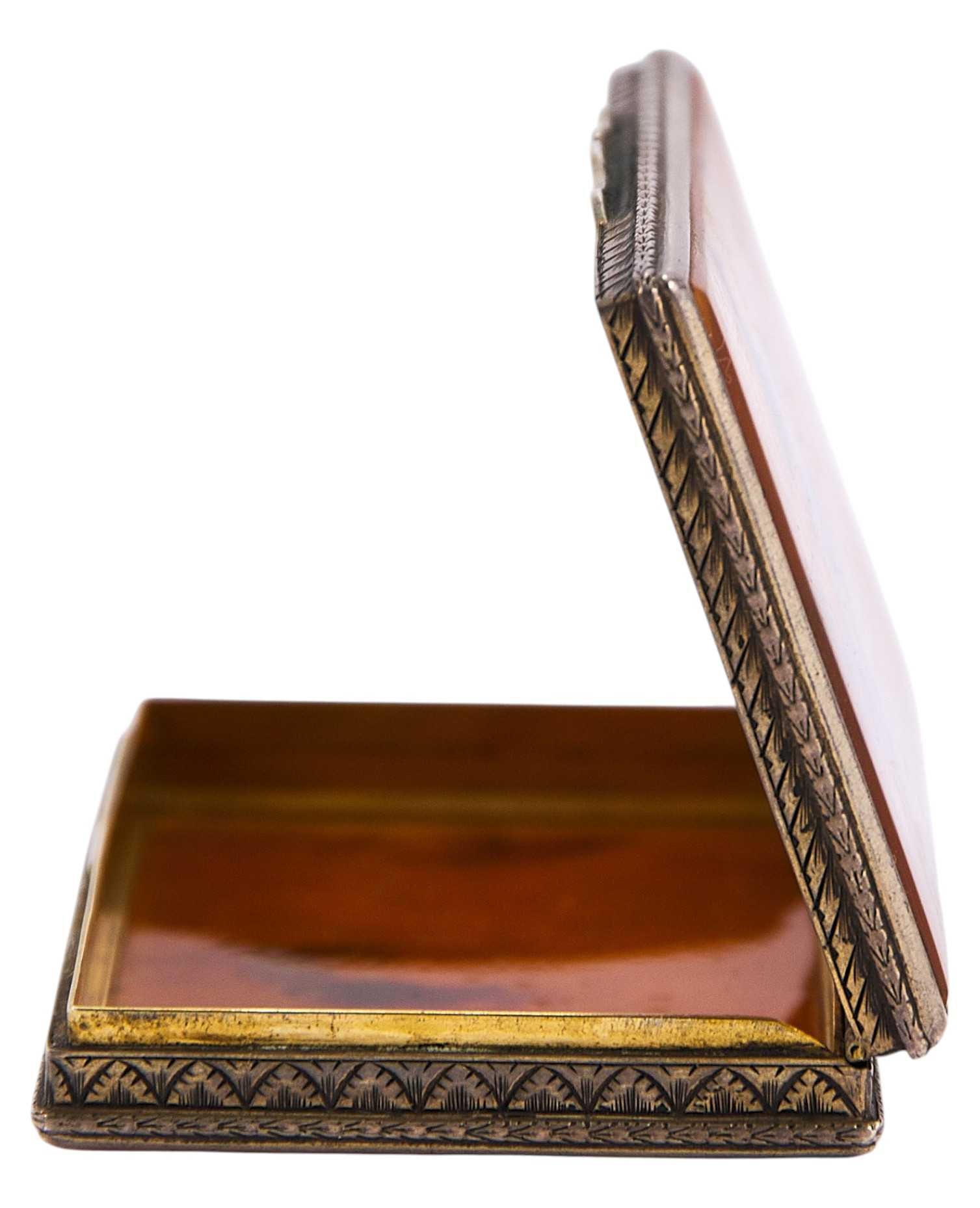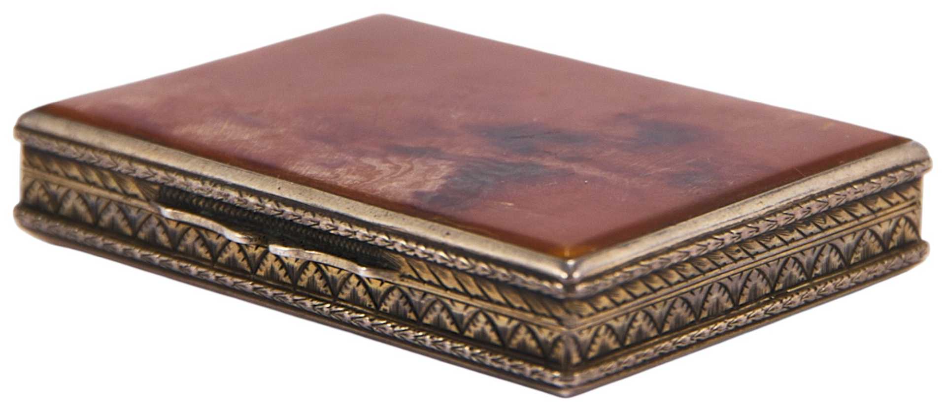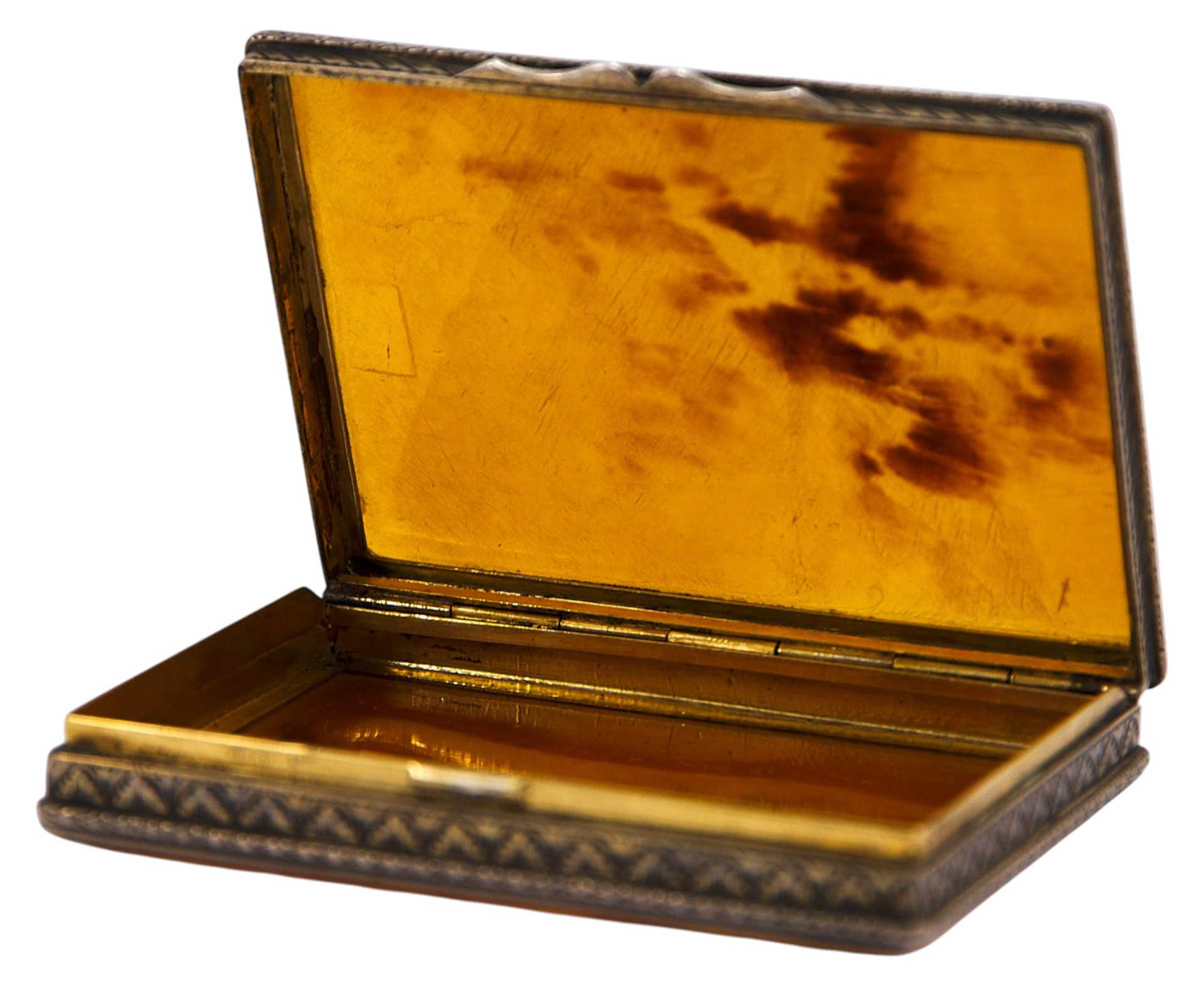 Представлена табакерка, основа которой изготовлена из серебра, а верхние и нижние крышки из черепаховых пластин.