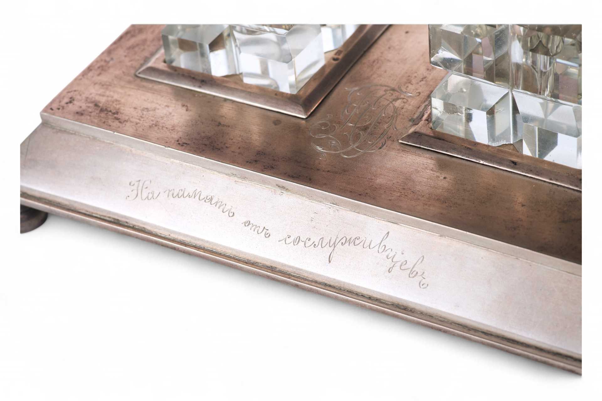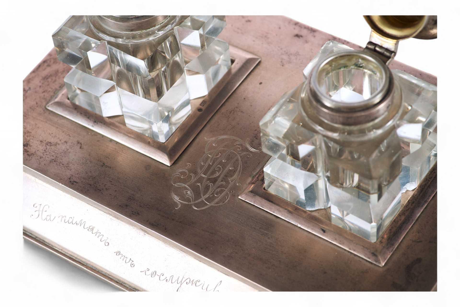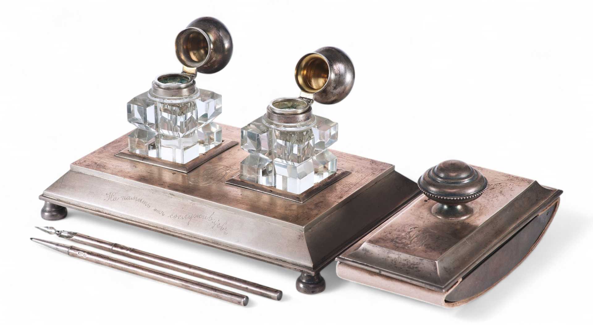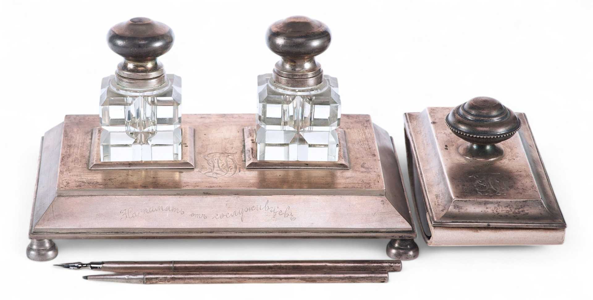 На чернильнице дарственная надпись: "На память отъ сослуживцевъ".