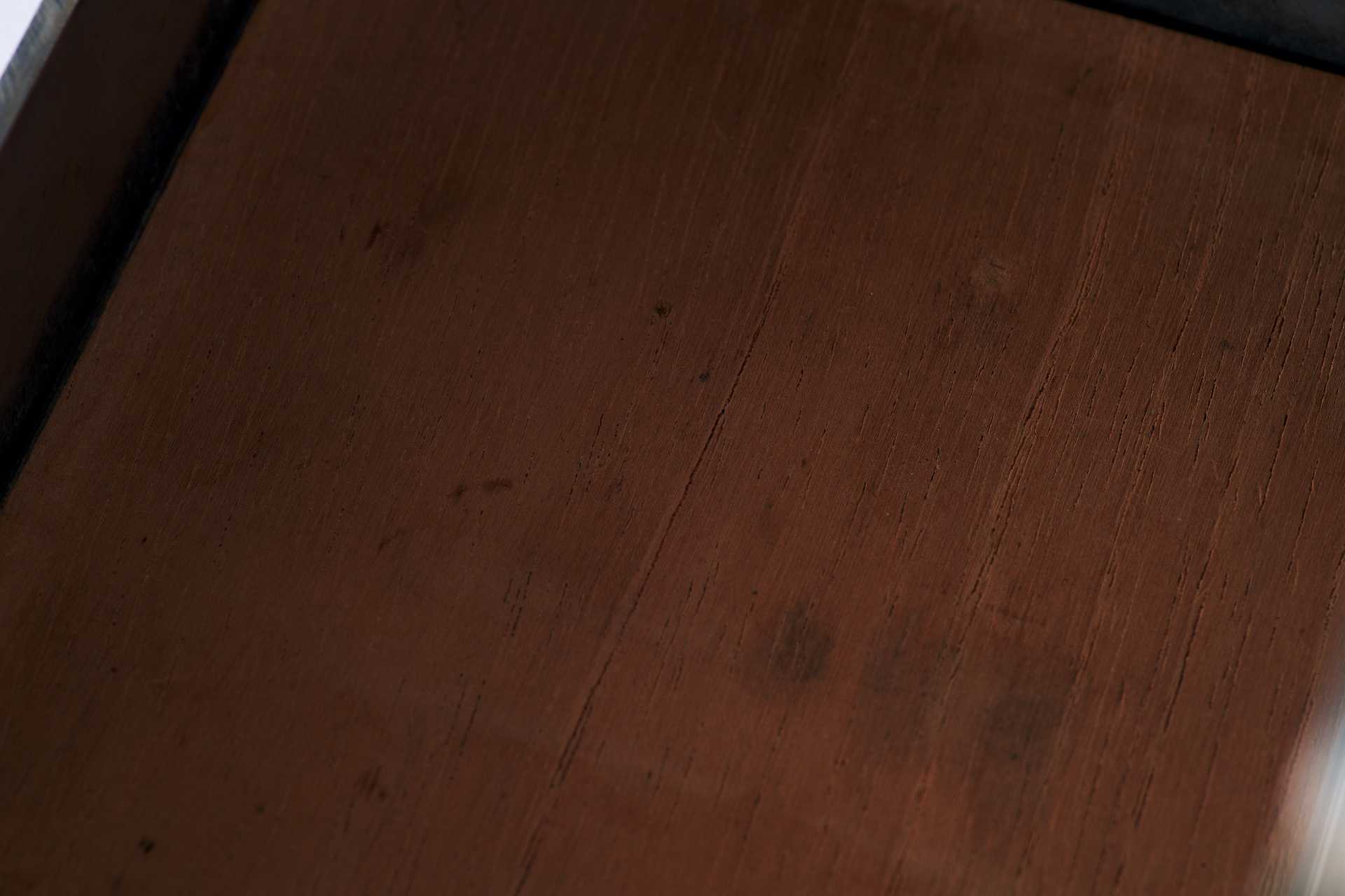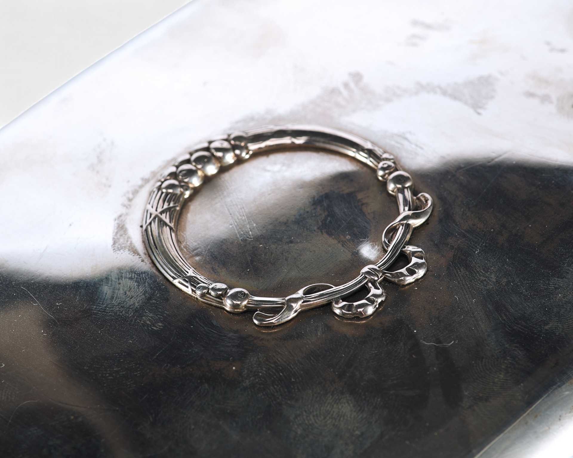 Представлена серебряная шкатулка на крышке, которой изображен самостоятельный орнаментальный элемент в виде кольца, украшенного бутонами роз с повязанной сверху лентой. Донце шкатулки выполнено из деревянной дощечки.