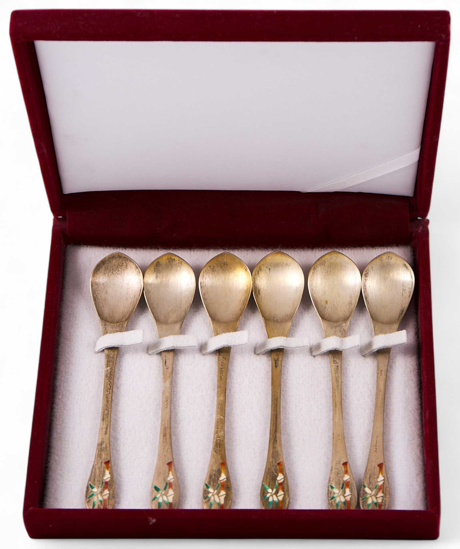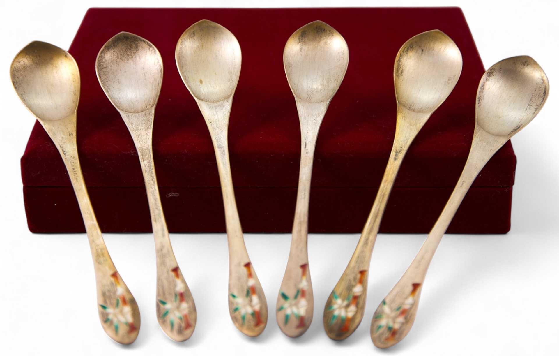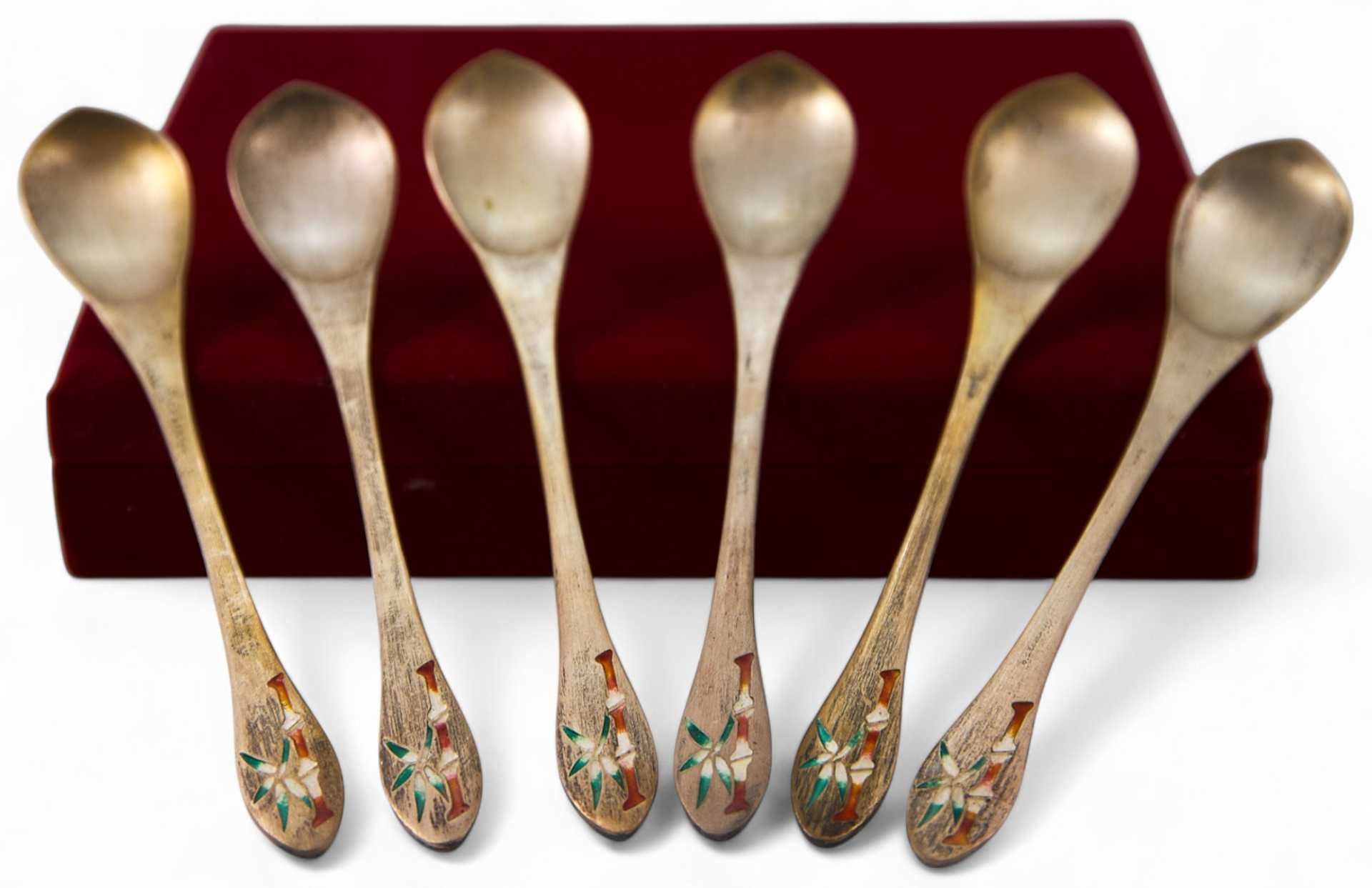 Набор из шести десертных ложек оформлен в восточном стиле и украшен цветными эмалевыми изображениями ветви бамбука, характерного символа восточной культуры, символизирующего стойкость и твердость характера. Набор отличается лаконичностью и оригинальностью исполнения, и вероятнее всего представляет собой подарочный вариант.