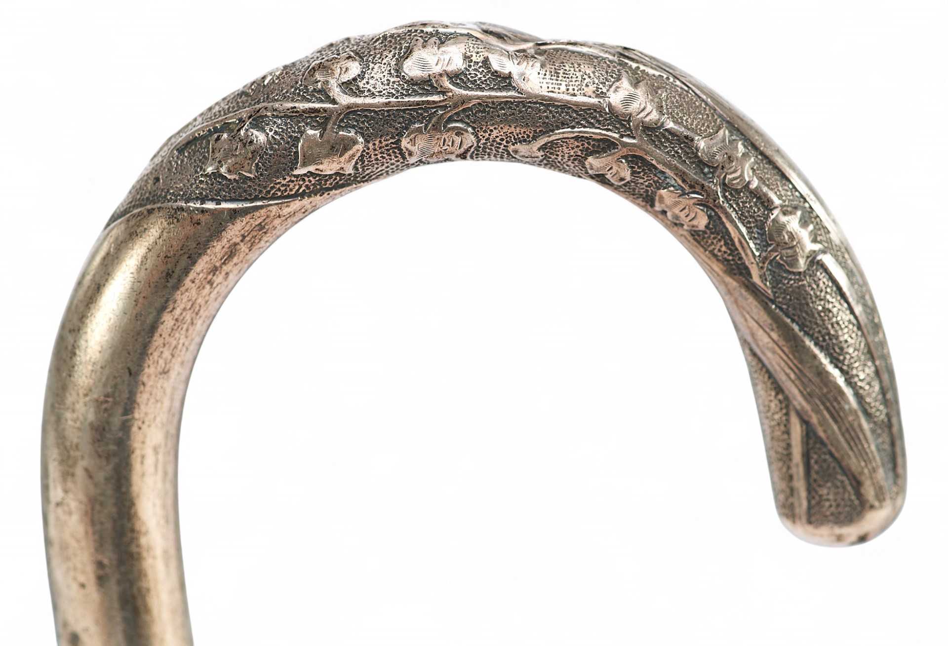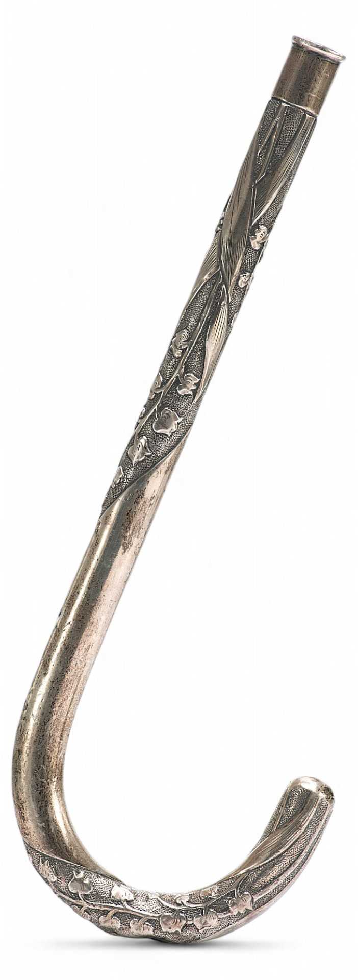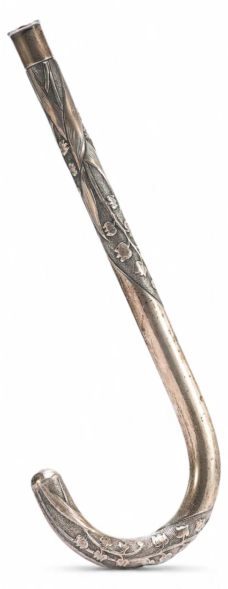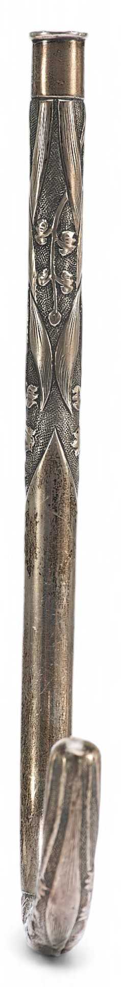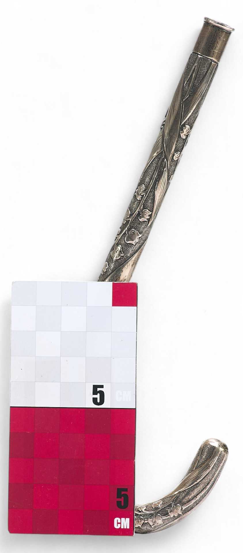 Наконечник на трость выполнен из серебра 800-й пробы с деревянной внутренней вставкой. Украшен характерным растительным стилизованным орнаментом, что свидетельствует о принадлежности изделия к стилю модерн, популярному на рубеже ХІХ-ХХ веков. Предмет выполнен на высоком техническом уровне, отличается изящностью исполнения.