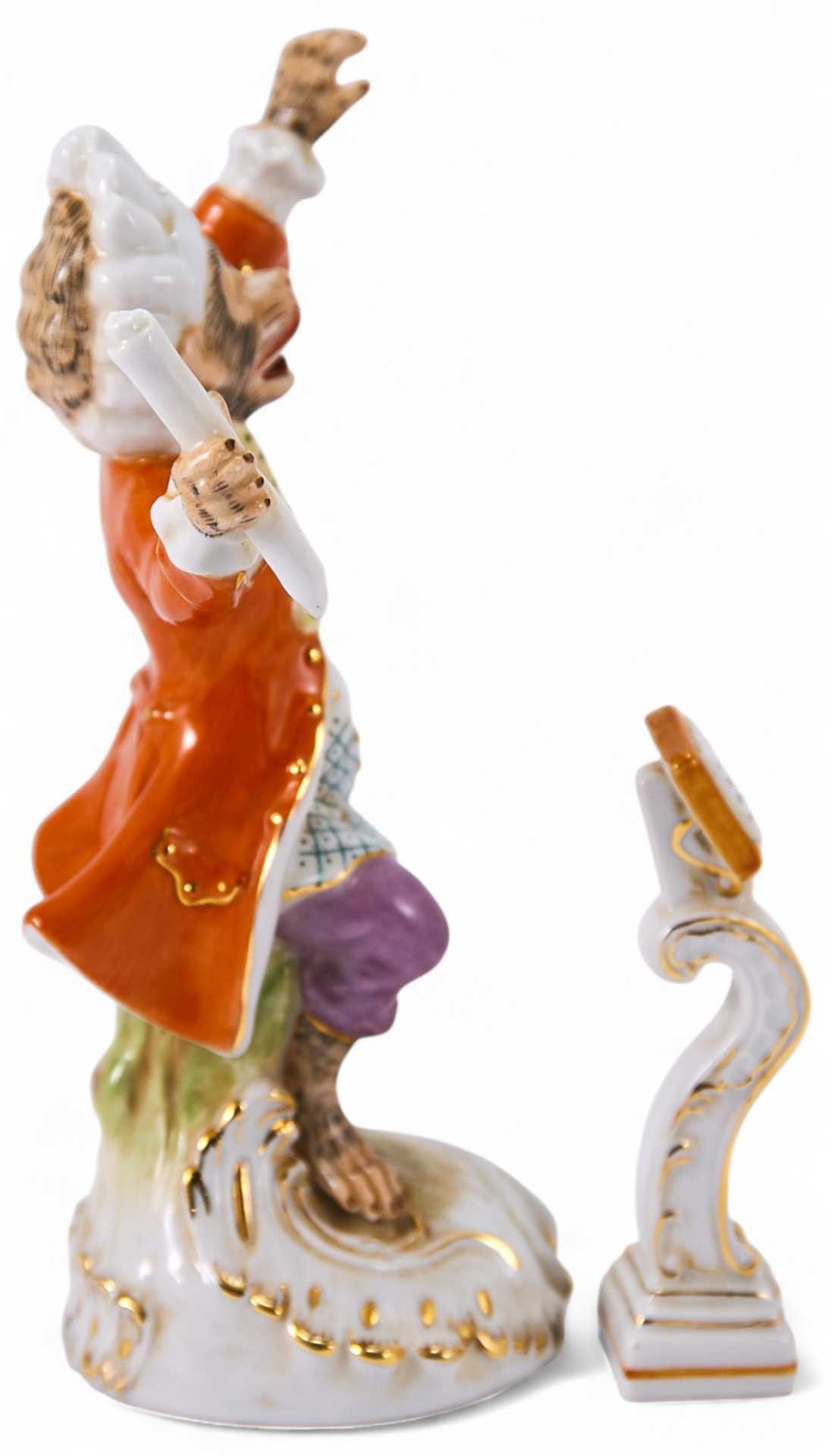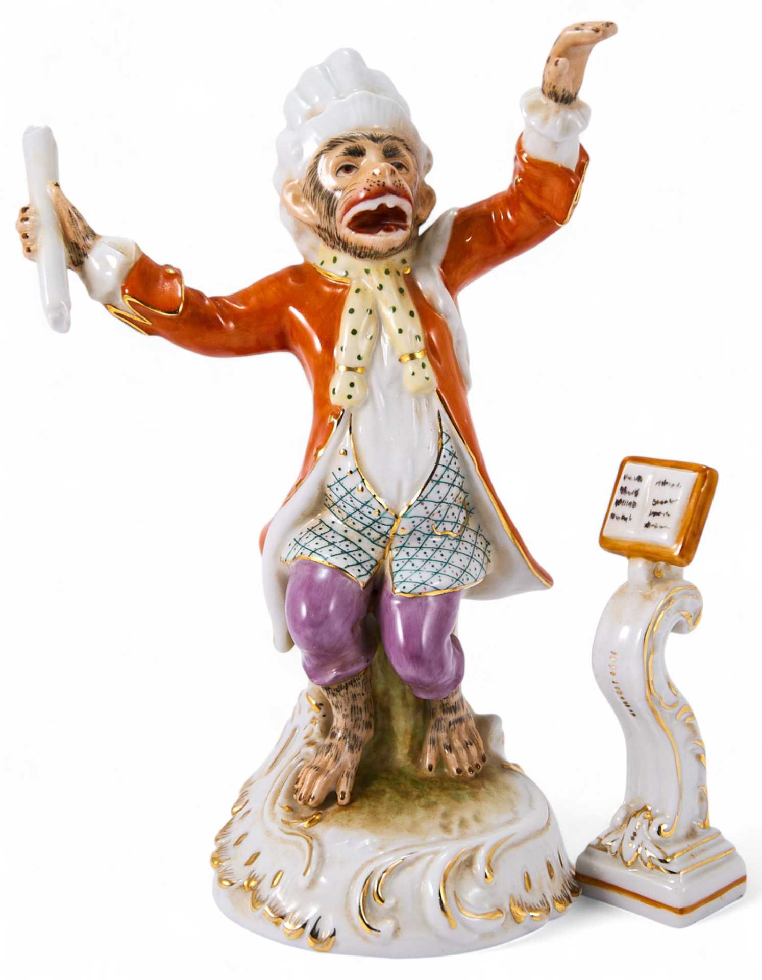 Скульптура мартышки, одетой в костюм и парик по моде ХѴПІв. эта фигурка представляет ä. собой имитацию фигуры из набора известной серии скульптур производства Мейсенской фарфоровой мануфактуры Cf/ изображающей «обезьяний» оркестр. Скульптура представляет собой пример имитации мелкой пластики Мейсена начала ХХв. довольно популярной в Европе.