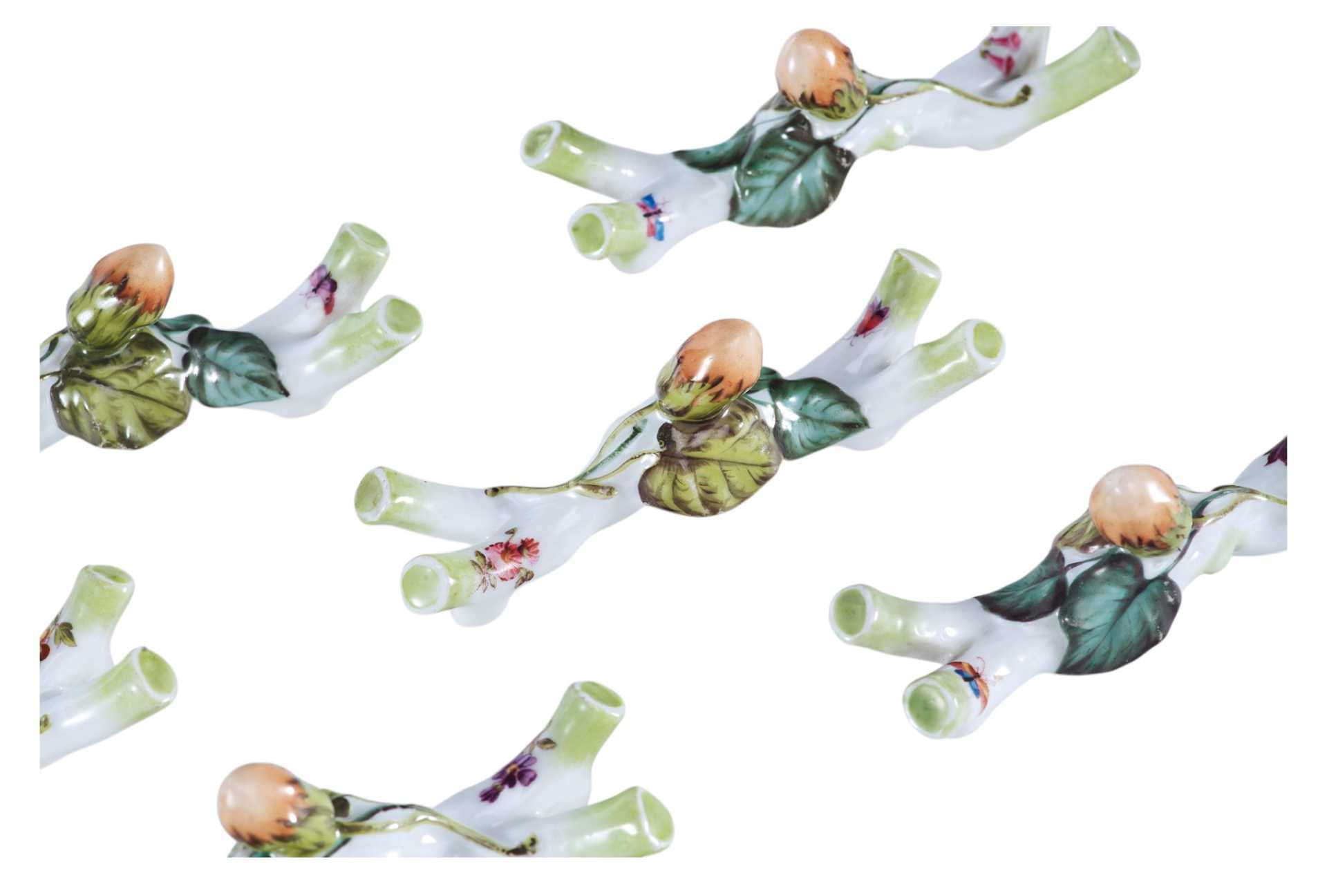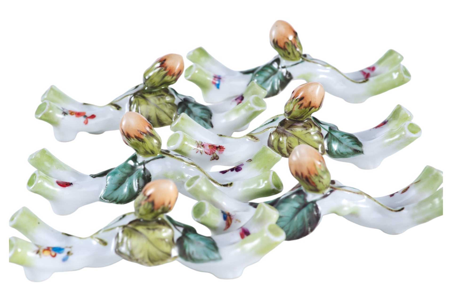 Набор порт-куто подставок для столовых приборов в количестве 6 штук. Каждая подставка выполнена в виде перекрещивающихся ветвей орешника, с одним объемным орехом на них.