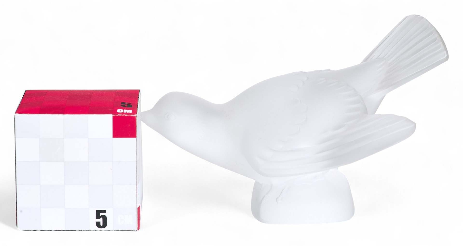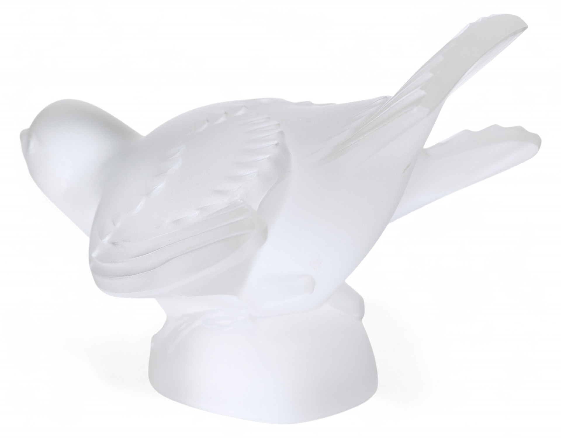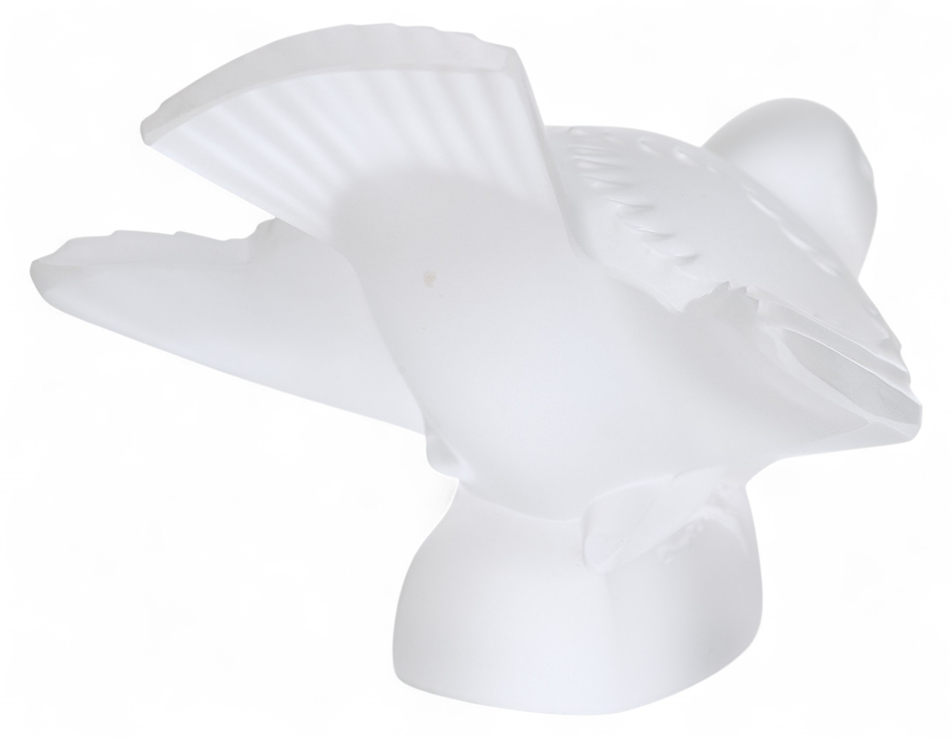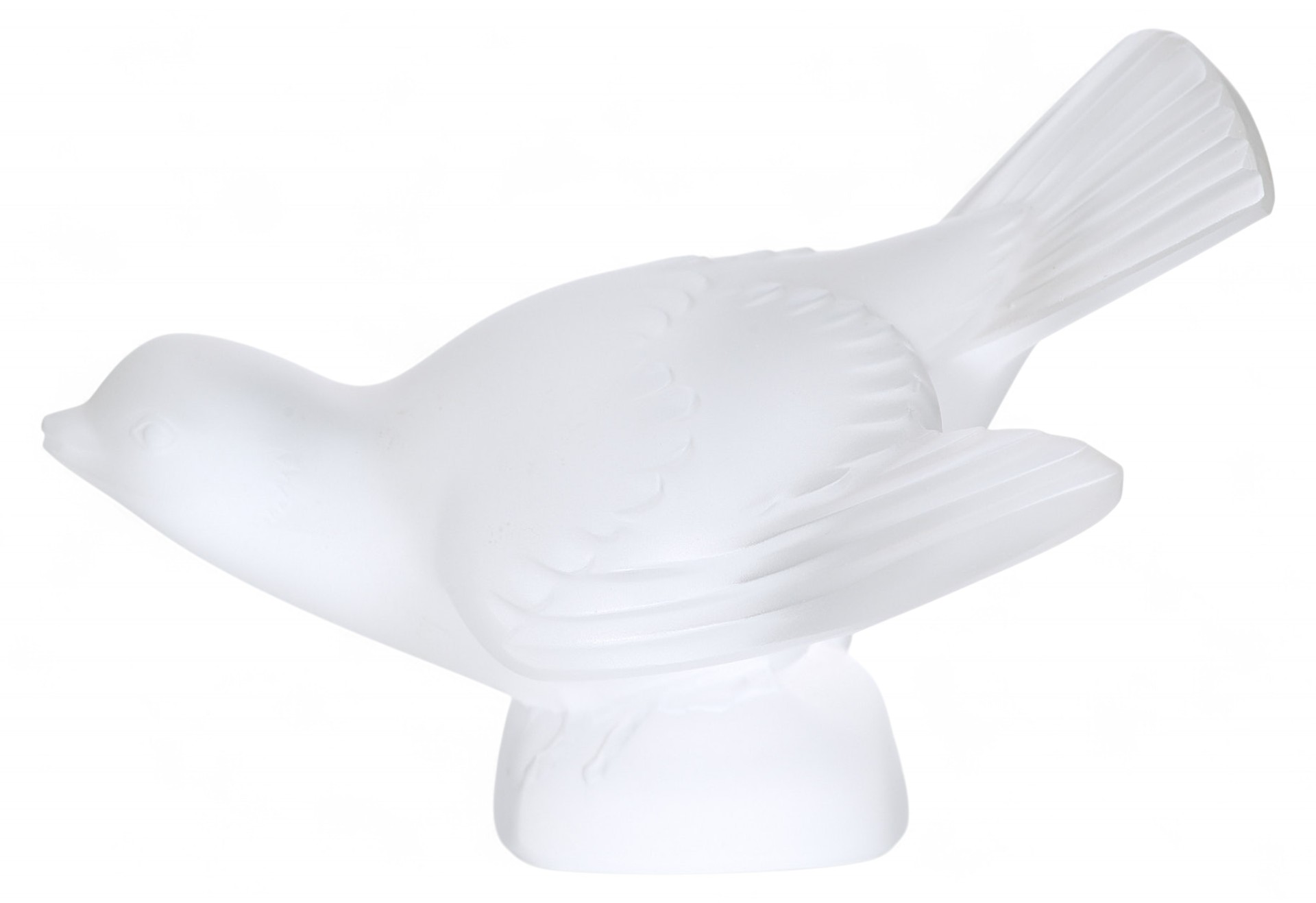 На подставке голубь, вытянувший шею и слегка наклонившийся. На основании подпись курсивом: “Lalique France”.