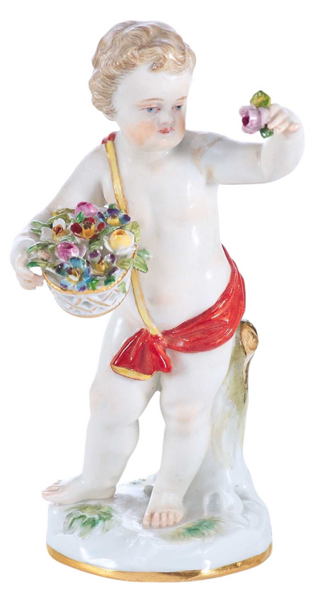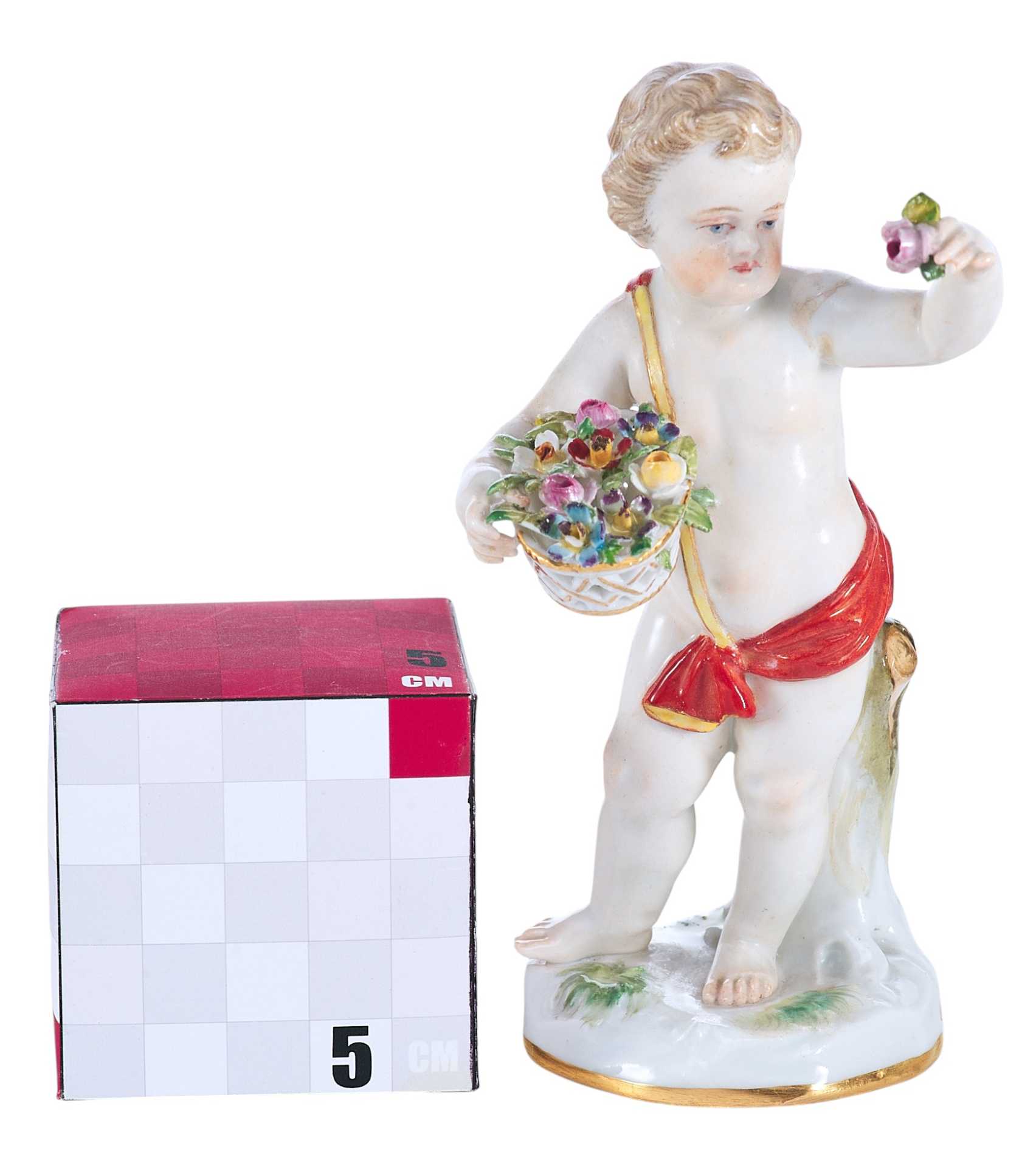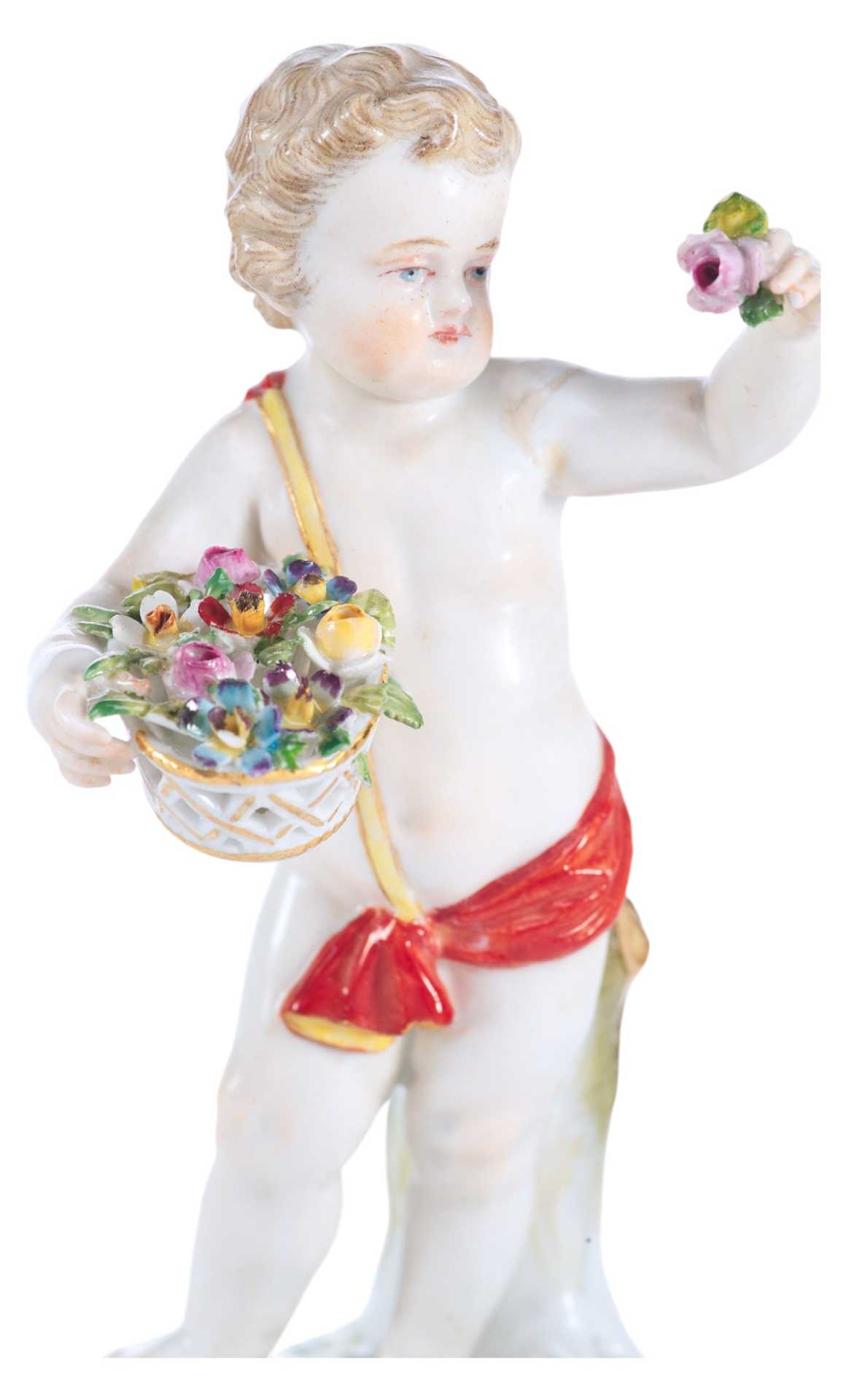 Фарфоровая скульптура маленького путтн с корзинкой цветов, прижатой к груди в одной руке и с цветком в другой руке.