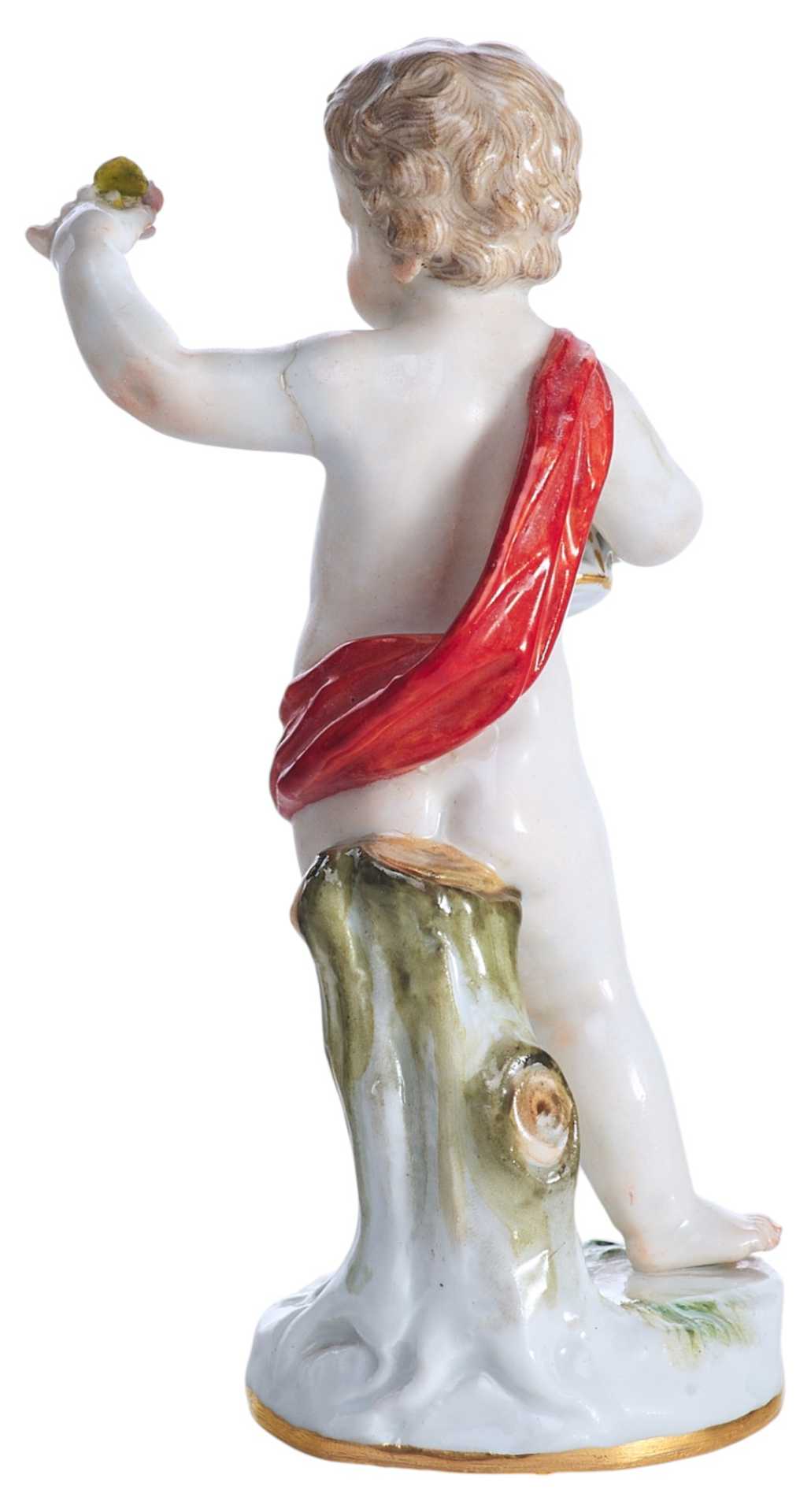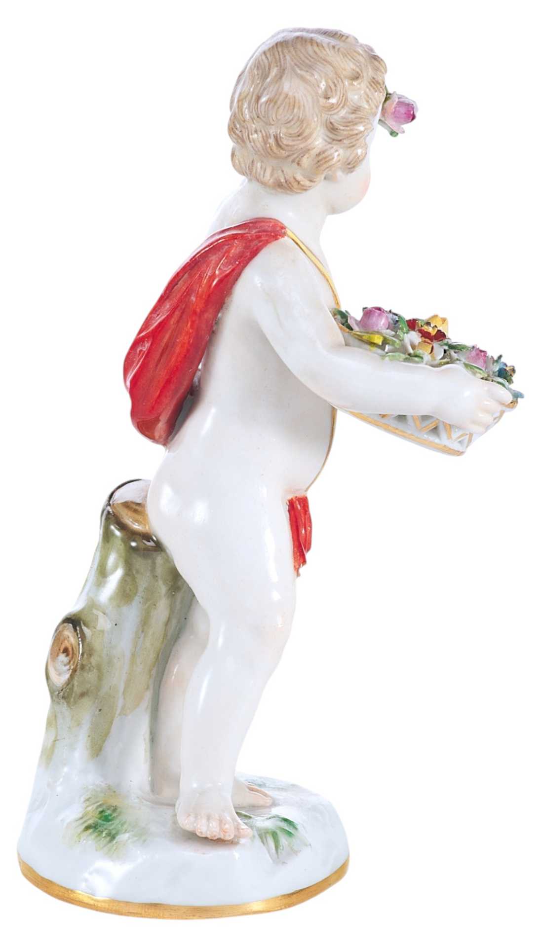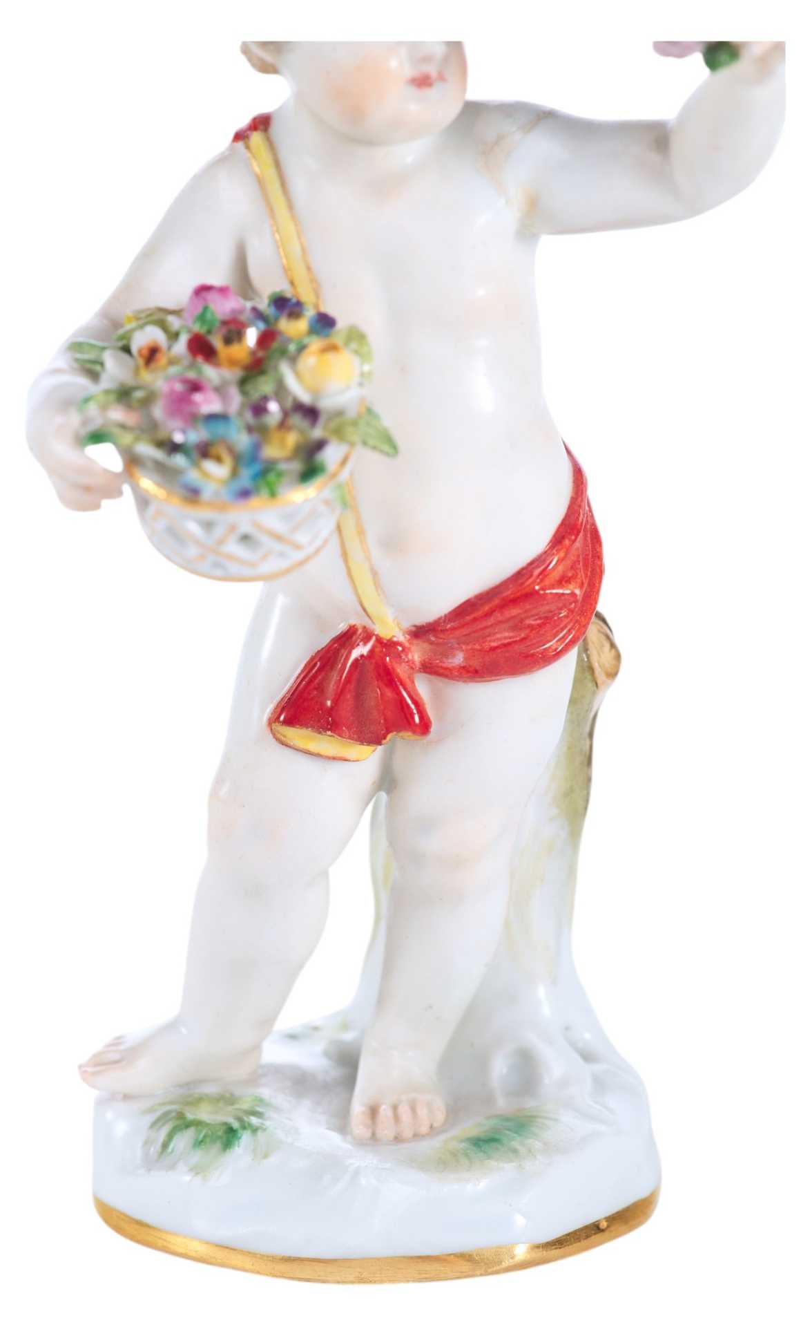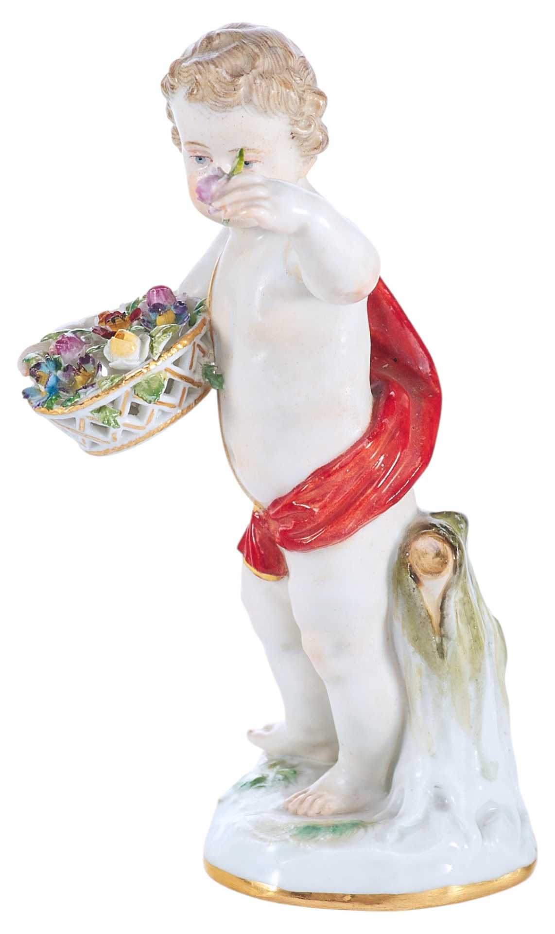 Фарфоровая скульптура маленького путтн с корзинкой цветов, прижатой к груди в одной руке и с цветком в другой руке.