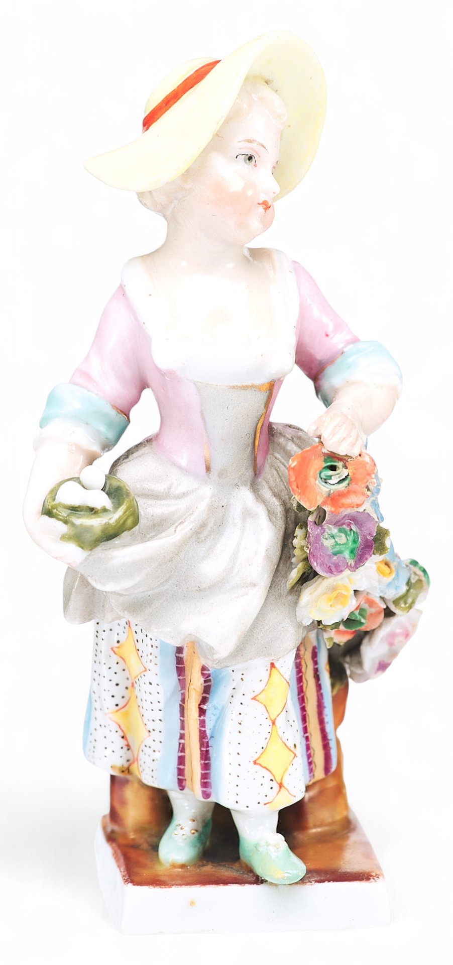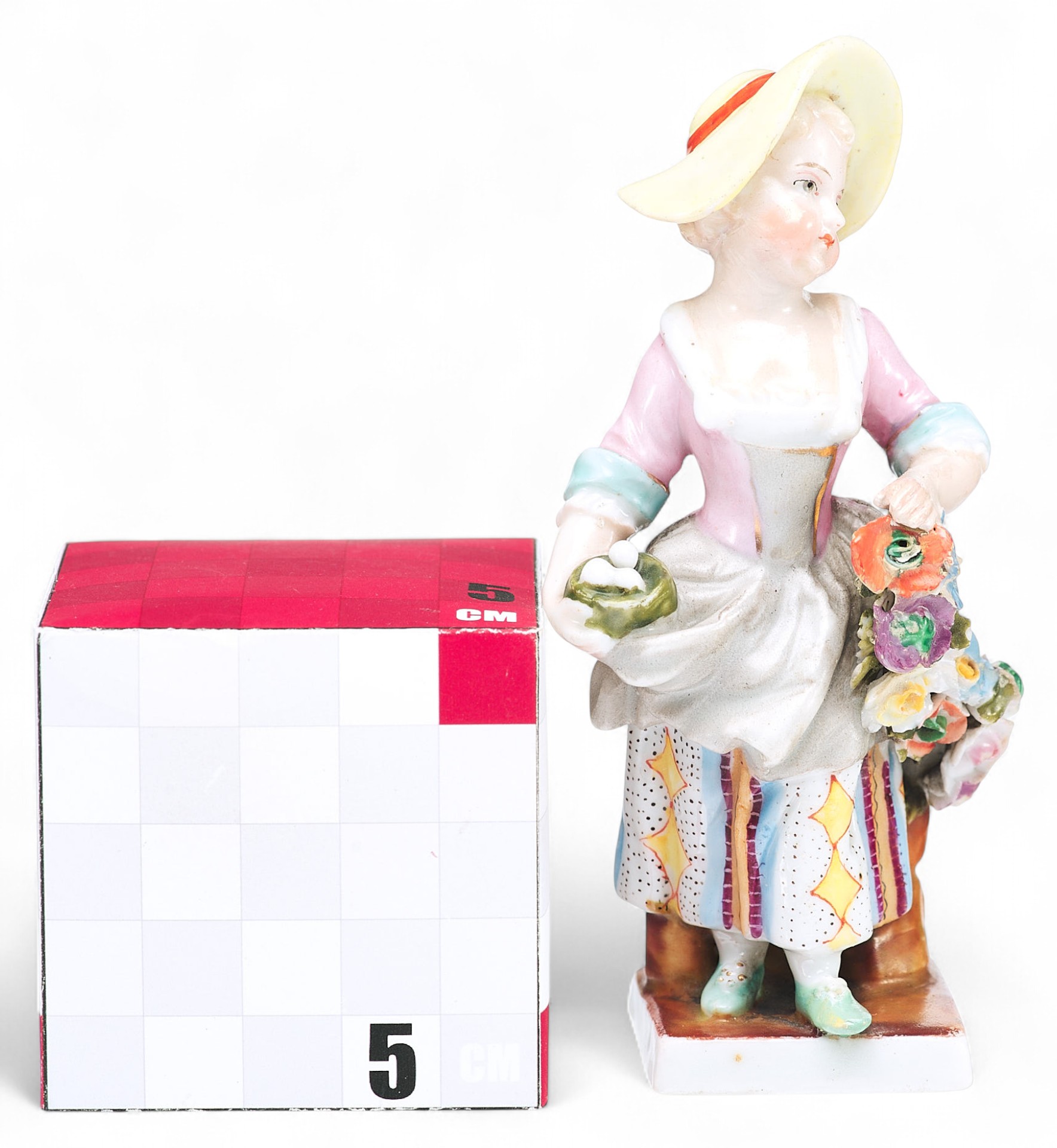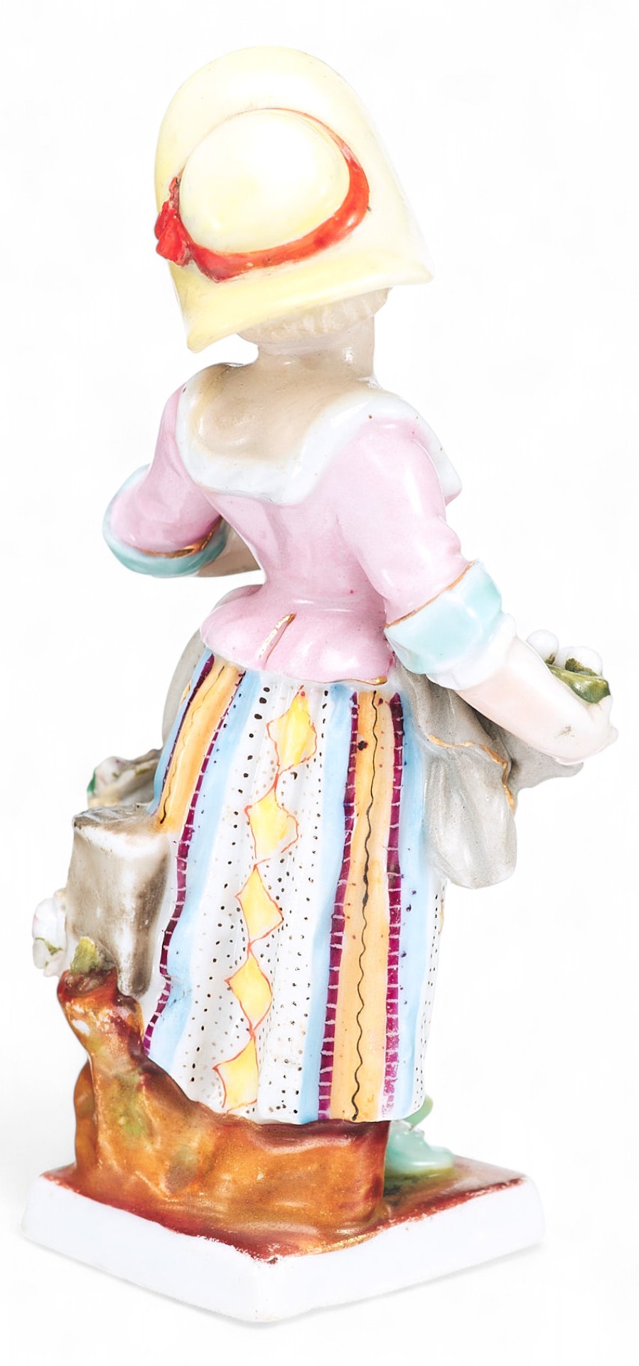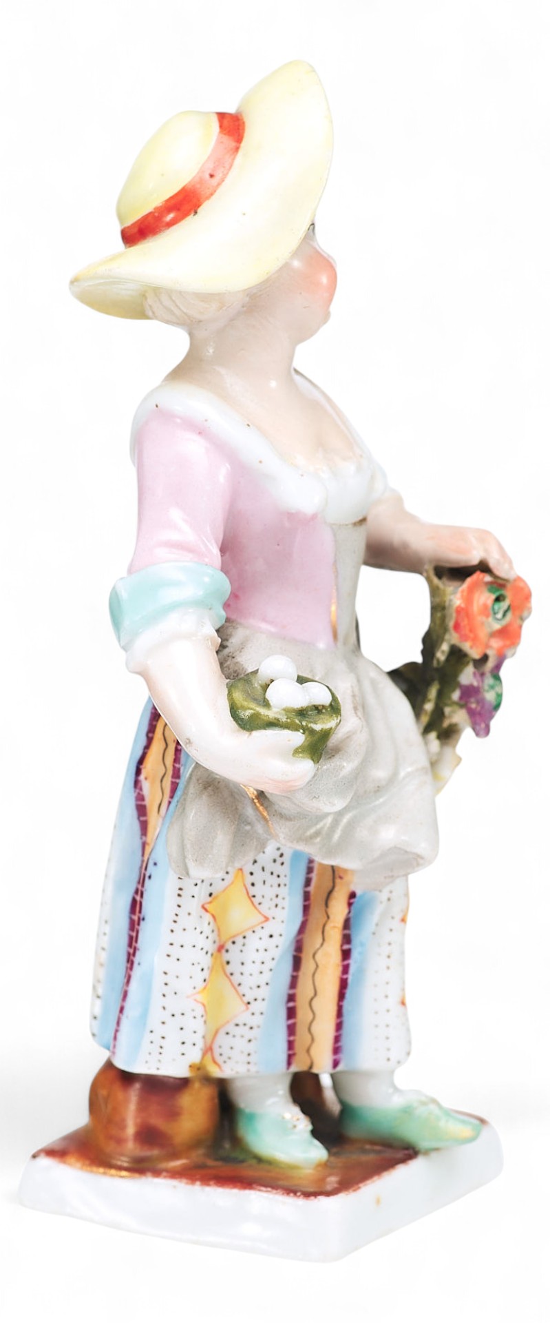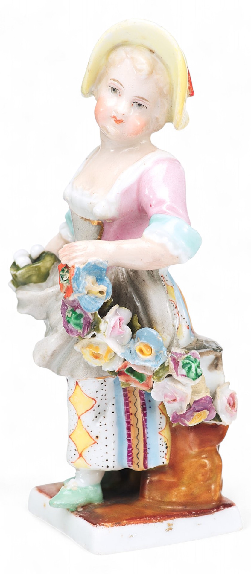 Представленная миниатюрная скульптурная композиция выполнена в жанре пасторали на умиротворенный сельский сюжет. Юная румяная девушка в шляпке и цветастом платье несет в одной руке птичье гнездышко, а другой придерживает длинную цветочную гирлянду.