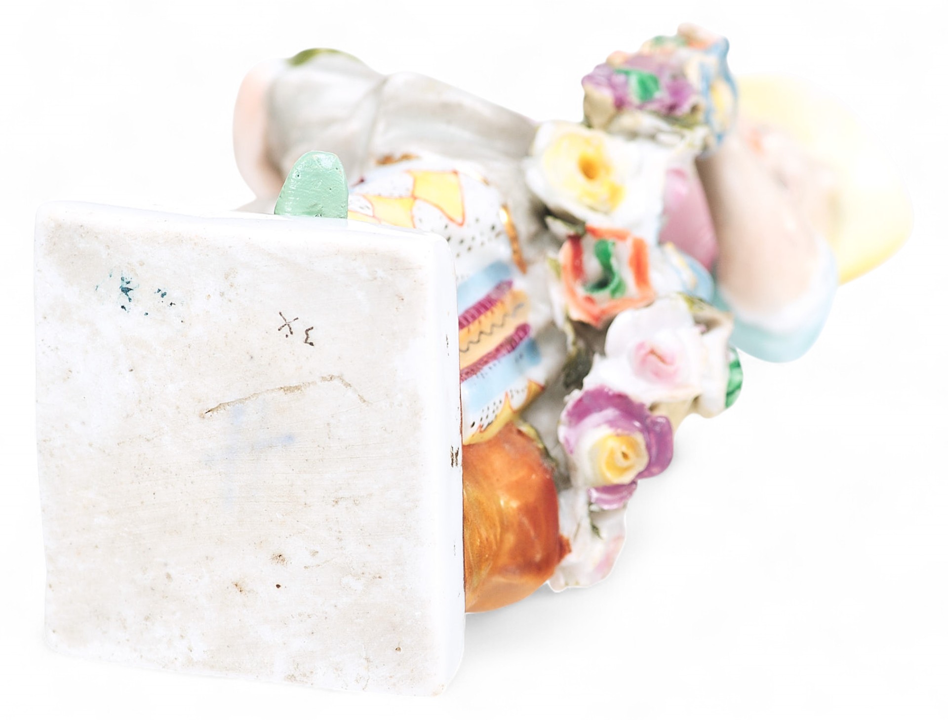 Жанр пасторали поэтизировал мирную и простую сельскую жизнь, и был схож с лиричными принципами галантных сцен, изображающих идеально-красивых людей в обстановке абсолютного, безмятежного счастья и гармонии. Композиция выполнена на хорошем техническом уровне. Статуэтка подвергалась небольшой реставрации. На дне композиции присутствуют следы от фабричных марок, не идентифицируются. В одном из них узнаются две скрещенных линии, напоминающих стандартное клеймо фабрики Мейсен: в XIX -начале XX в. многие небольшие европейские мануфактуры