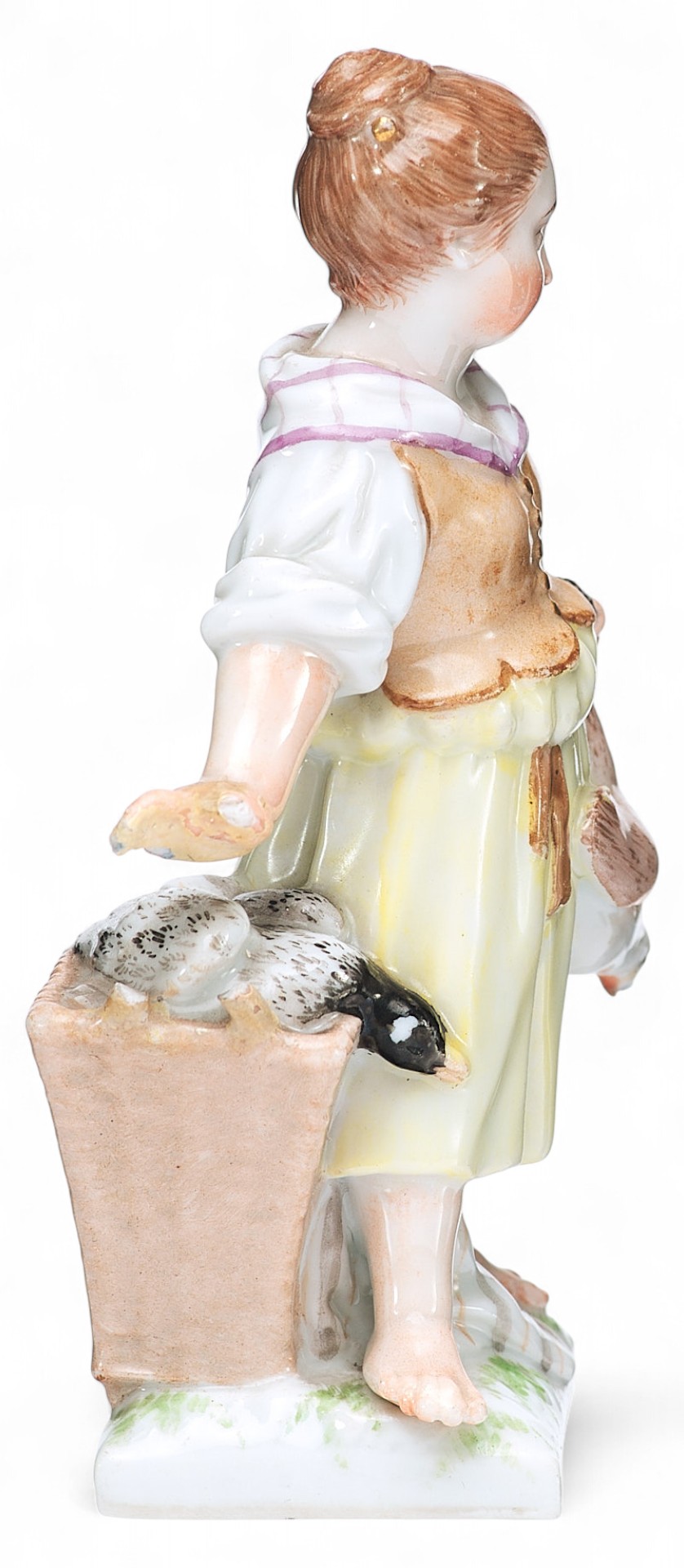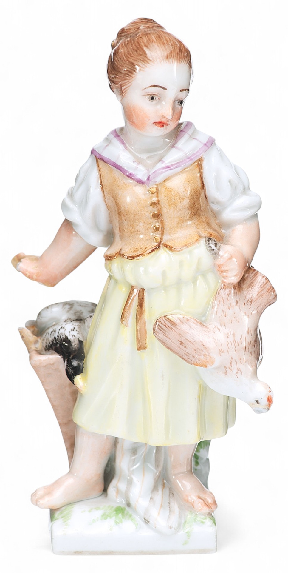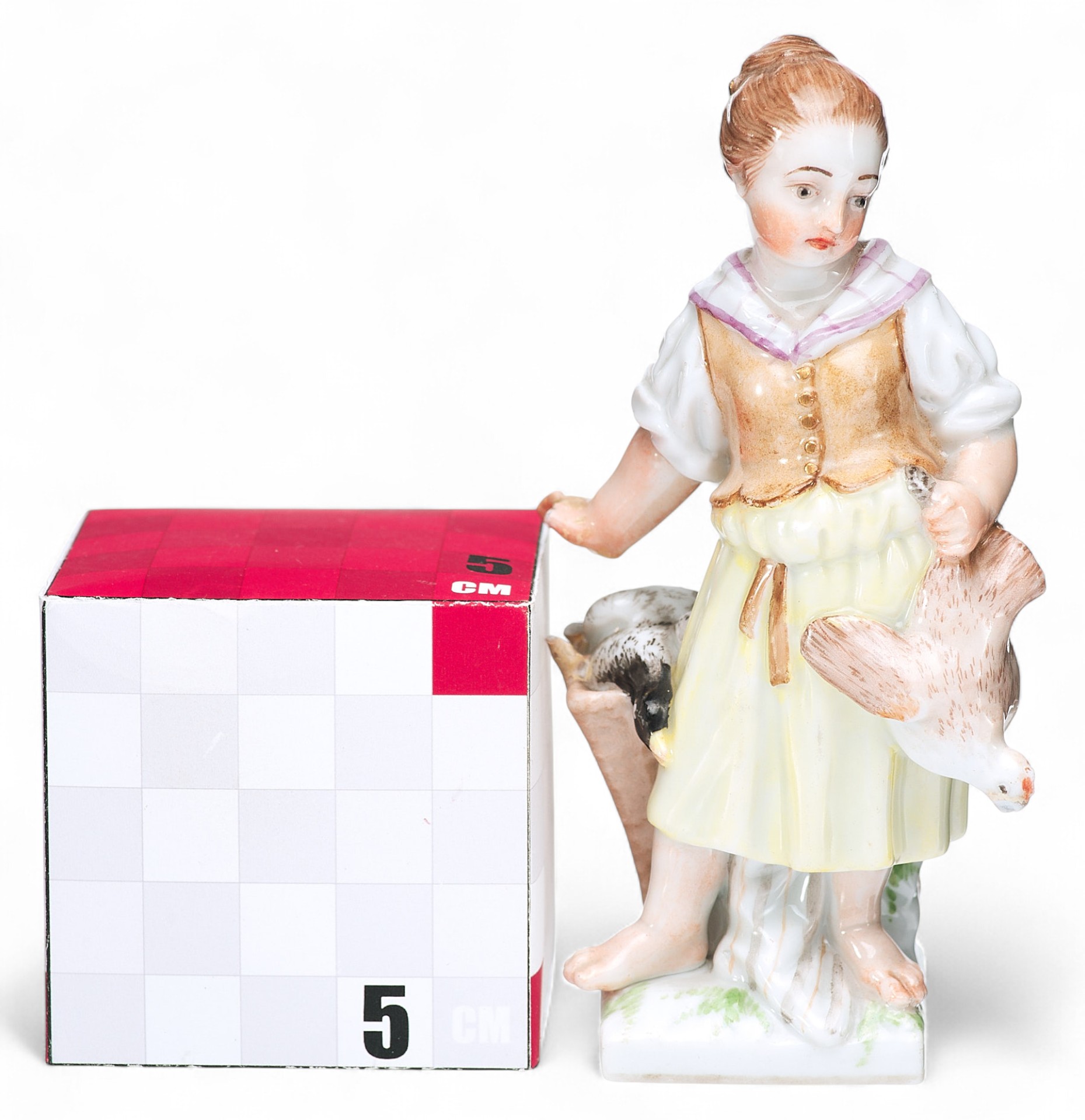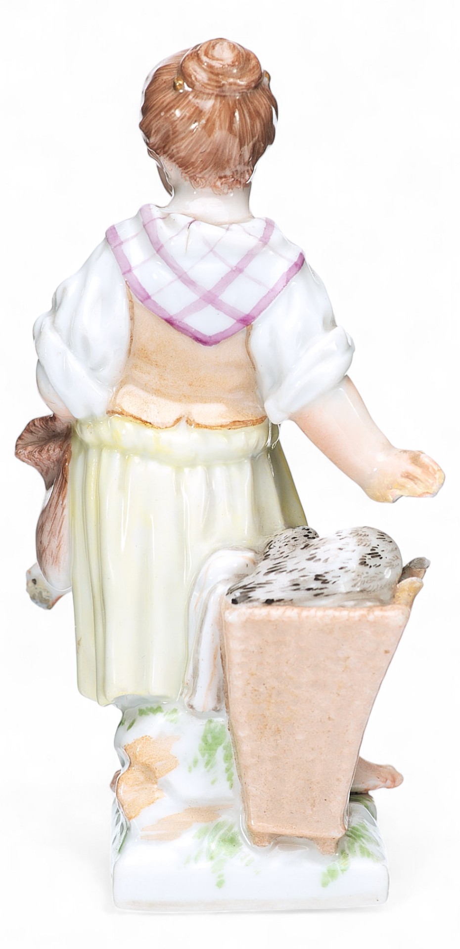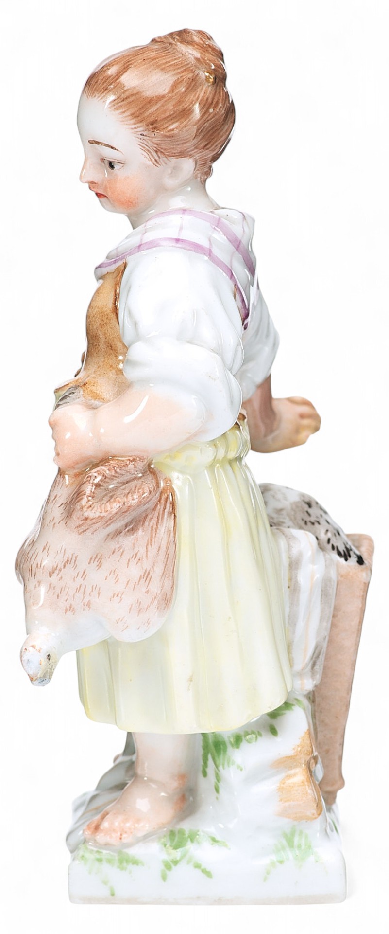 Представленная миниатюрная композиция выполнена в жанре пасторали и изображает юную девушку в простом сельском наряде, с домашними птицами. Сюжет прост, лиричен и сентиментален. Жанр пасторали поэтизировал мирную и простую сельскую жизнь, и был схож с принципами галантных сцен, изображающих идеально красивых людей в обстановке абсолютного, безмятежного счастья и гармонии. Технически статуэтка выполнена на хорошем уровне, подвергалась небольшой реставрации.