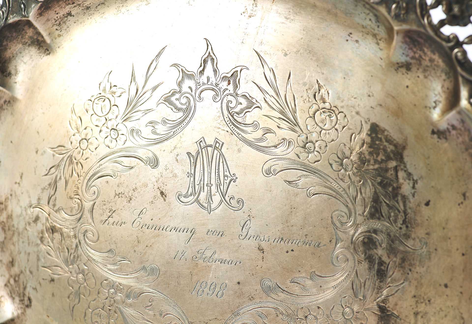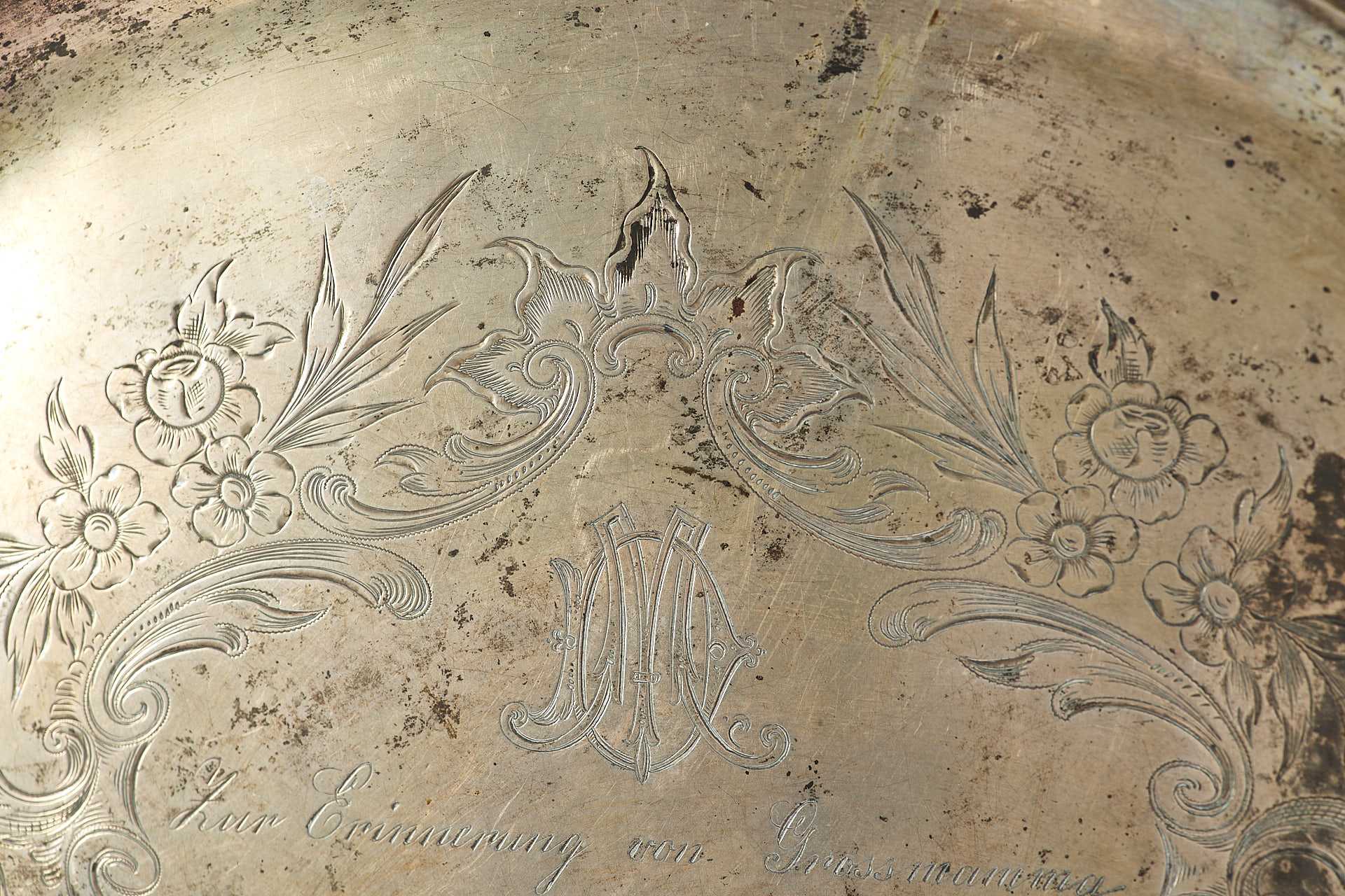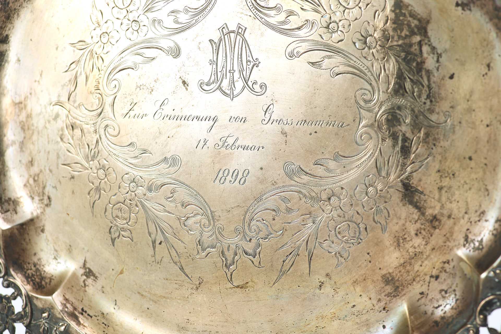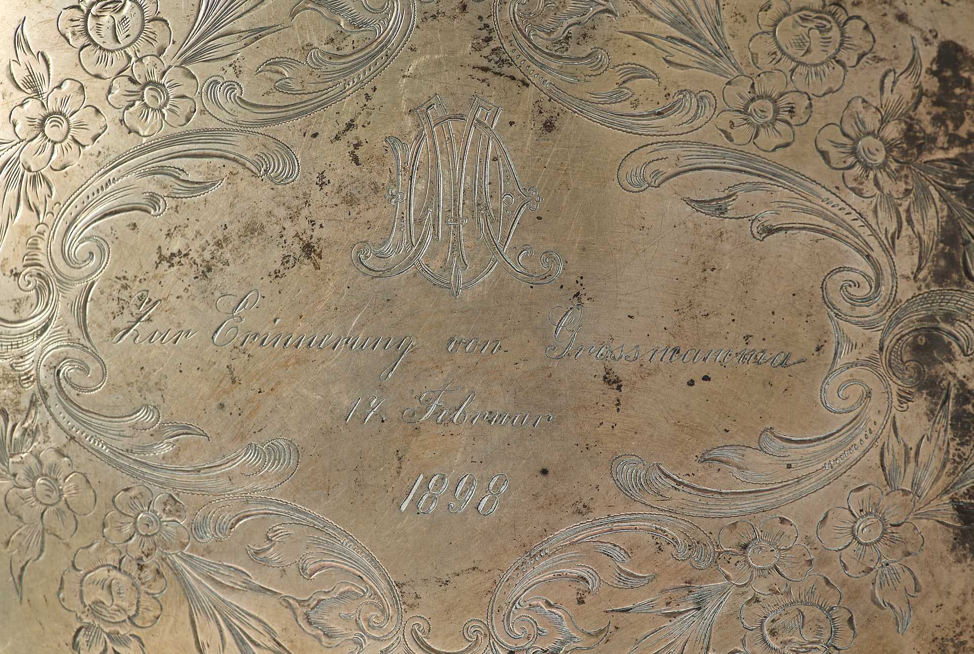 В центре поля выгравирован ажурный орнаментальный картуш с цветами и листьями. Внутри него дарственная надпись: «Zur Erinerung von Grossmamma 17 Februar 1898». Над надписью владельческая монограмма: «МО».
